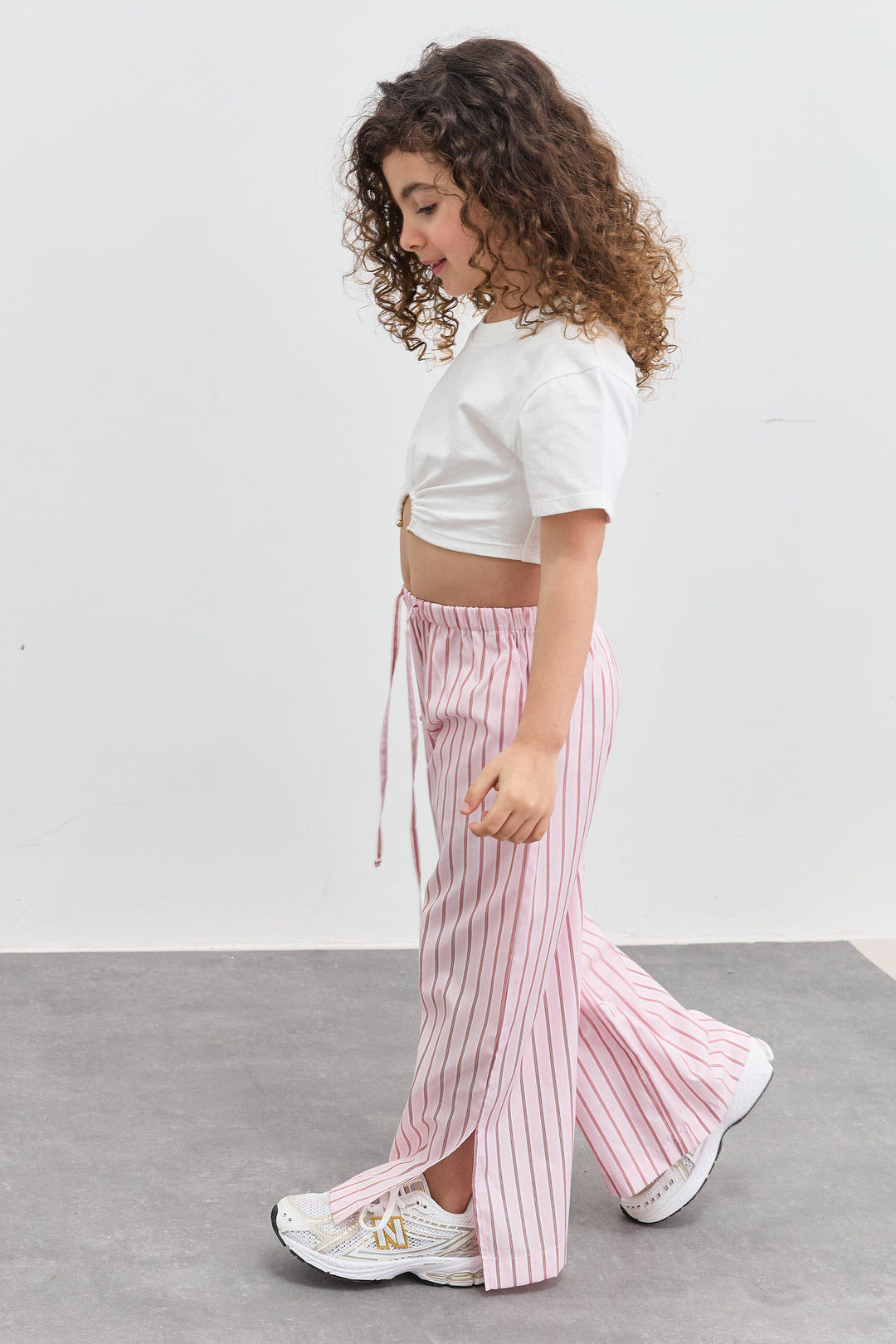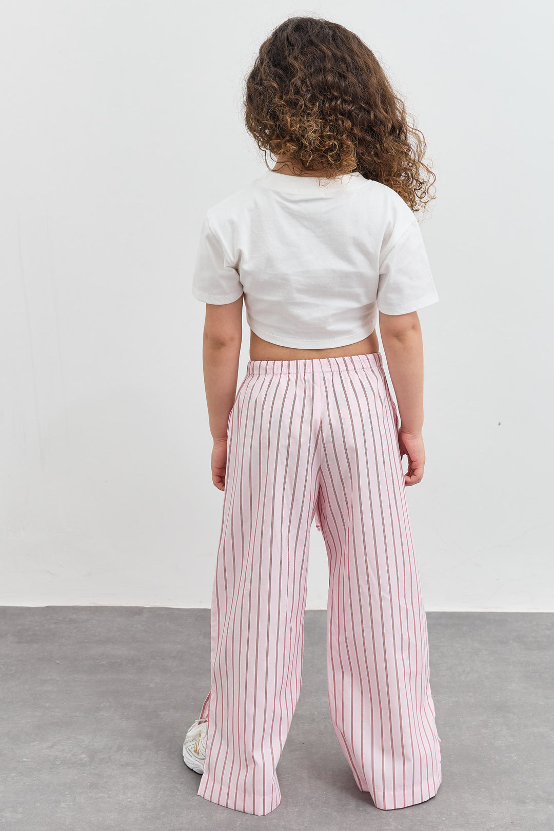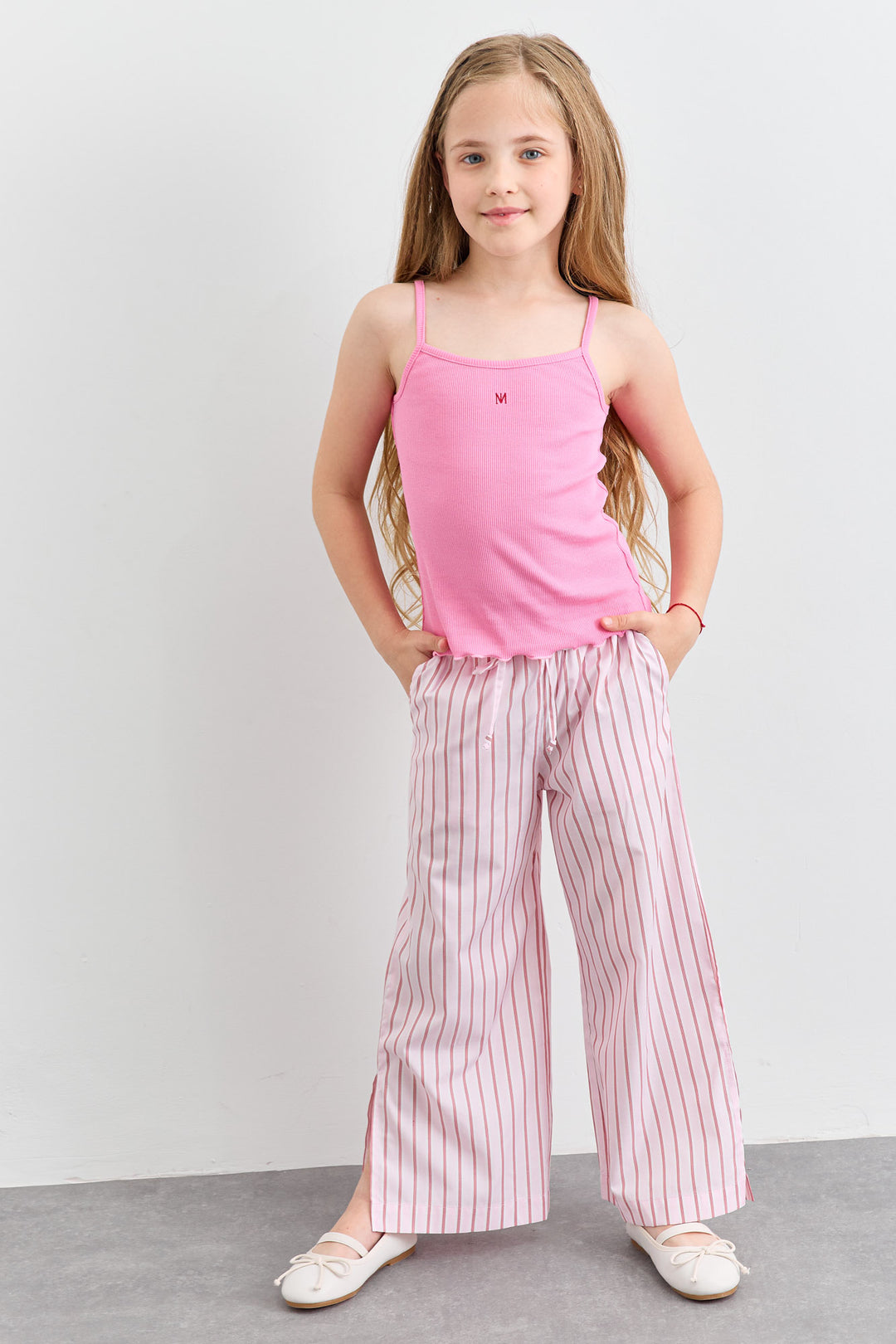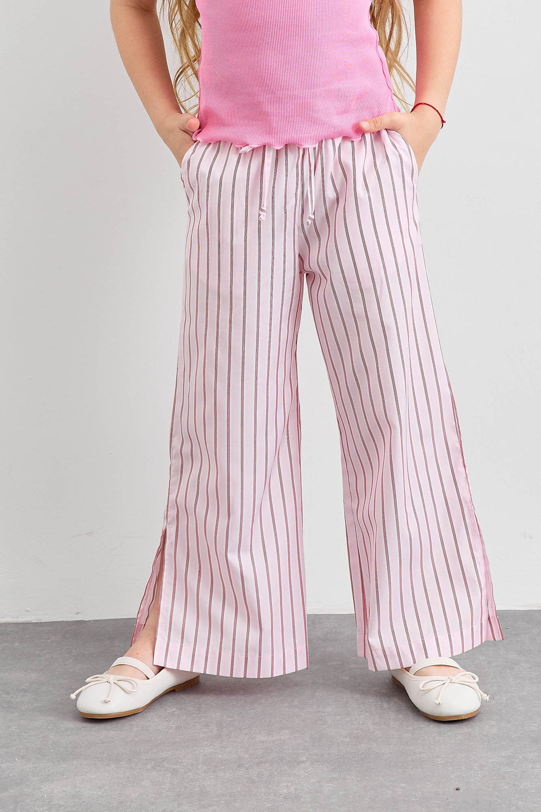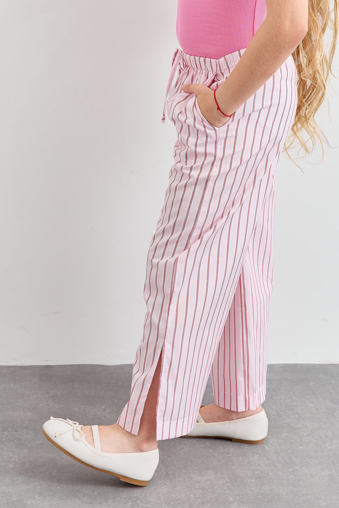 מכנס כותנה בגזרת וויד לג בהדפס פסים עם שסע | ורוד