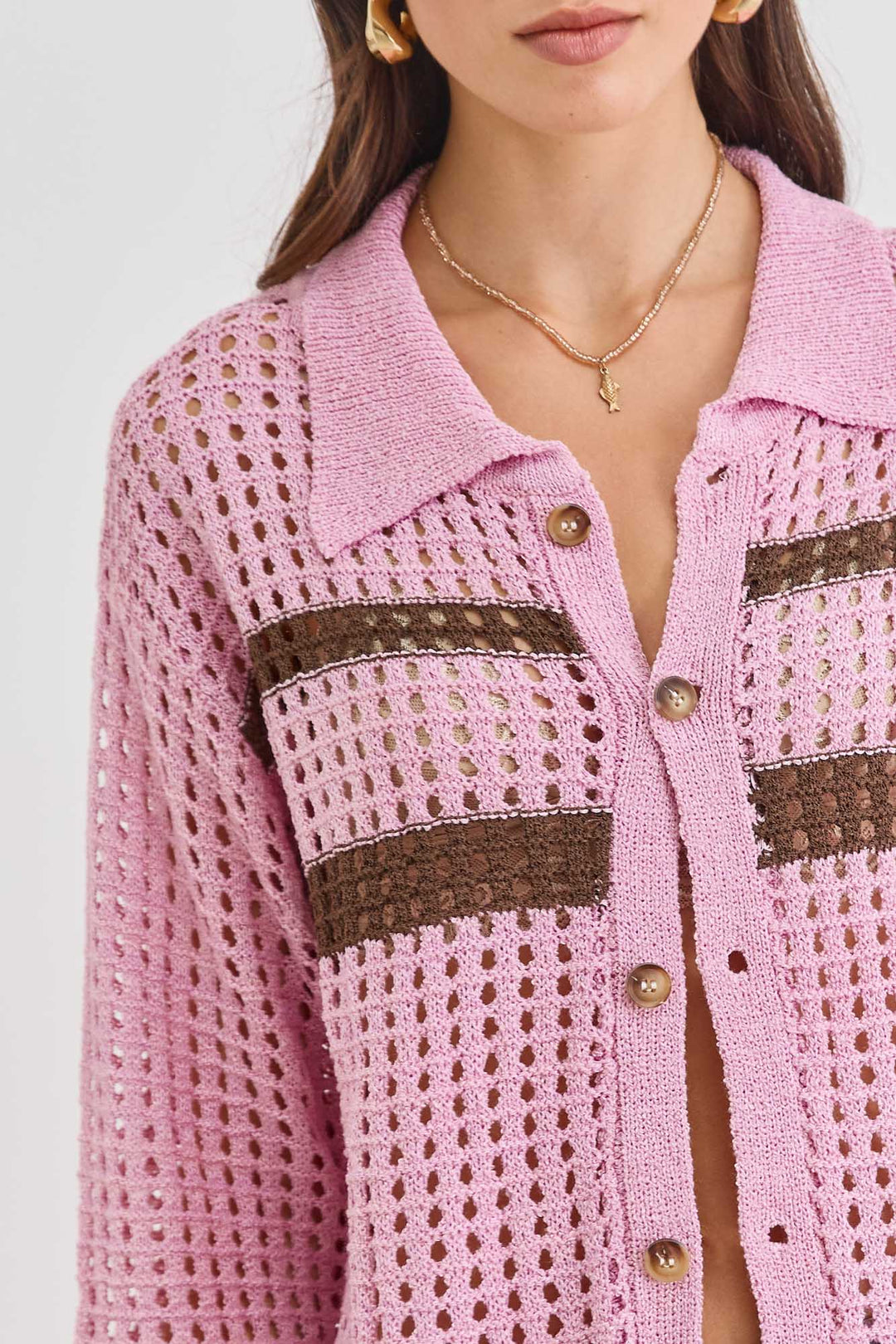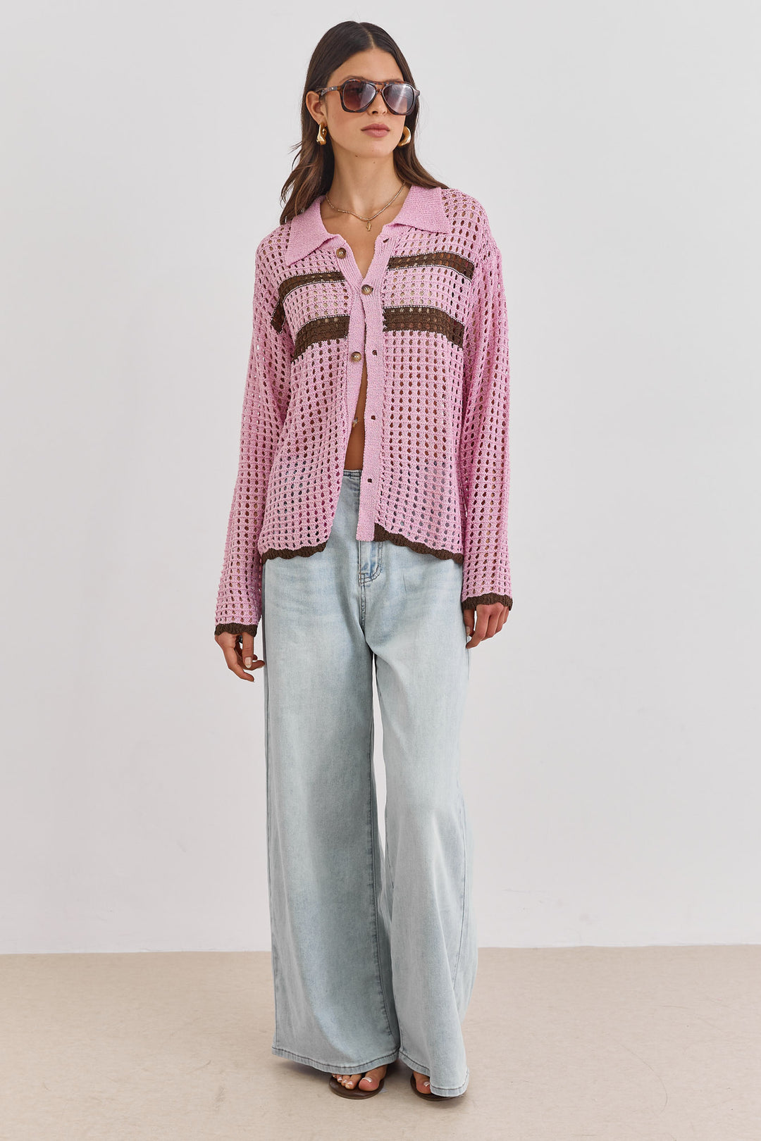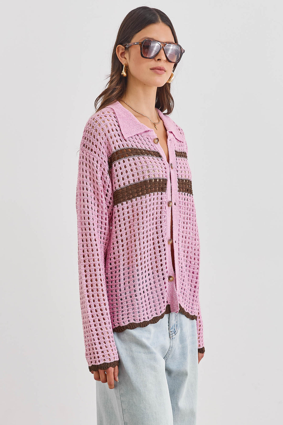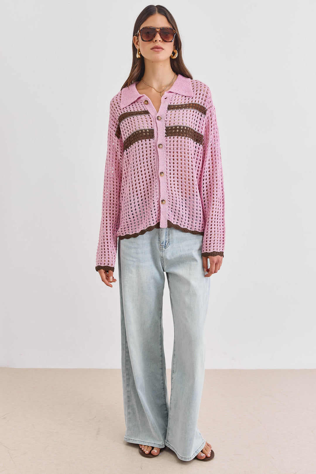 חולצת כפתורים אריאל בד סריג מחורר | ורוד/חום