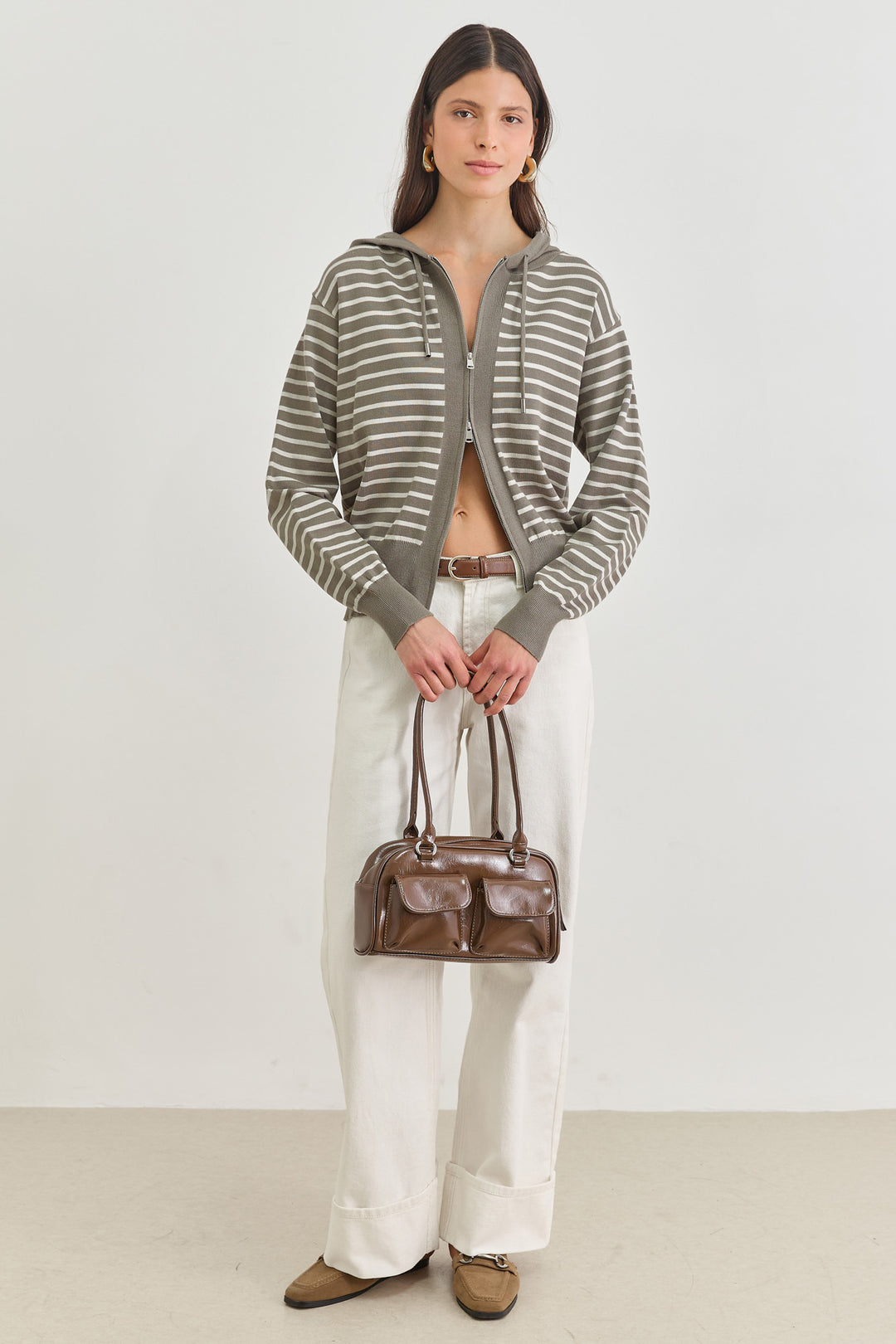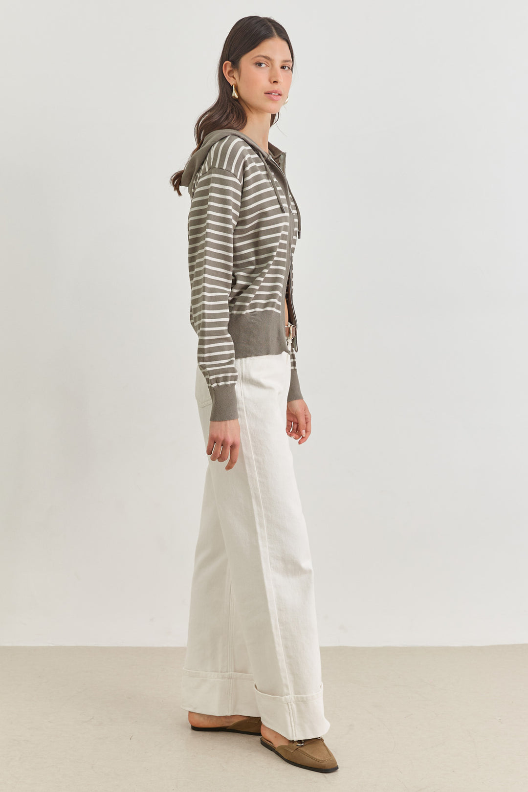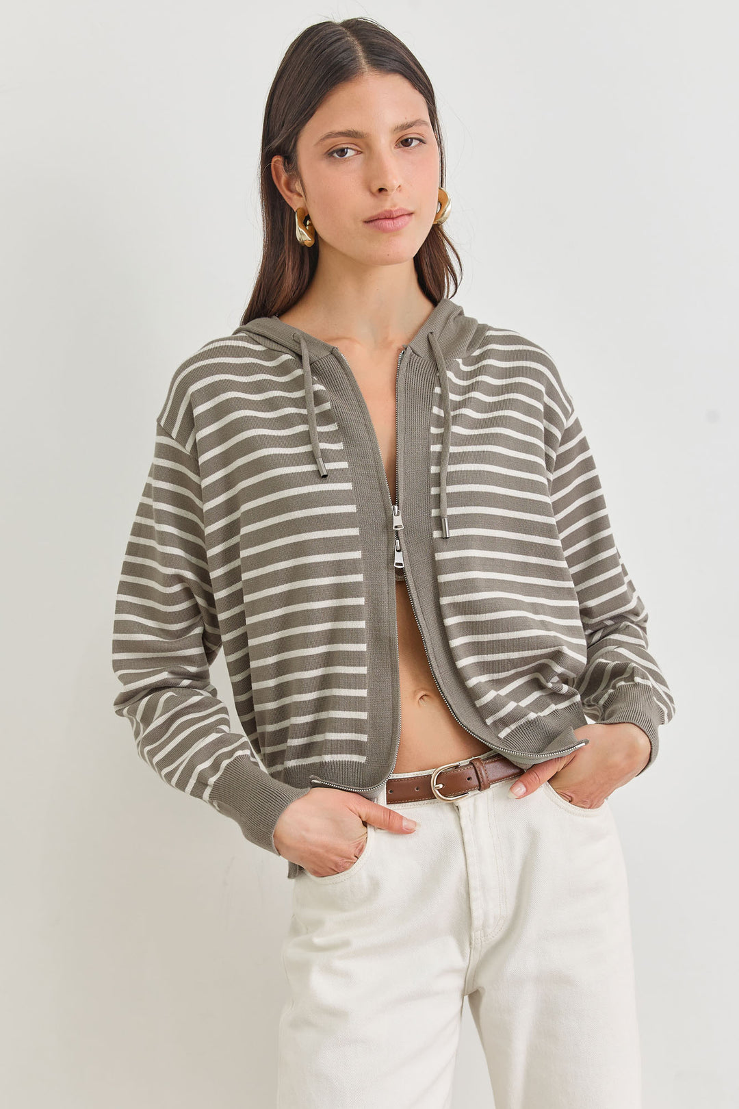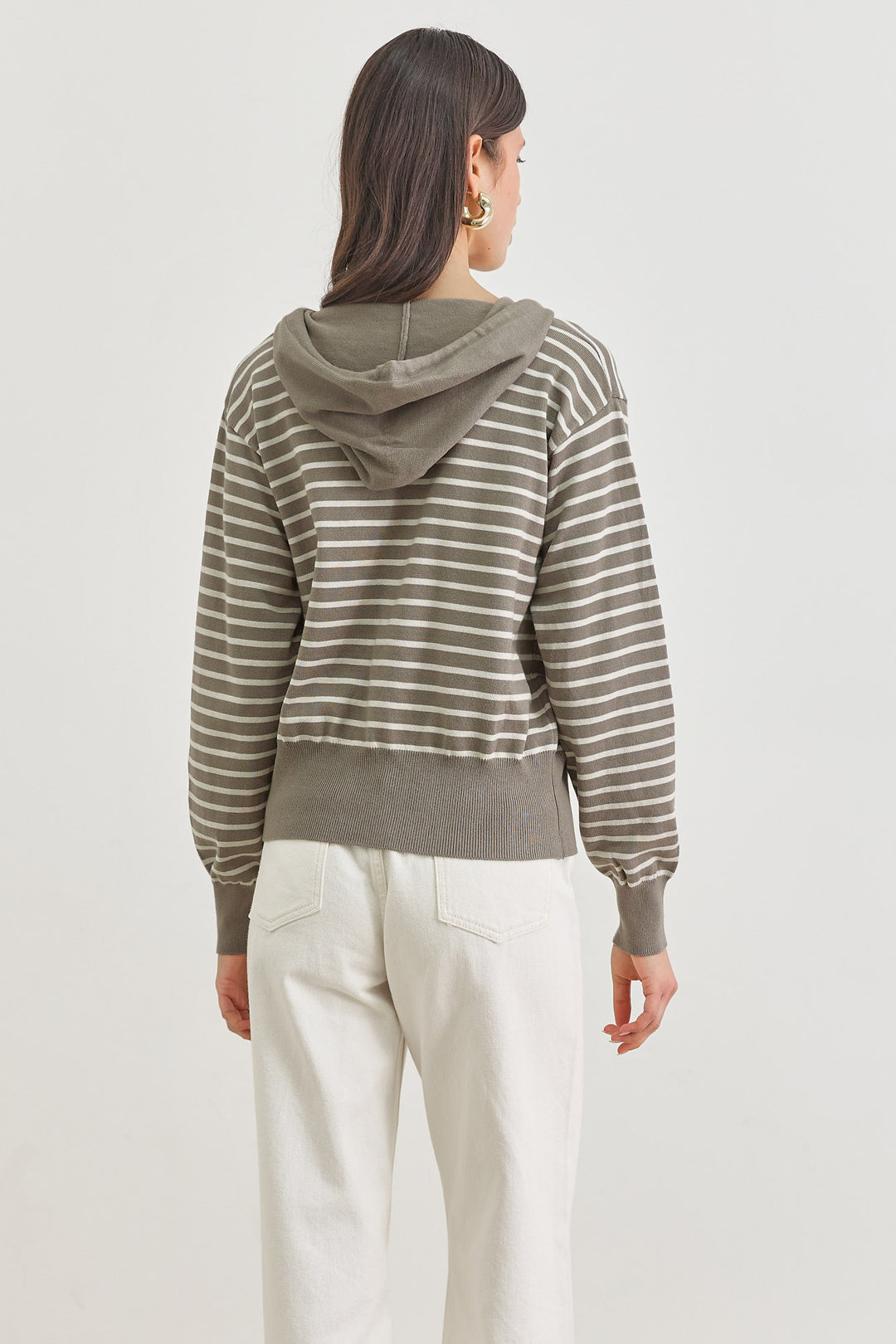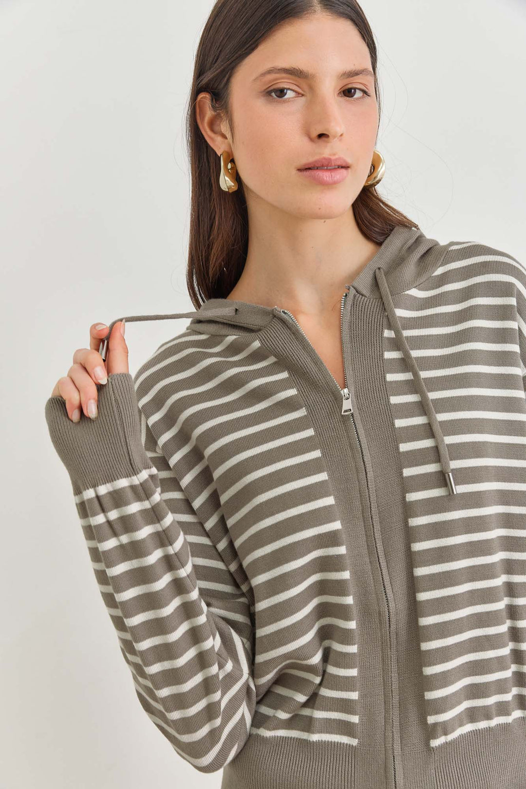 סוויטשירט סריג קפוצ'ון סטארק סטרייפס | ירוק זית/שמנת