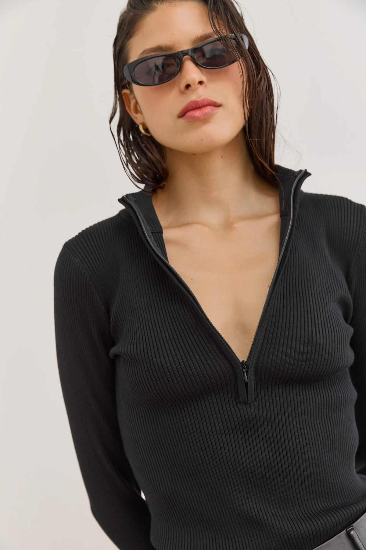 חולצה מבד סריג עם שרוולי כפפה משדרגים, ומחשוף מתכוונן באמצעות רוכסן קדמי.