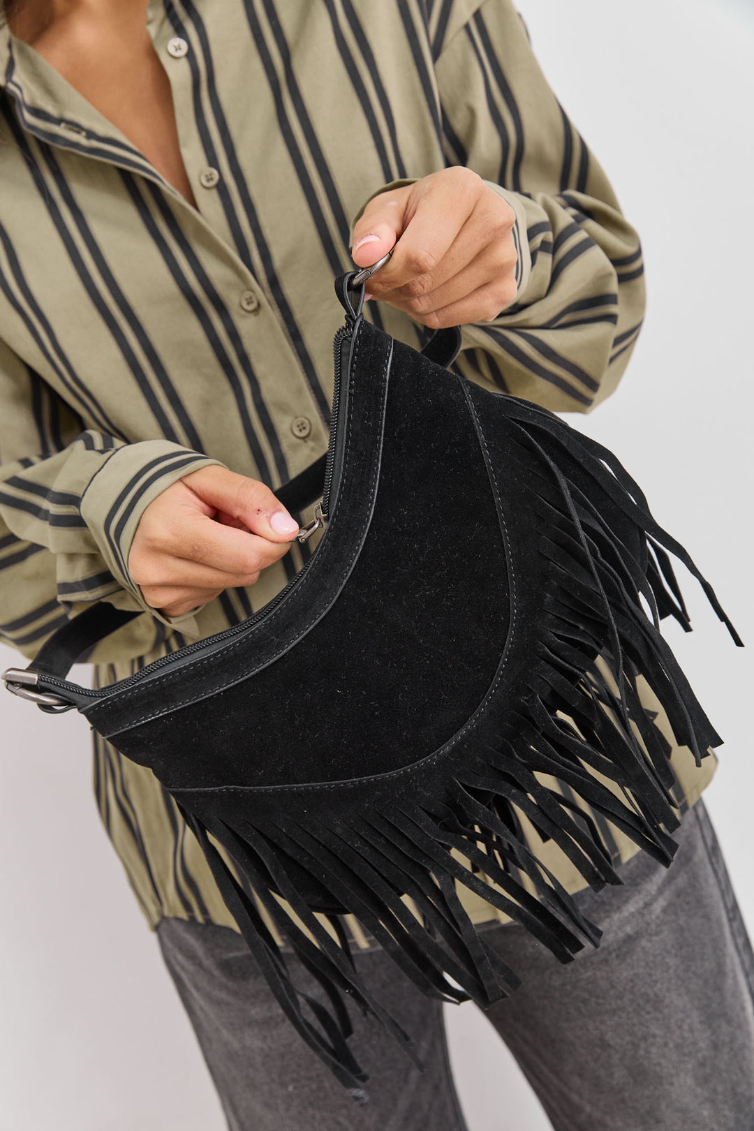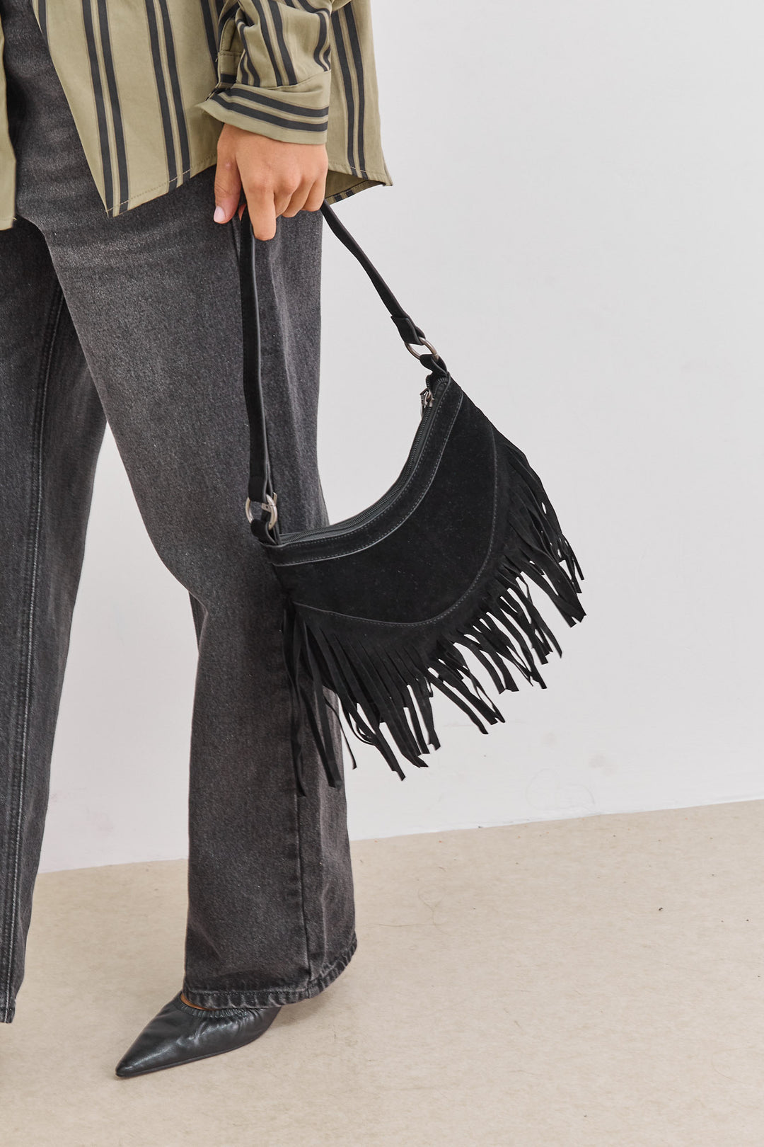 תיק זמש מייסי בשילוב פרנזים |שחור