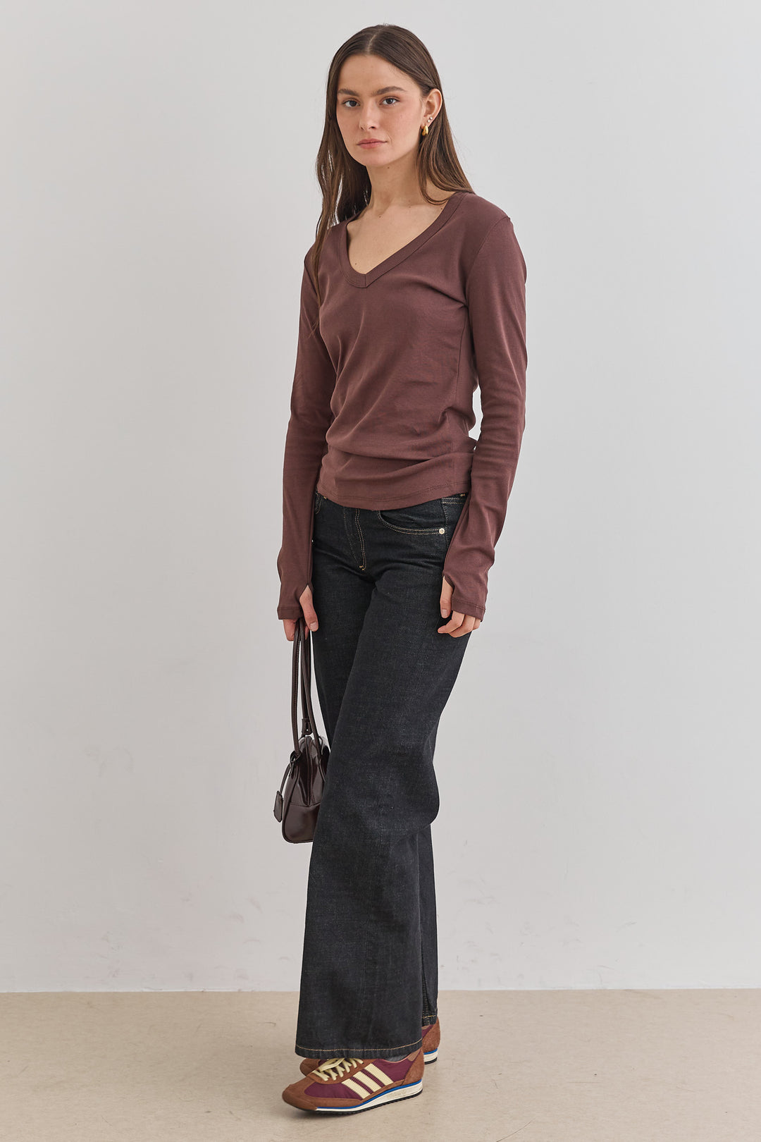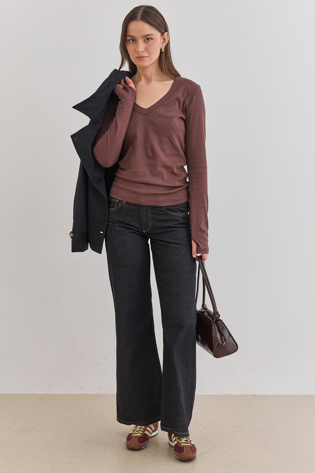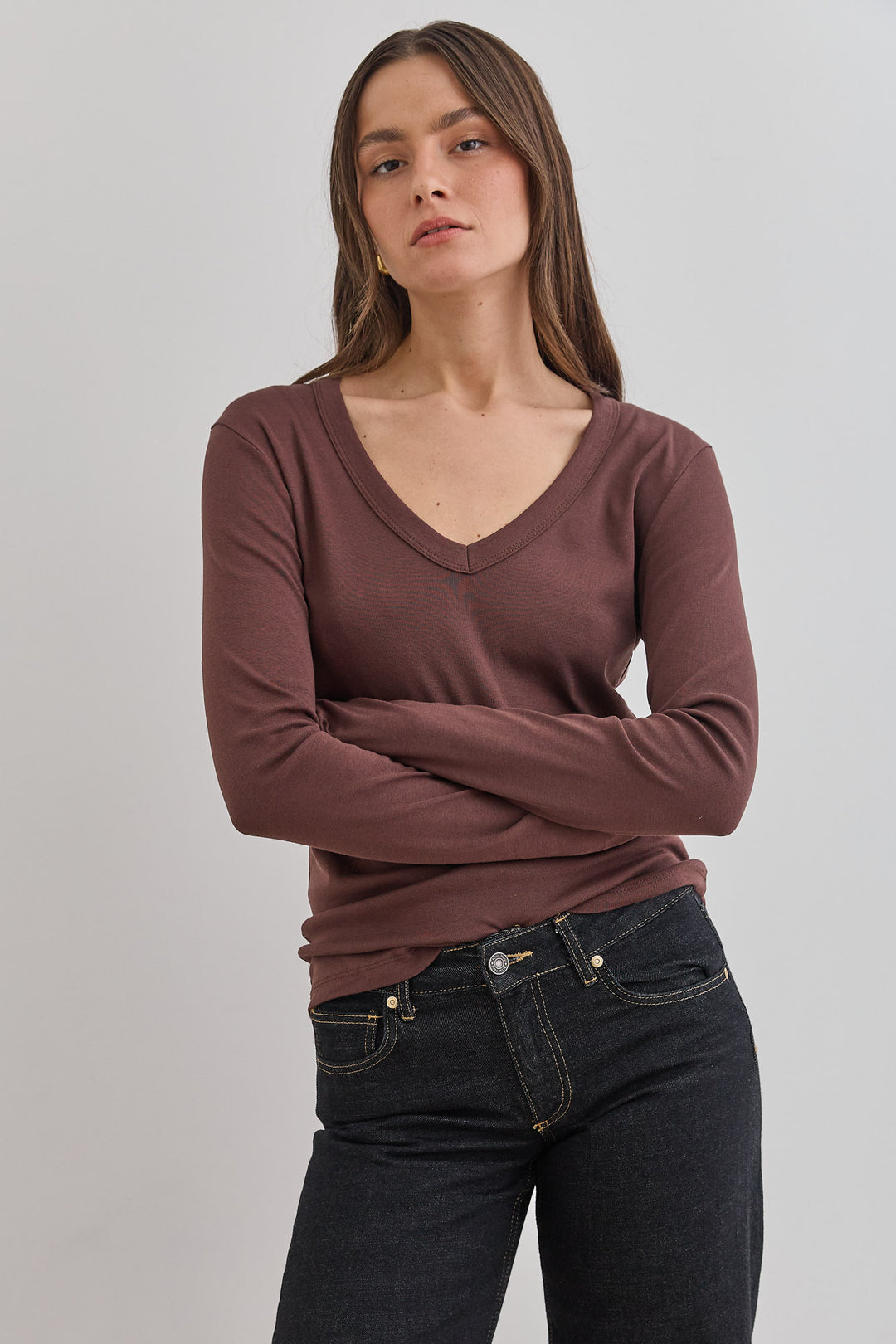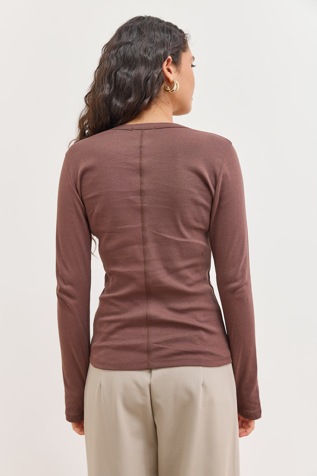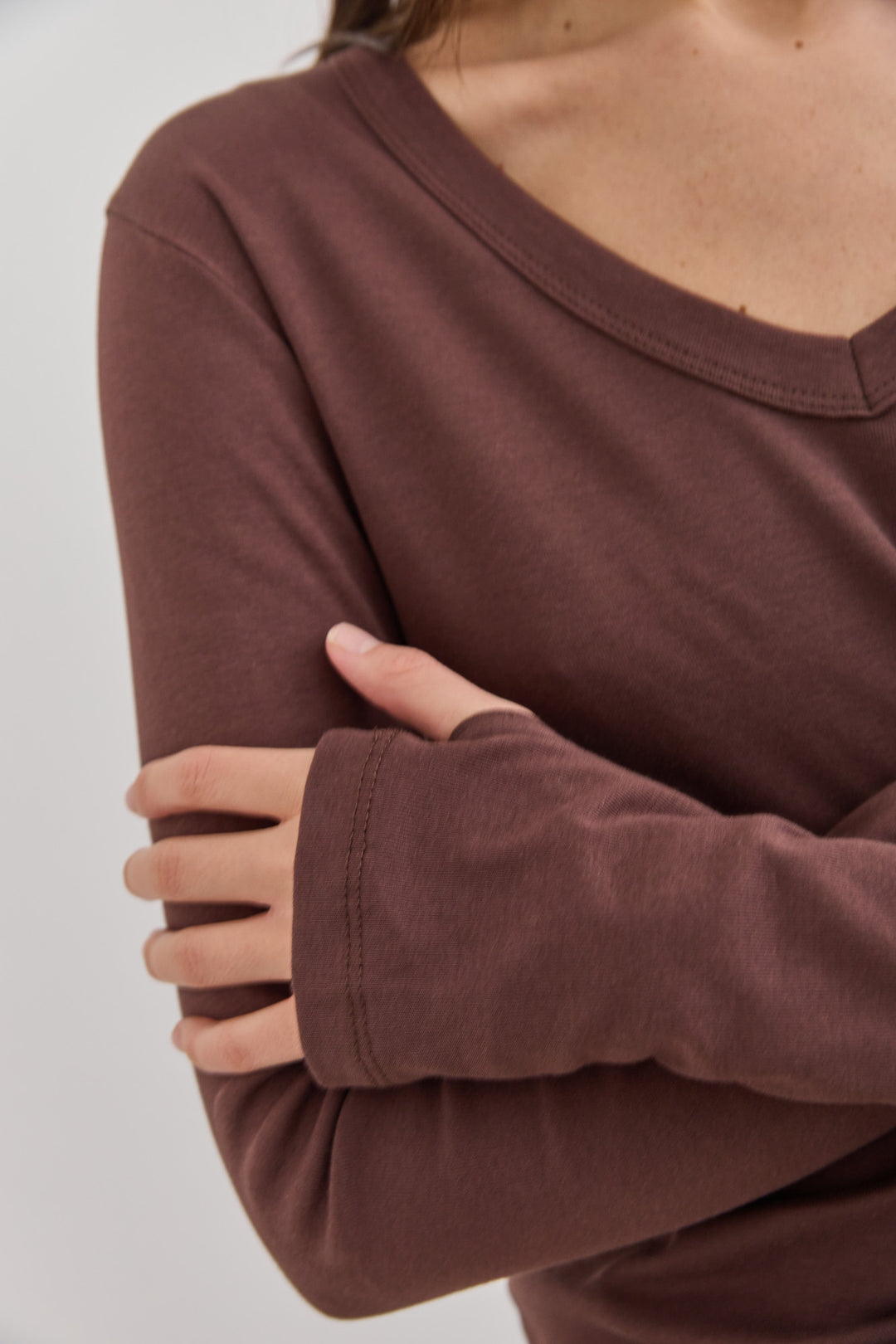 חולצת בייסיק מייגן וי שרוול כפפה | חום כהה