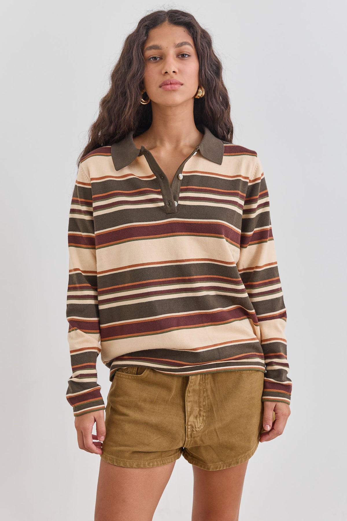 סריג בדוגמת פסים בשילוב צווארון פולו וכפתורים