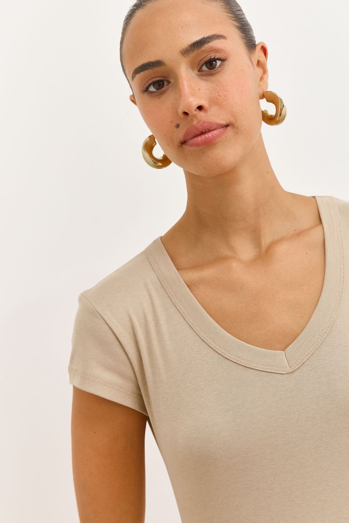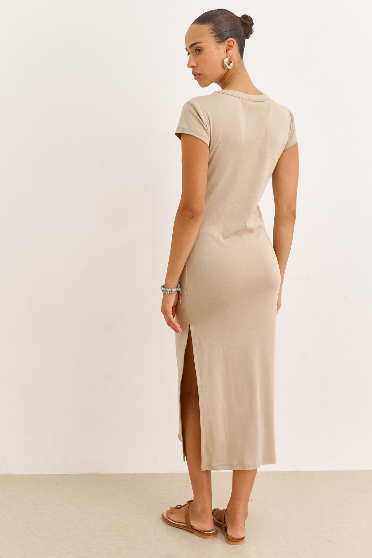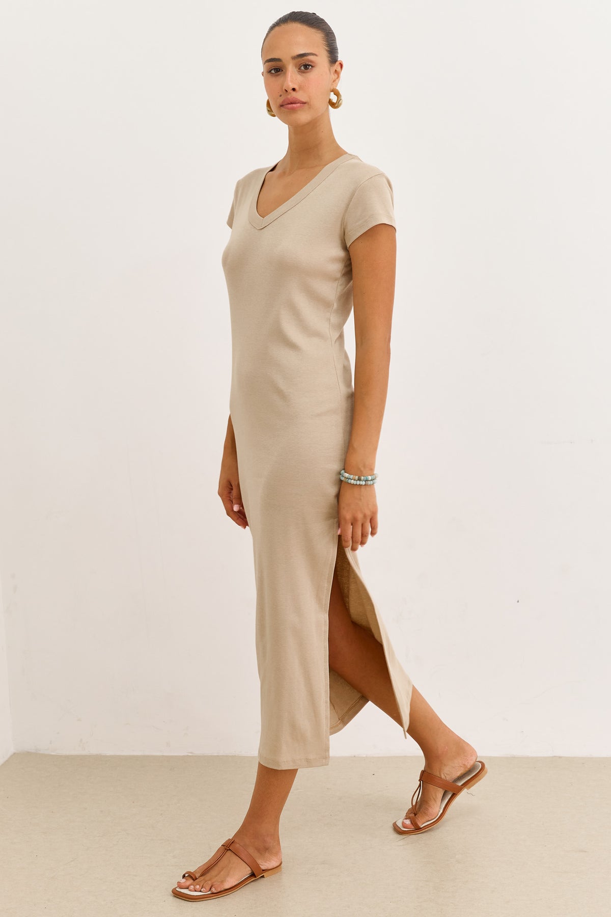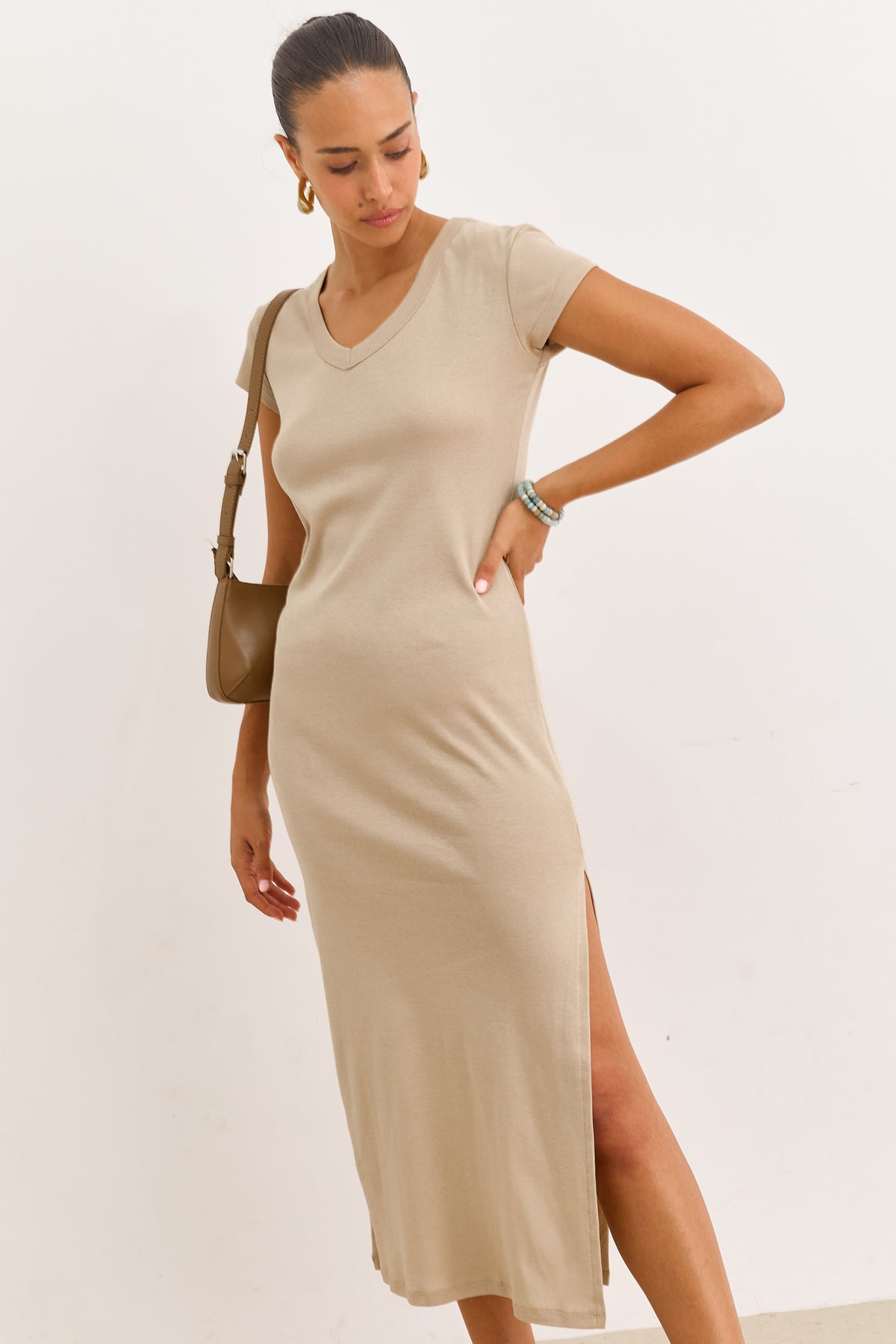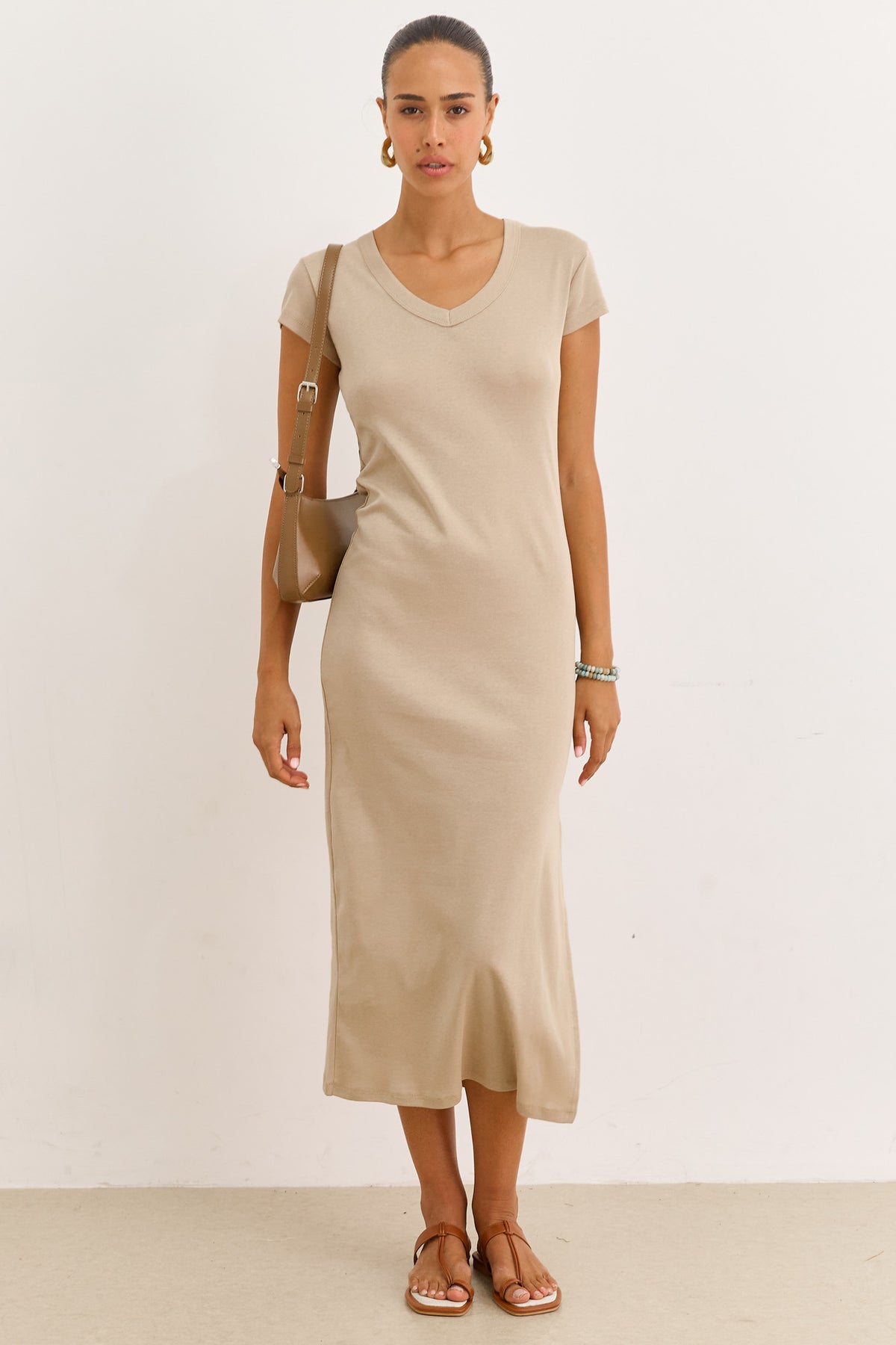 שמלת בייסיק ג'ני מחשוף וי | בז'