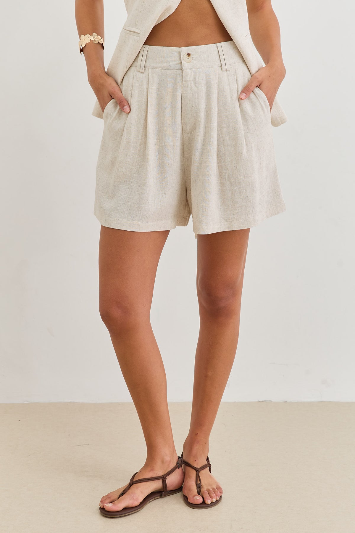 מכנסיים קצרים מבד דמוי פשתן בגזרה מחויטת עם קפלים וכיסים