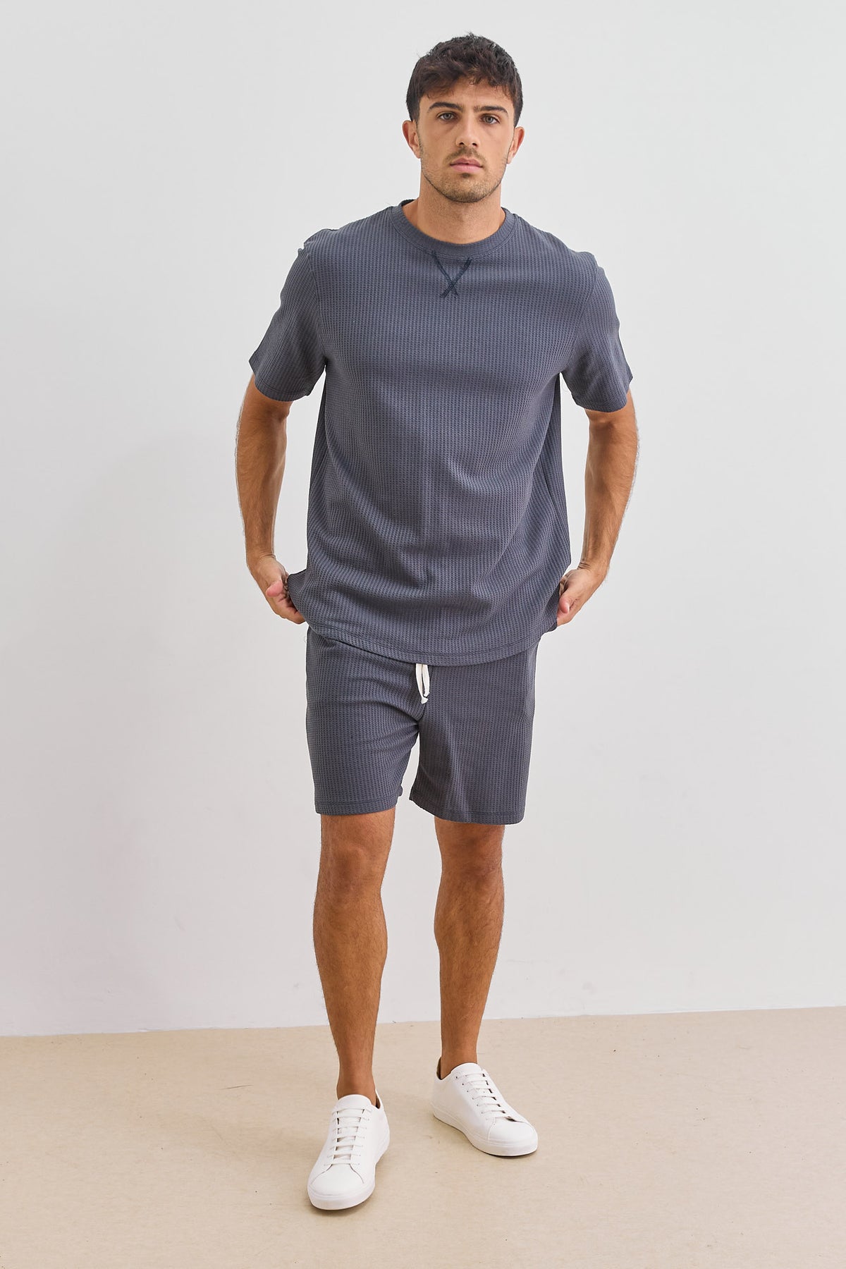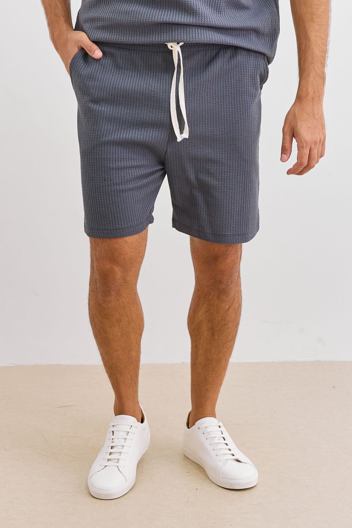 מכנסיים קצרים מבד וופל עם כיסים, גומי במותן, שרוך וכיס אחורי