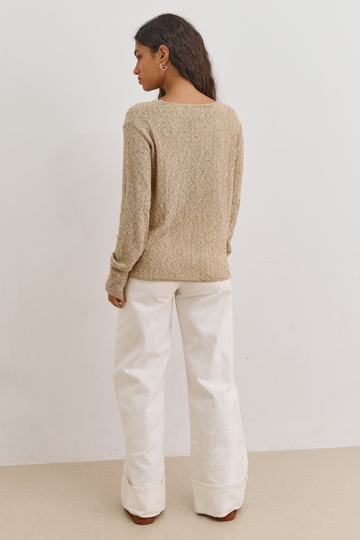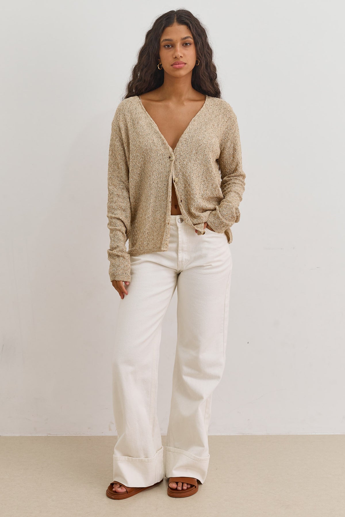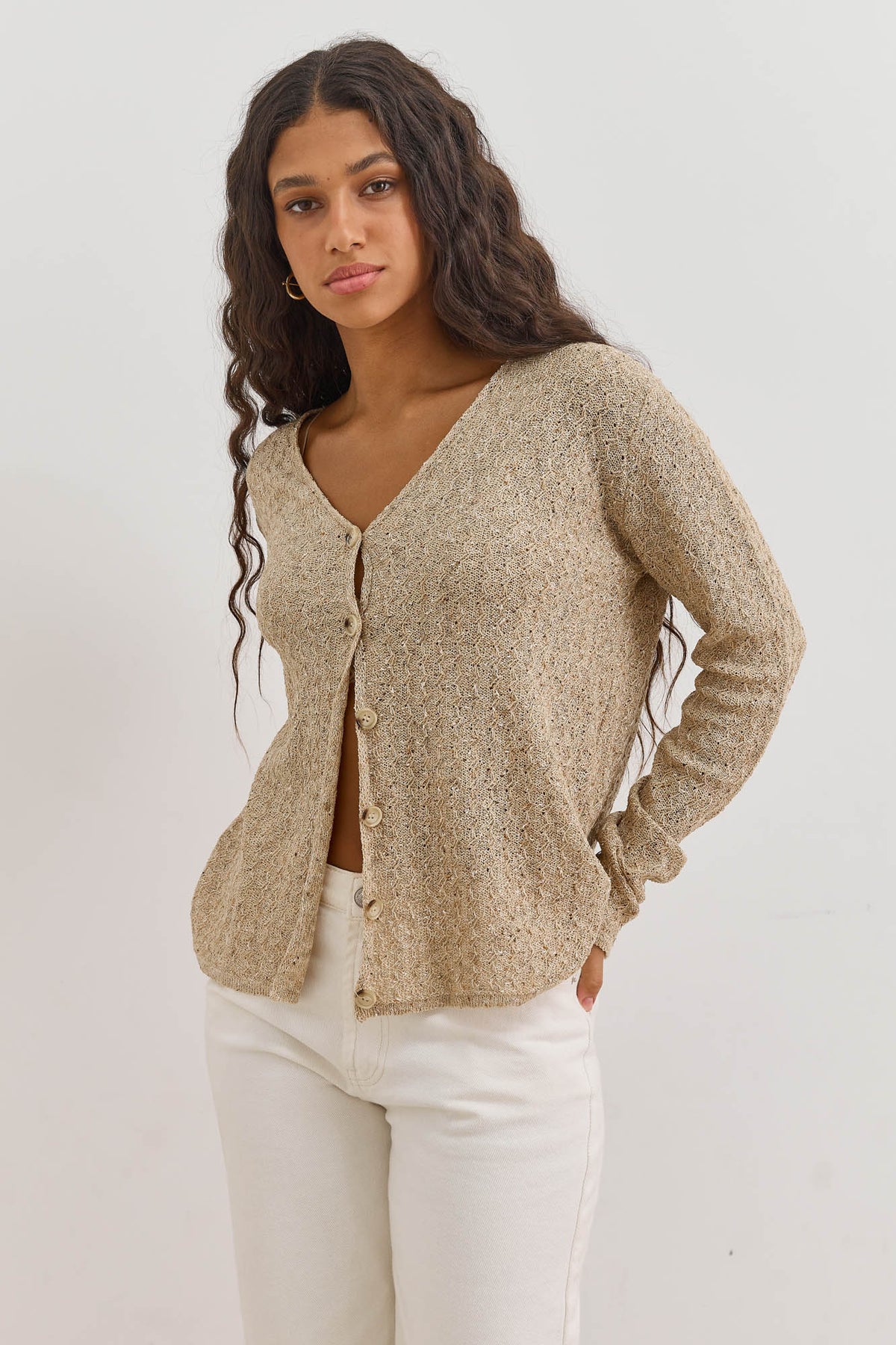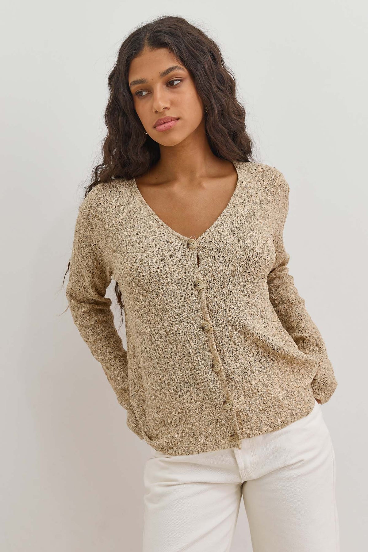 קרדיגן מבד סריג מעט מחורר עם טקסטורה וסריגת מלאנז' בשילוב כפתורים