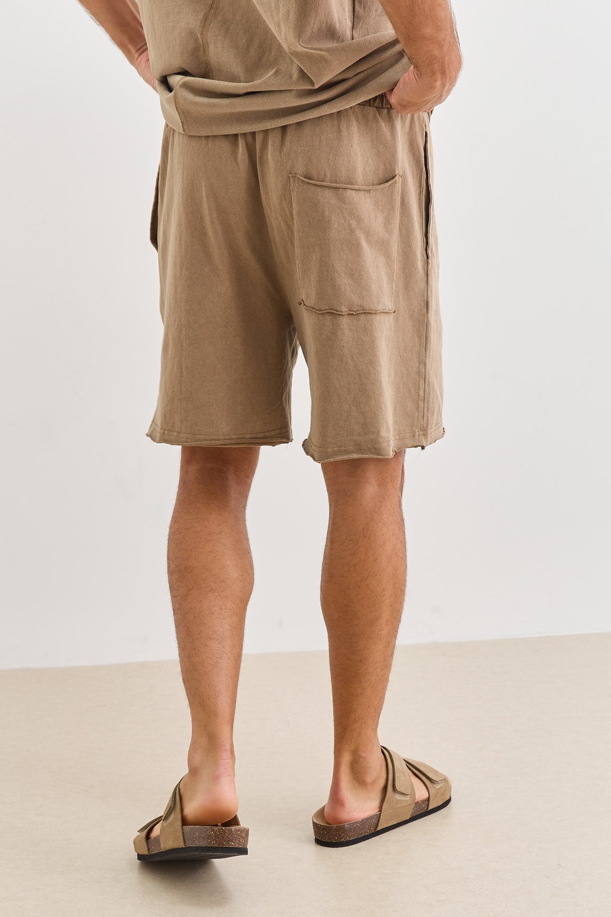 מכנסיים קצרים בשטיפת וואש בסיומת גזורה עם כיסים, גומי במותן, שרוך וכיס אחורי