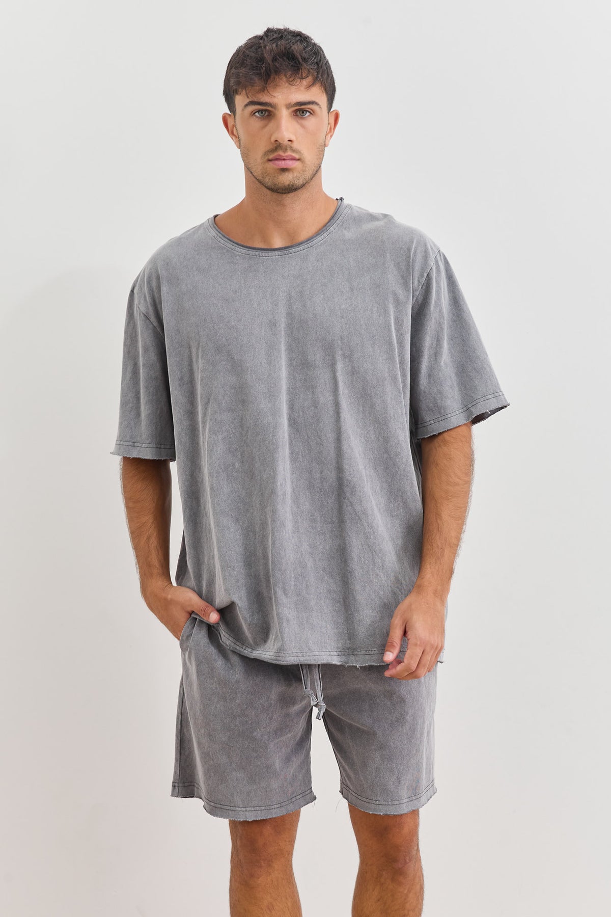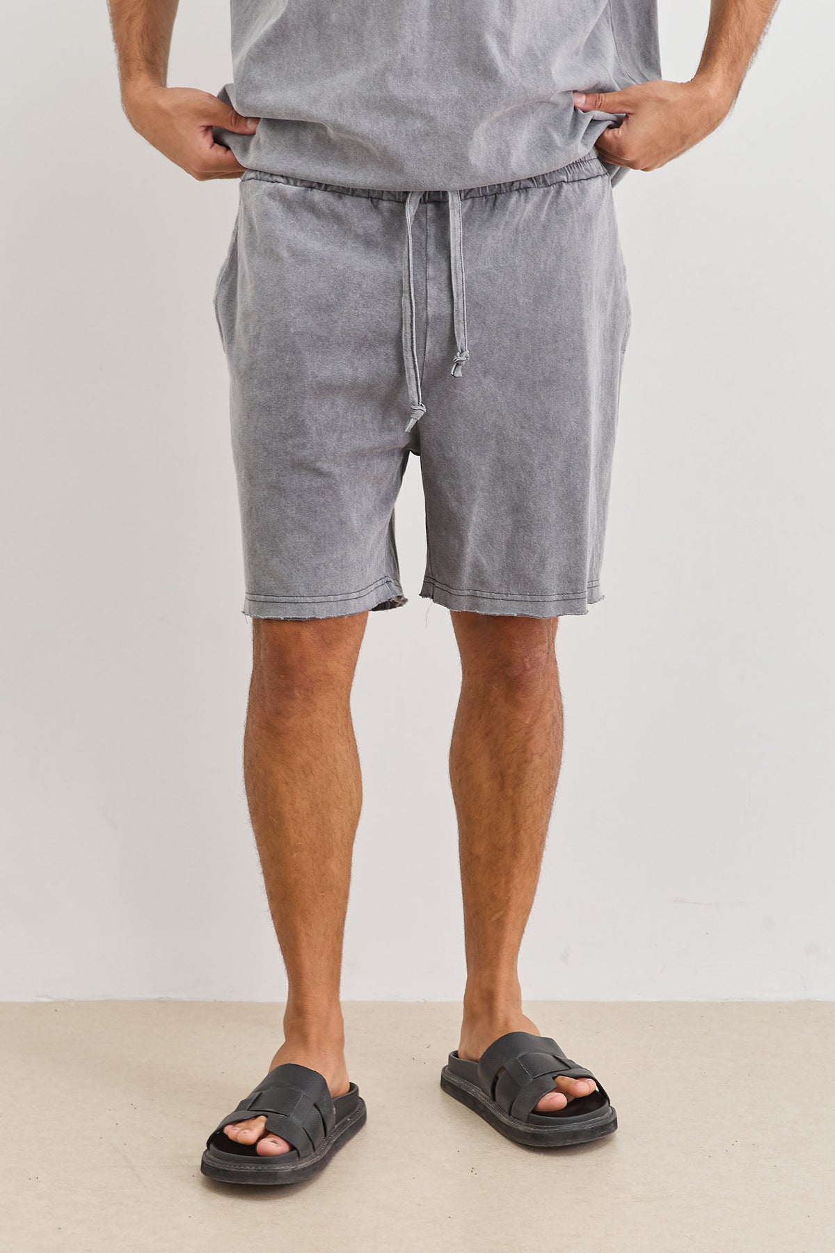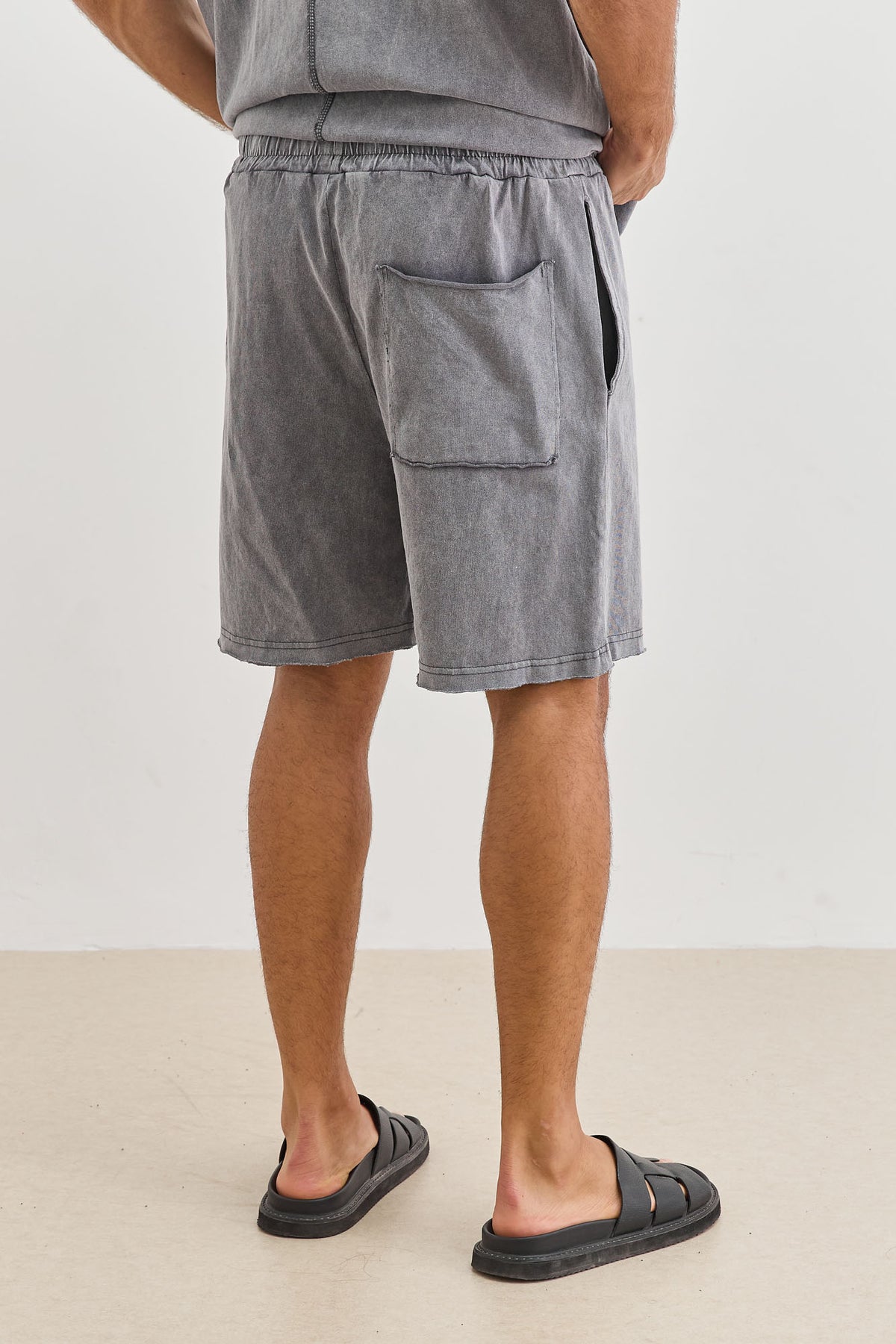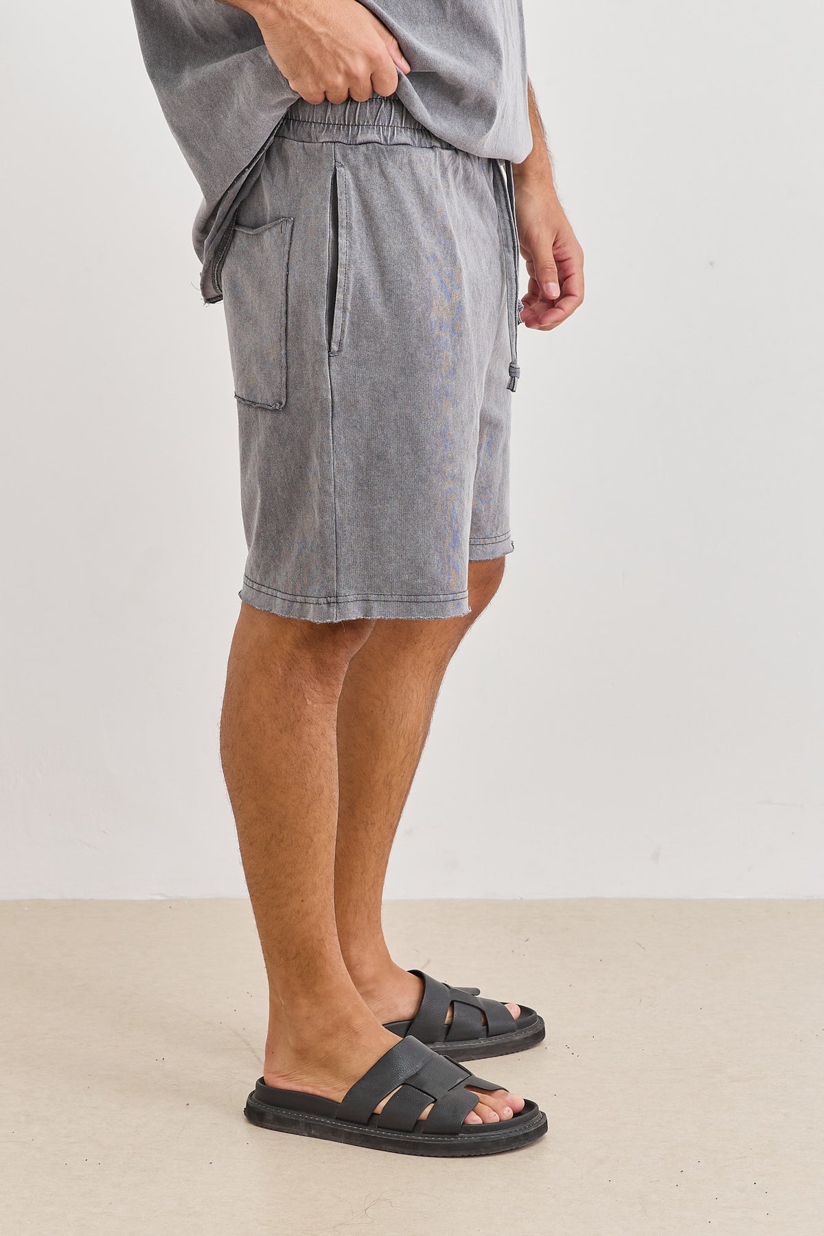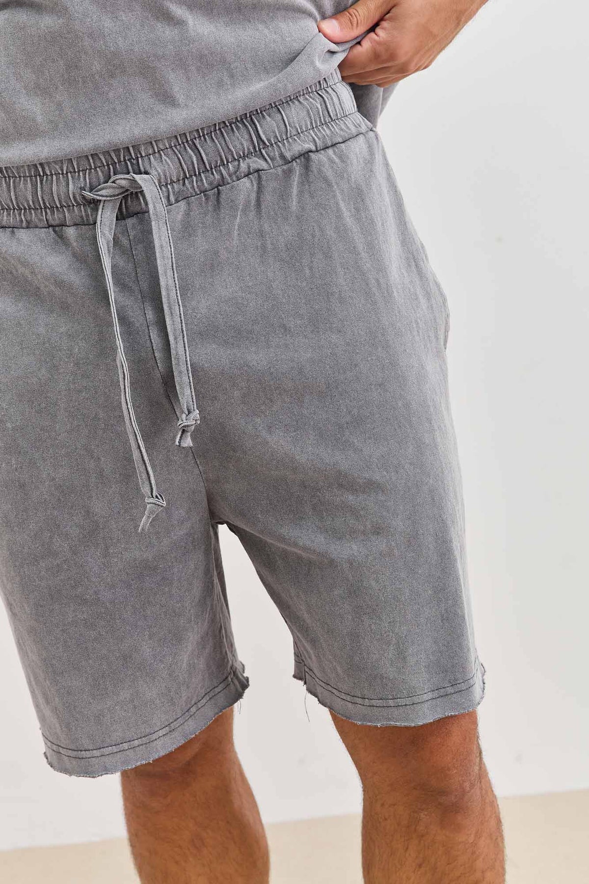 מכנסיים קצרים בשטיפת וואש בסיומת גזורה עם כיסים, גומי במותן, שרוך וכיס אחורי