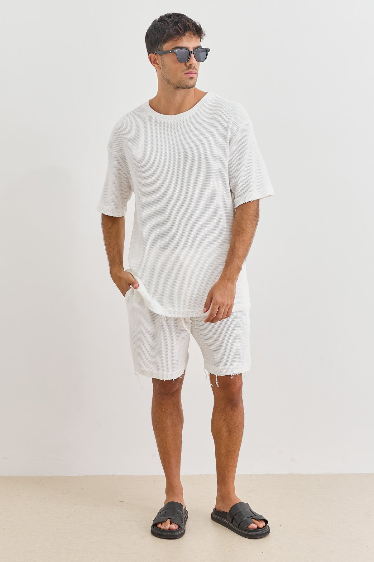 חולצה מבד וופל בסיומת פרומה עם צווארון ניקי ושרוולים קצרים