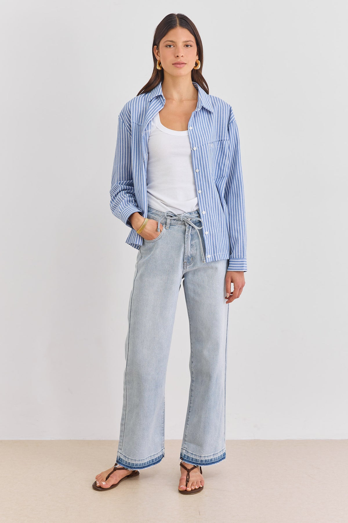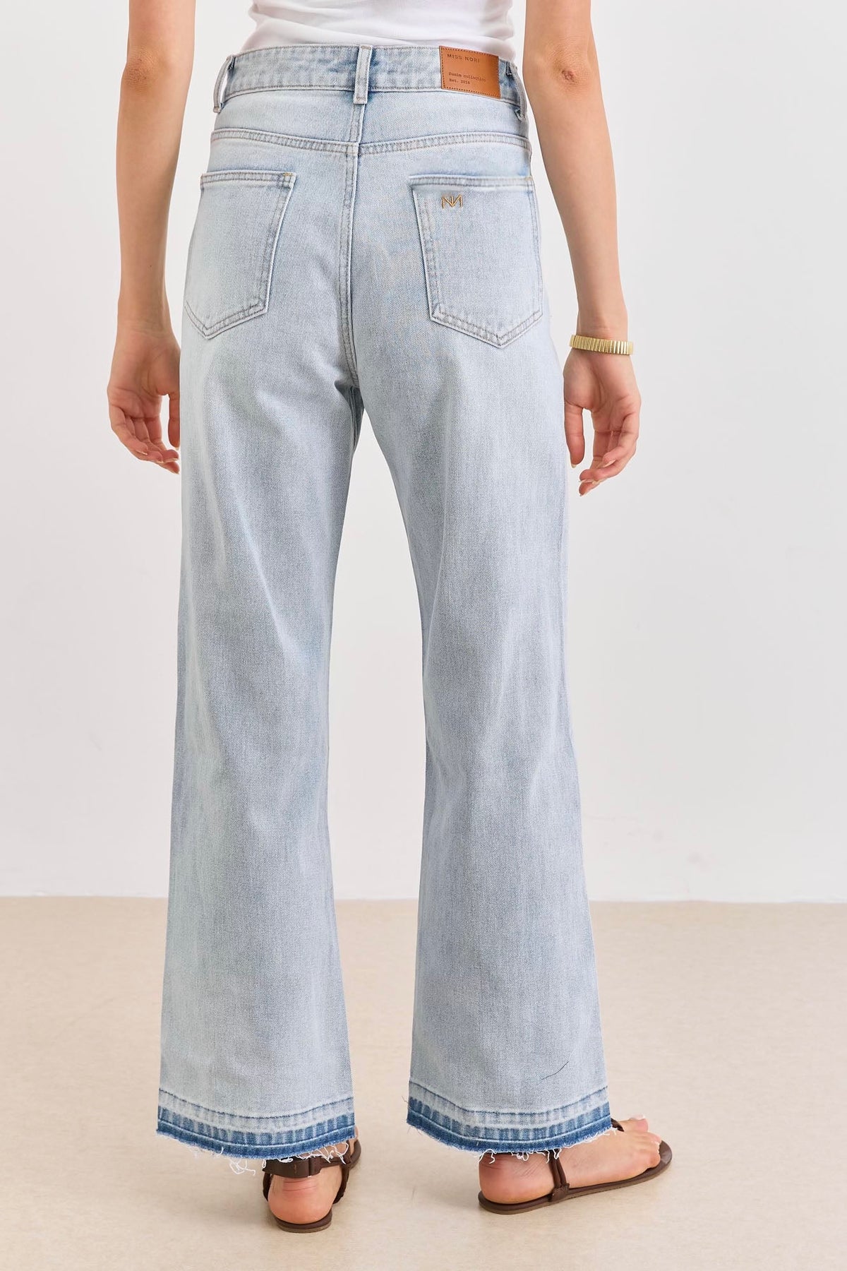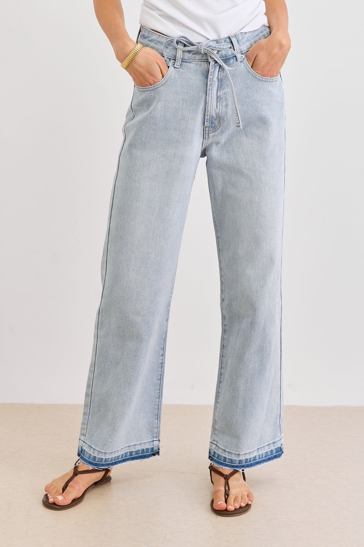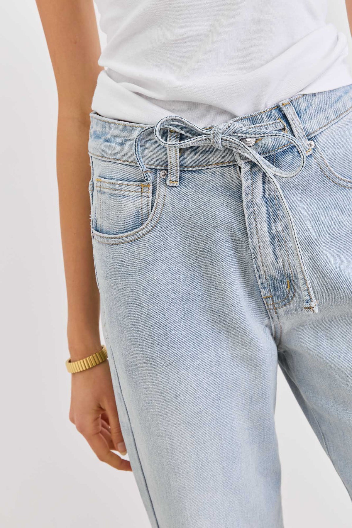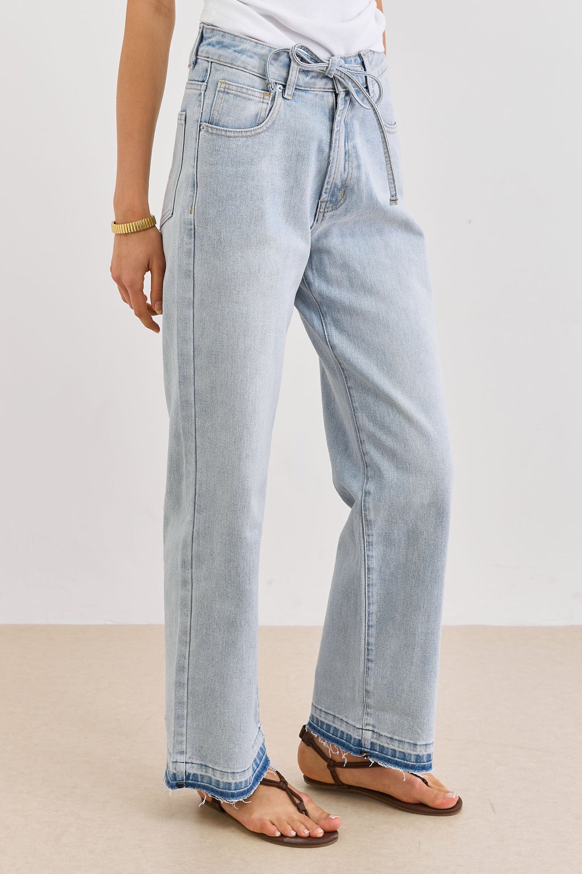 מכנסי ג'ינס ארוכים בגזרה גבוהה וישרה בשילוב חגורת קשירה וסיומת מכפלת וואש פרומה
