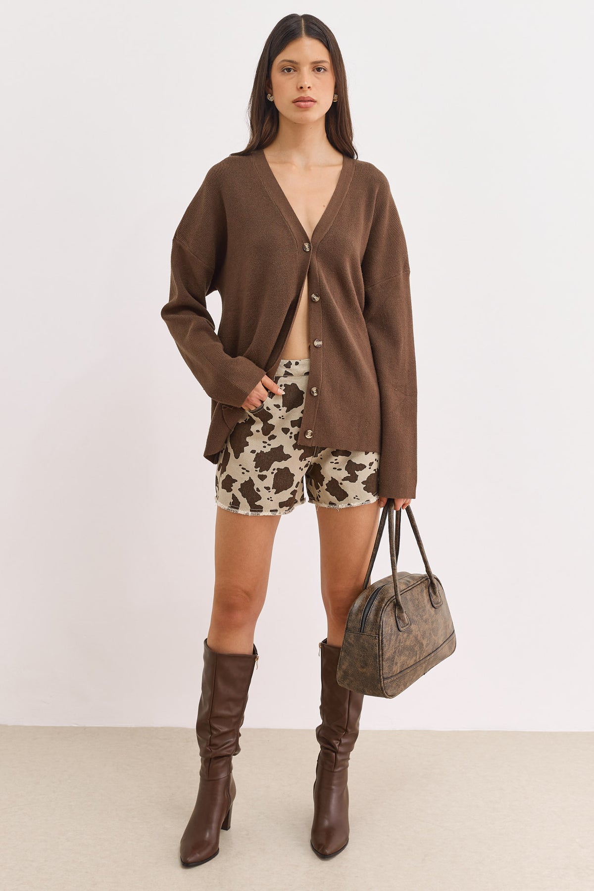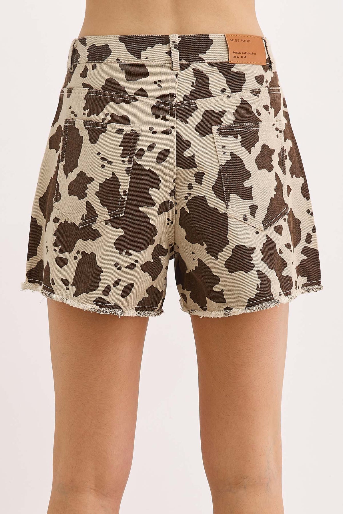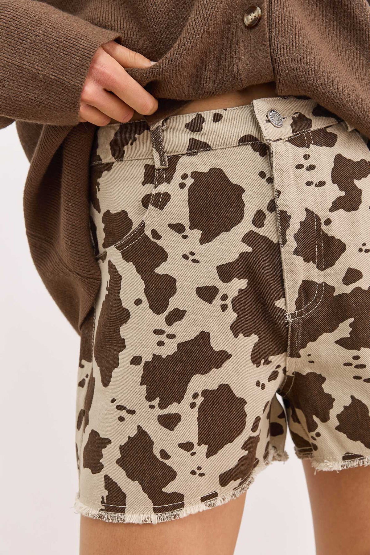 מכנסיים קצרים בהדפס פרה מבד דנים וסיומת פרומה, עם כיסים מקדימה ומאחורה