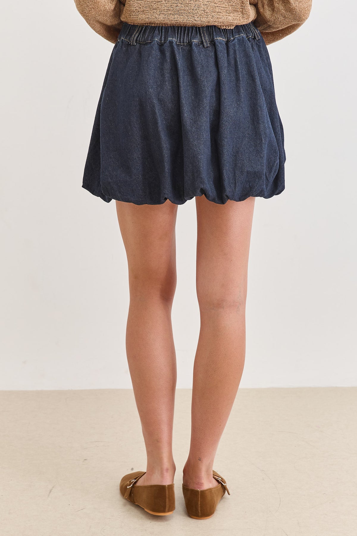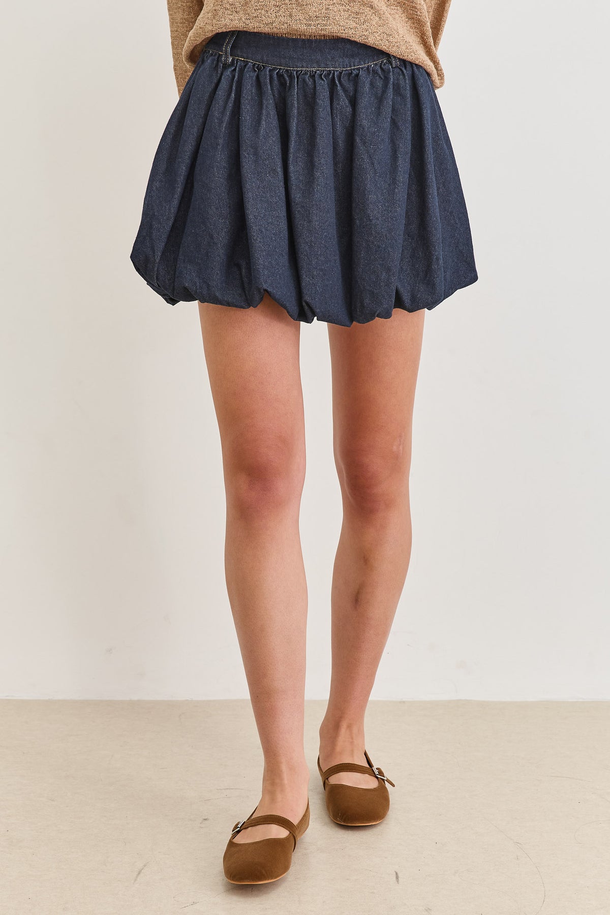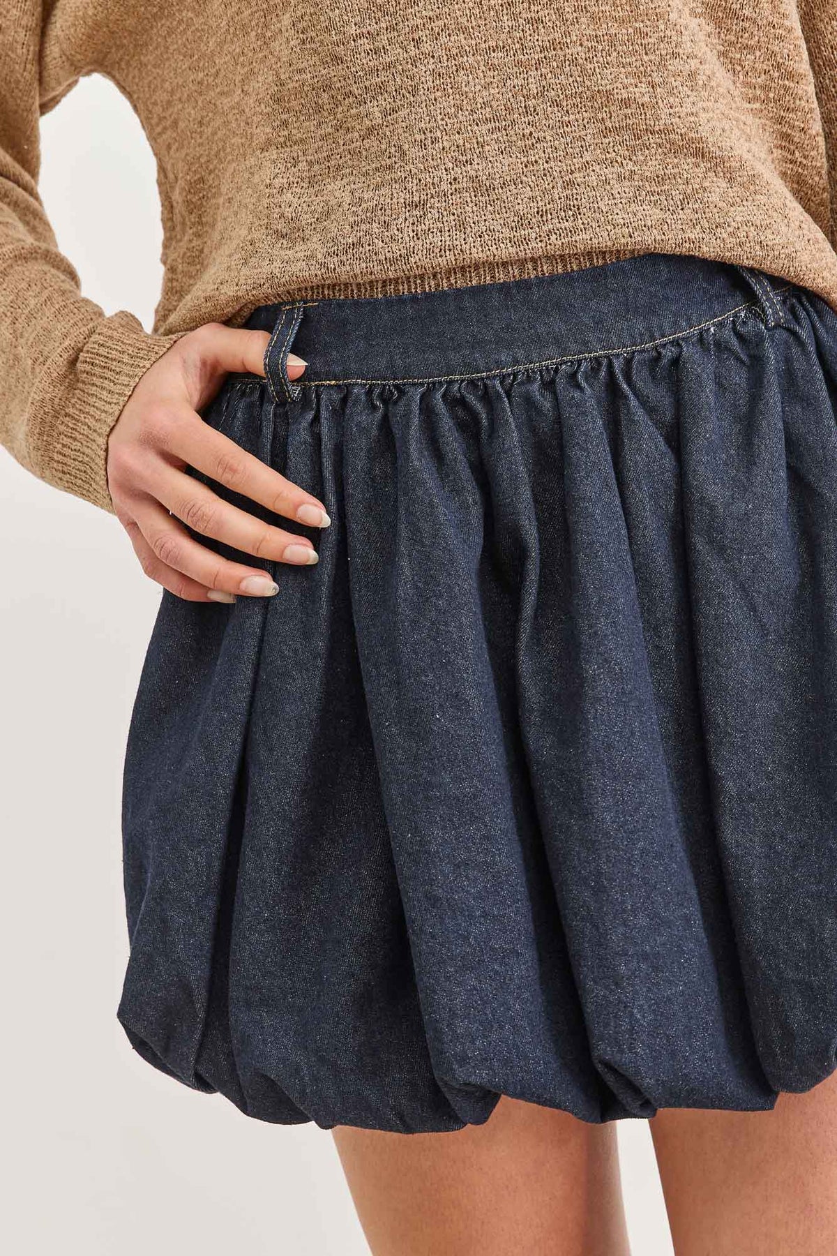 חצאית מיני דנים בגזרת בלון עם חגורת מותן ולולאות בשילוב גומי בגב