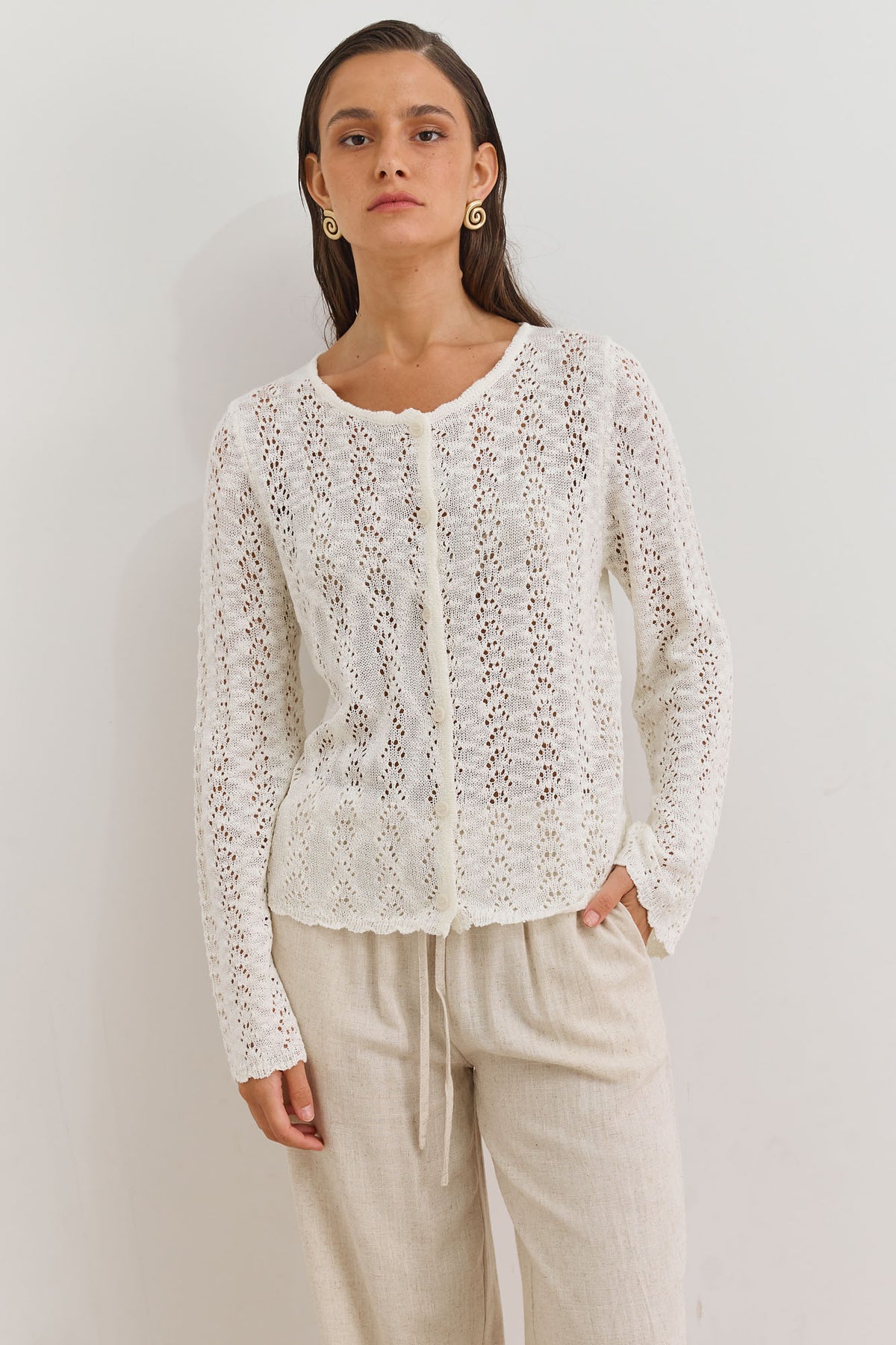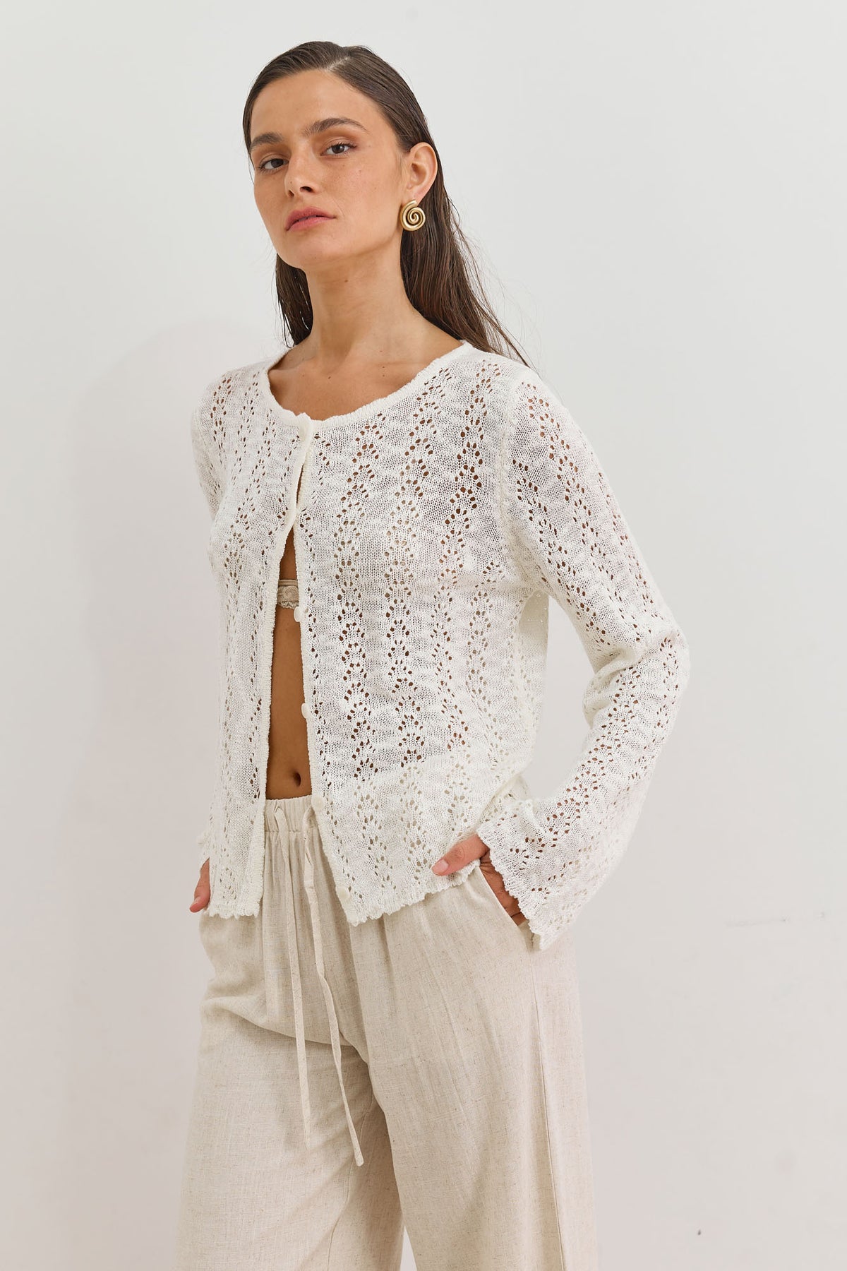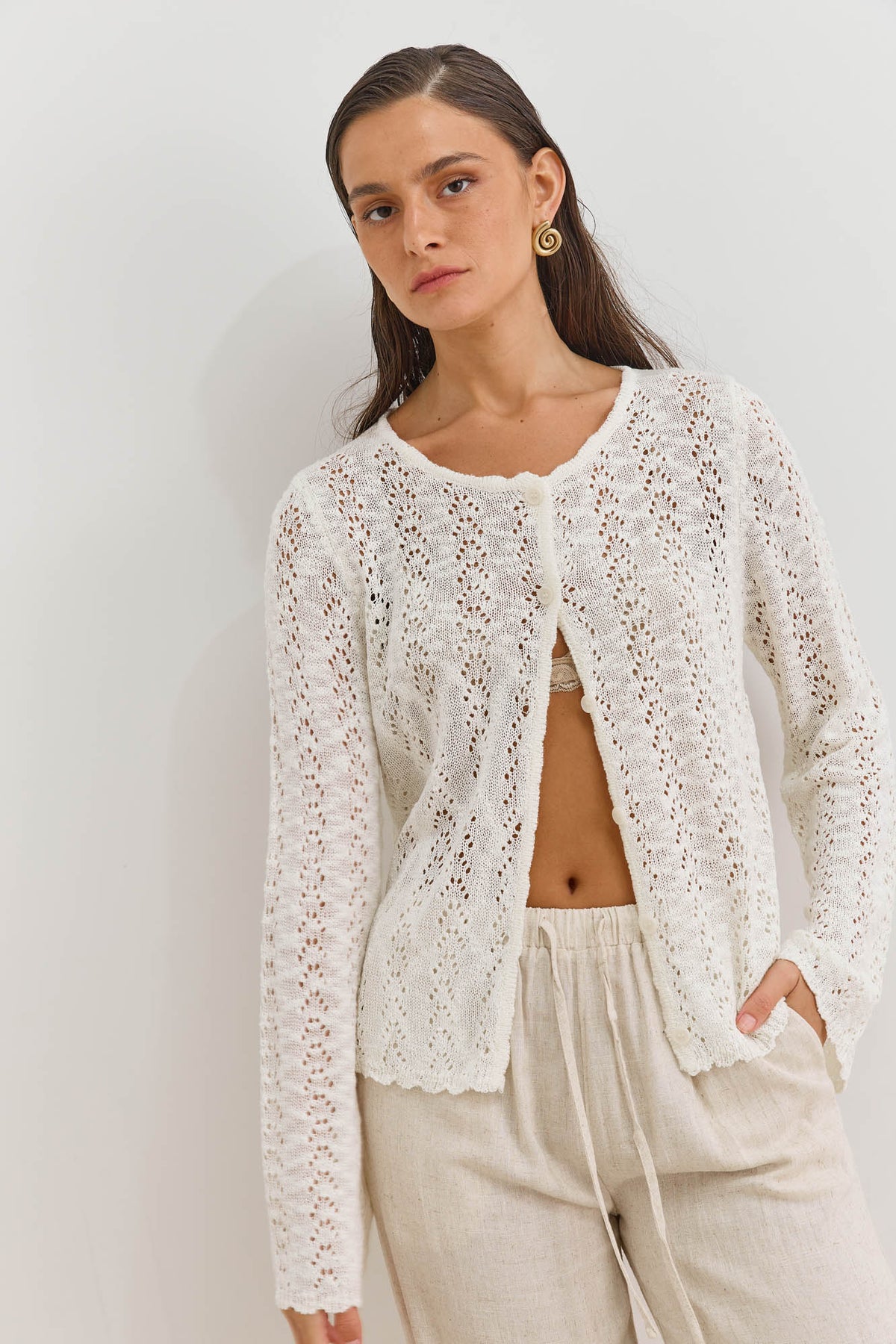קרדיגן מבד סריג דק ושקפקף בסגירת כפתורים ובשילוב עיטורים