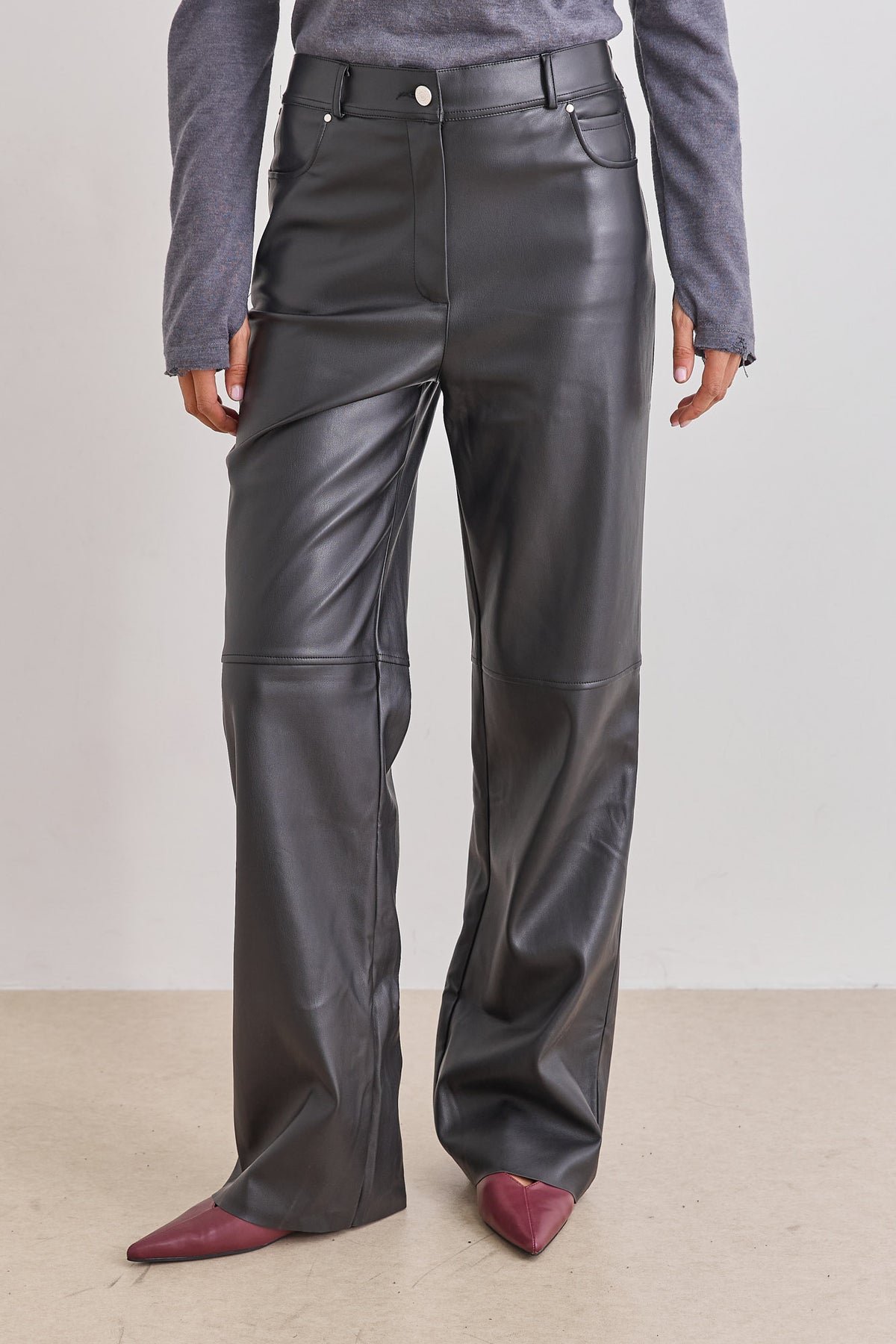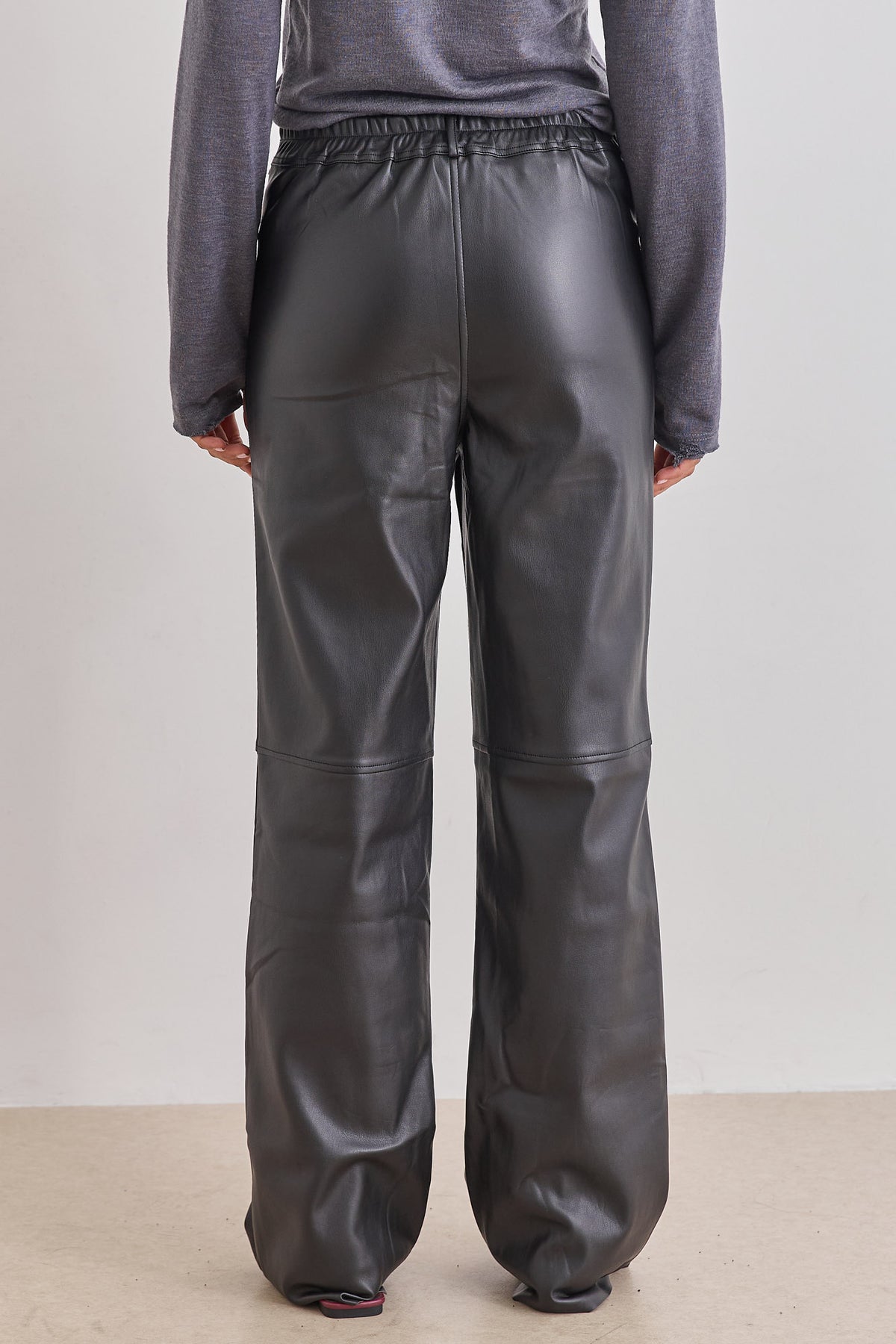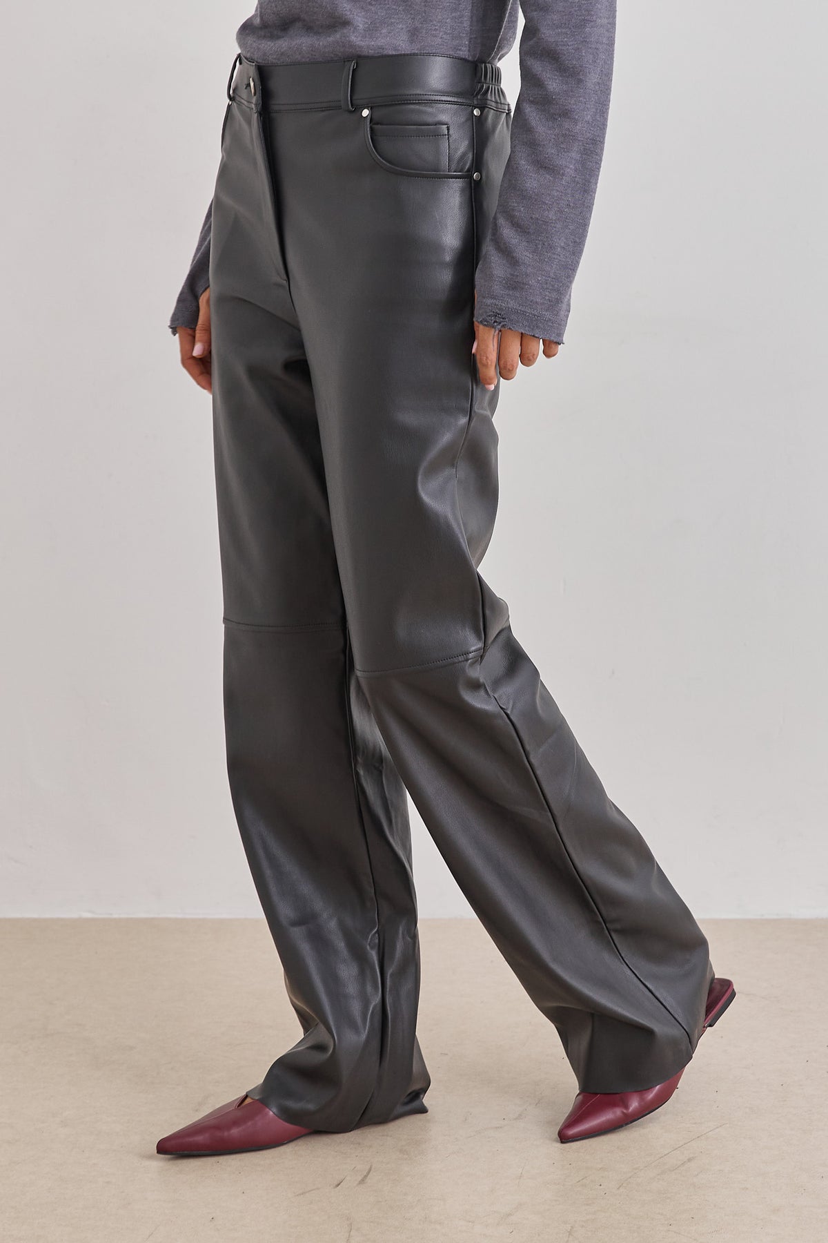 מכנסי דמוי עור היסטריים בשילוב גומי אחורי, כיסים צידיים וסיומת מתרחבת משדרגת.