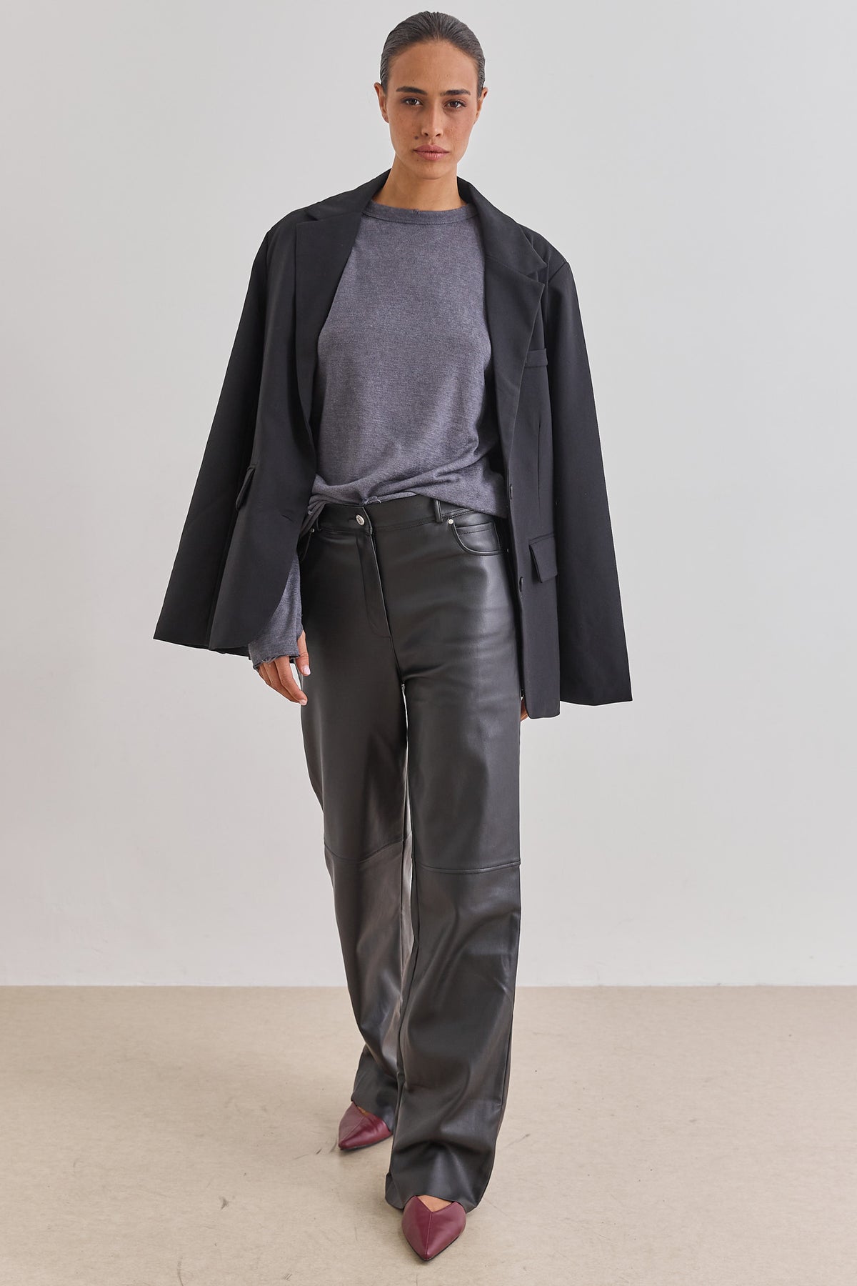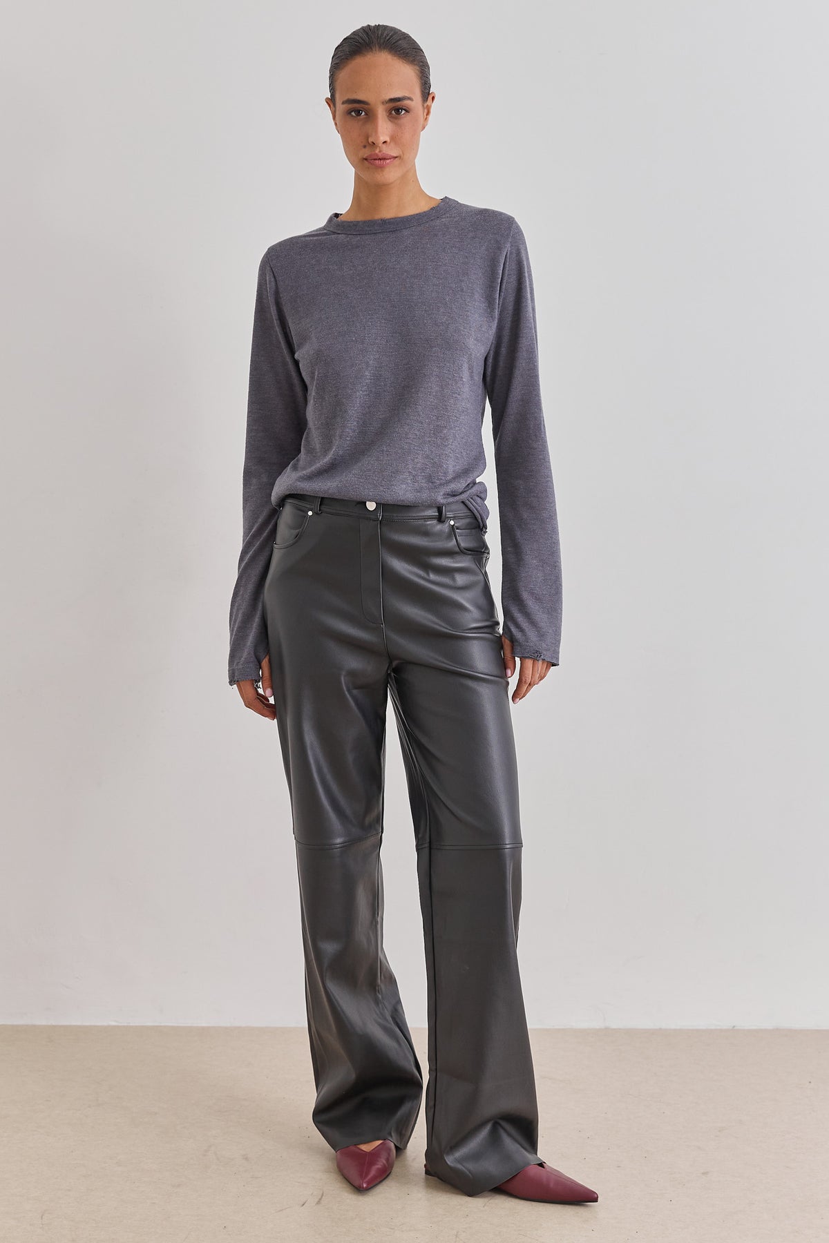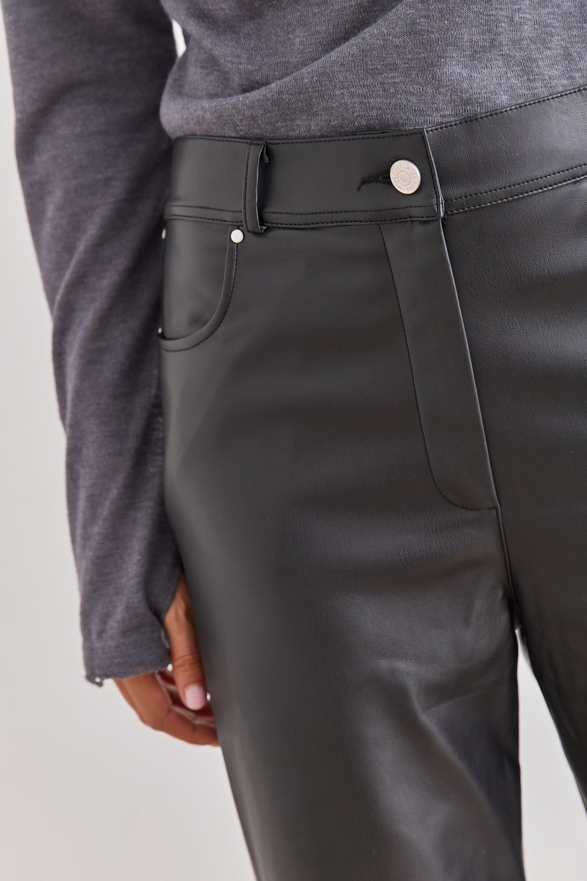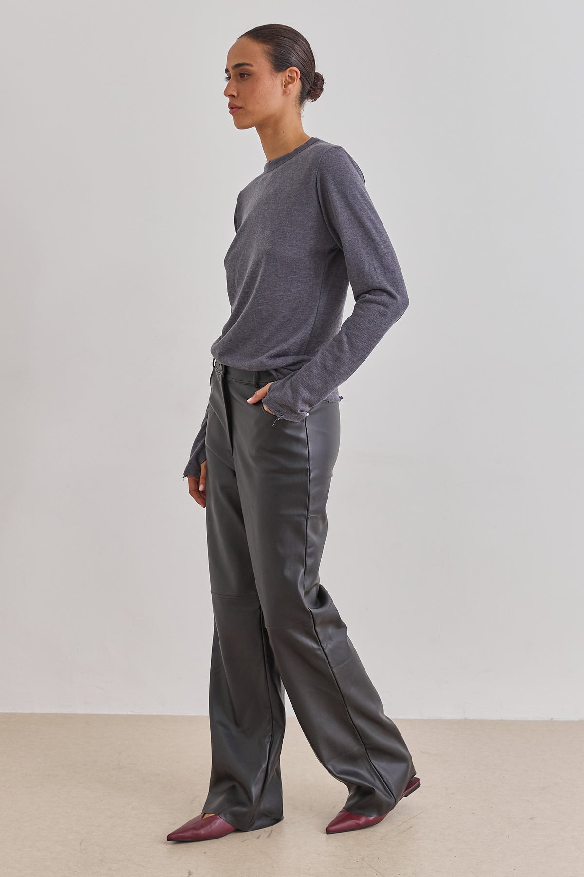 מכנסי דמוי עור היסטריים בשילוב גומי אחורי, כיסים צידיים וסיומת מתרחבת משדרגת.