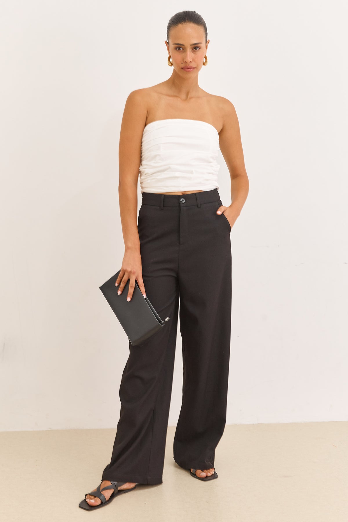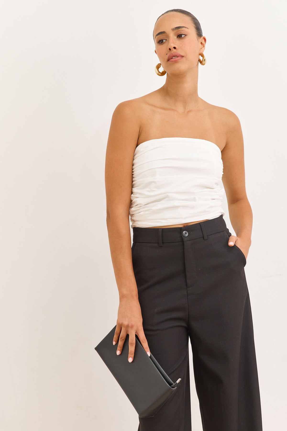 חולצת בגזרת סטרפלס בשילוב דיטיילז קפלים וציפקה בגב