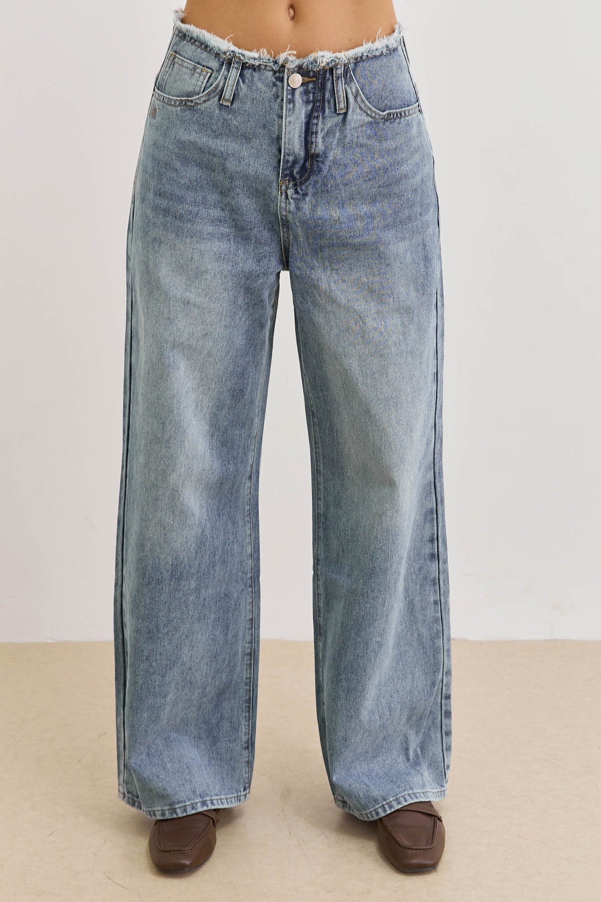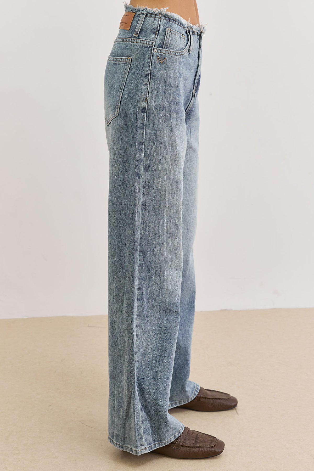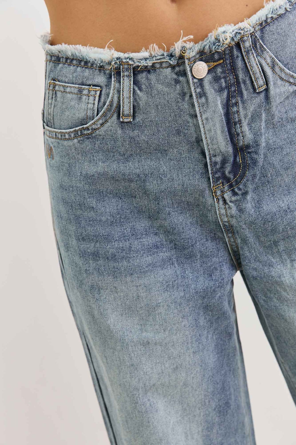 מכנסי ג'ינס ארוכים בגזרה ישרה בשילוב חגורת מותן פרומה