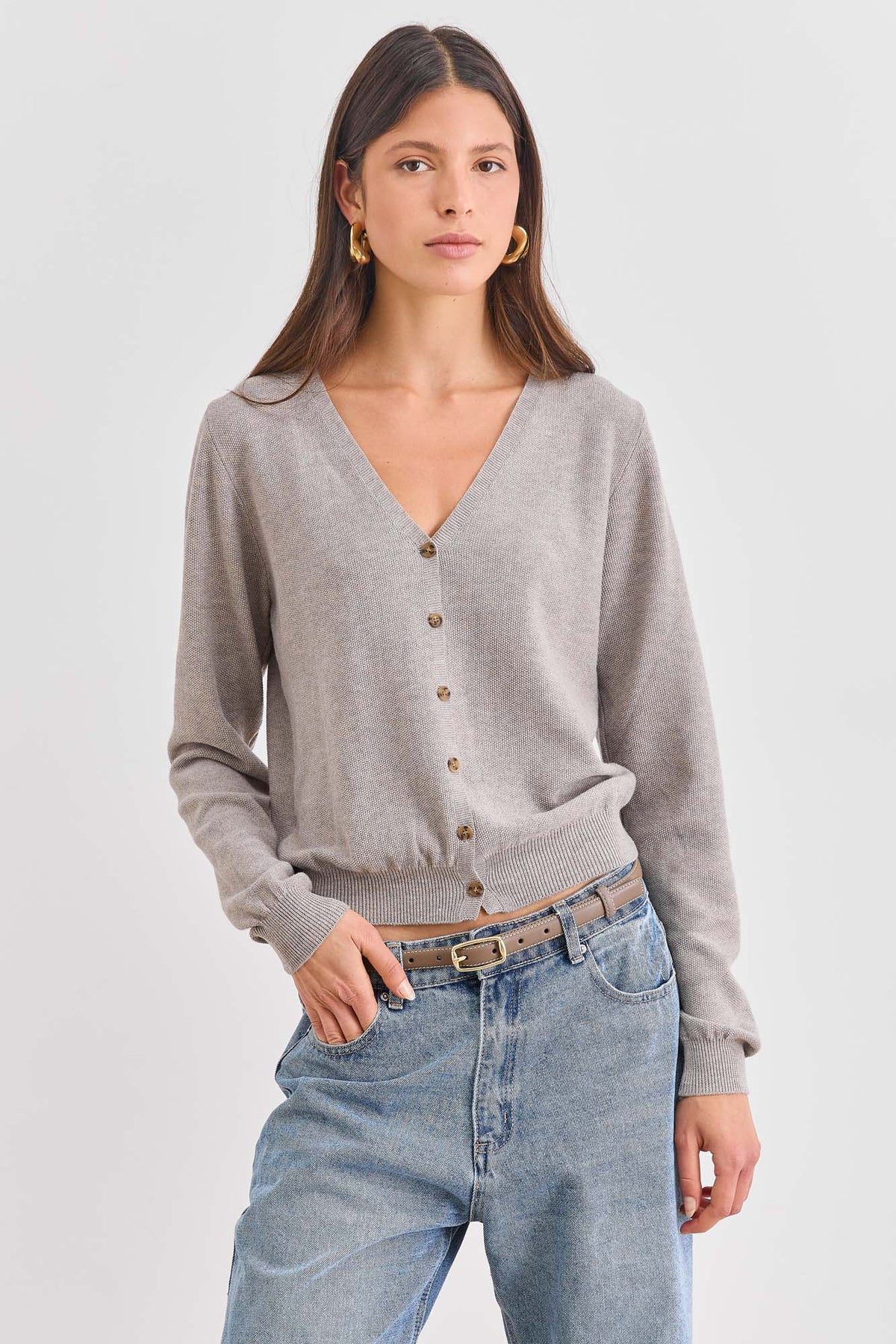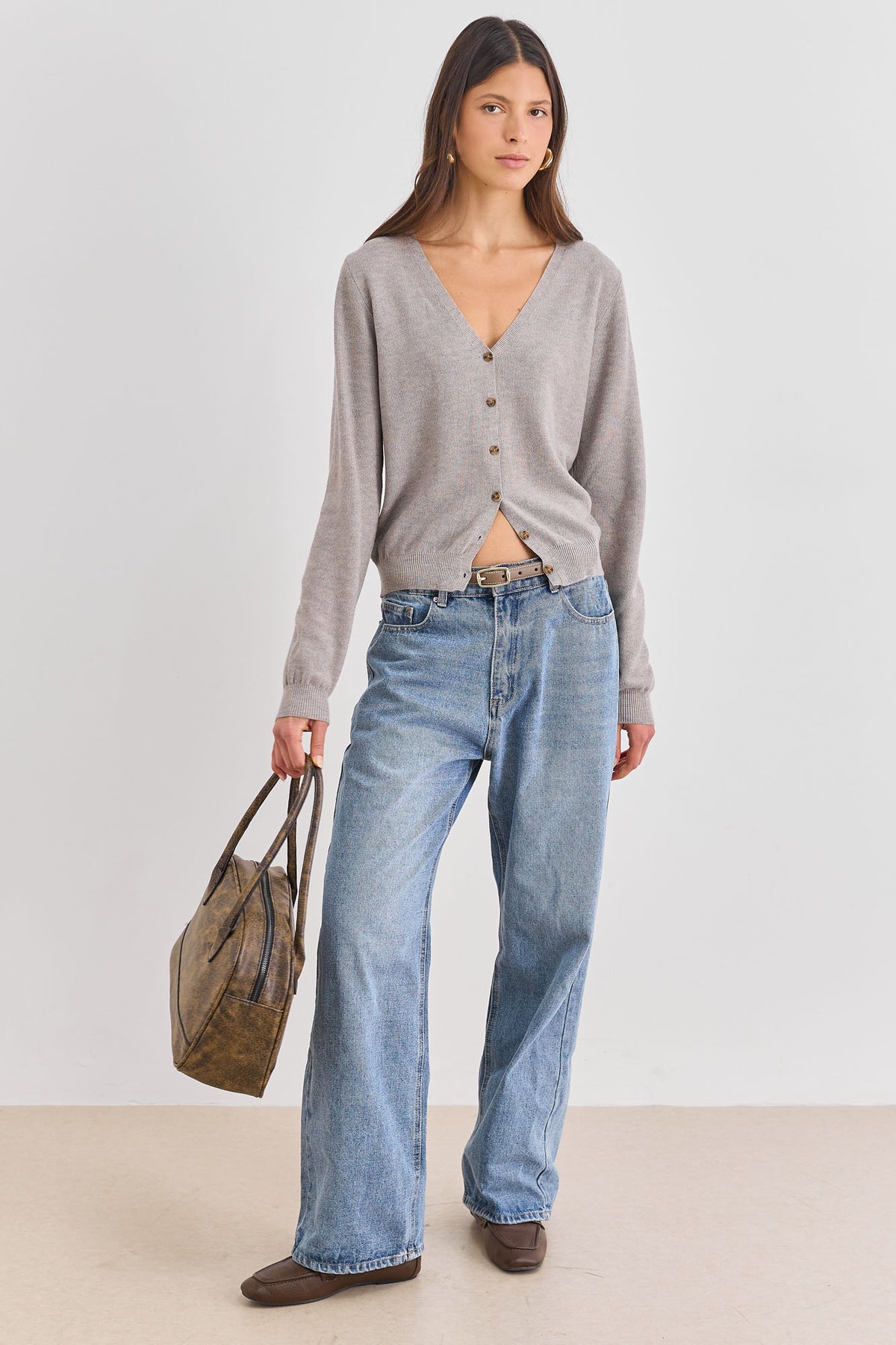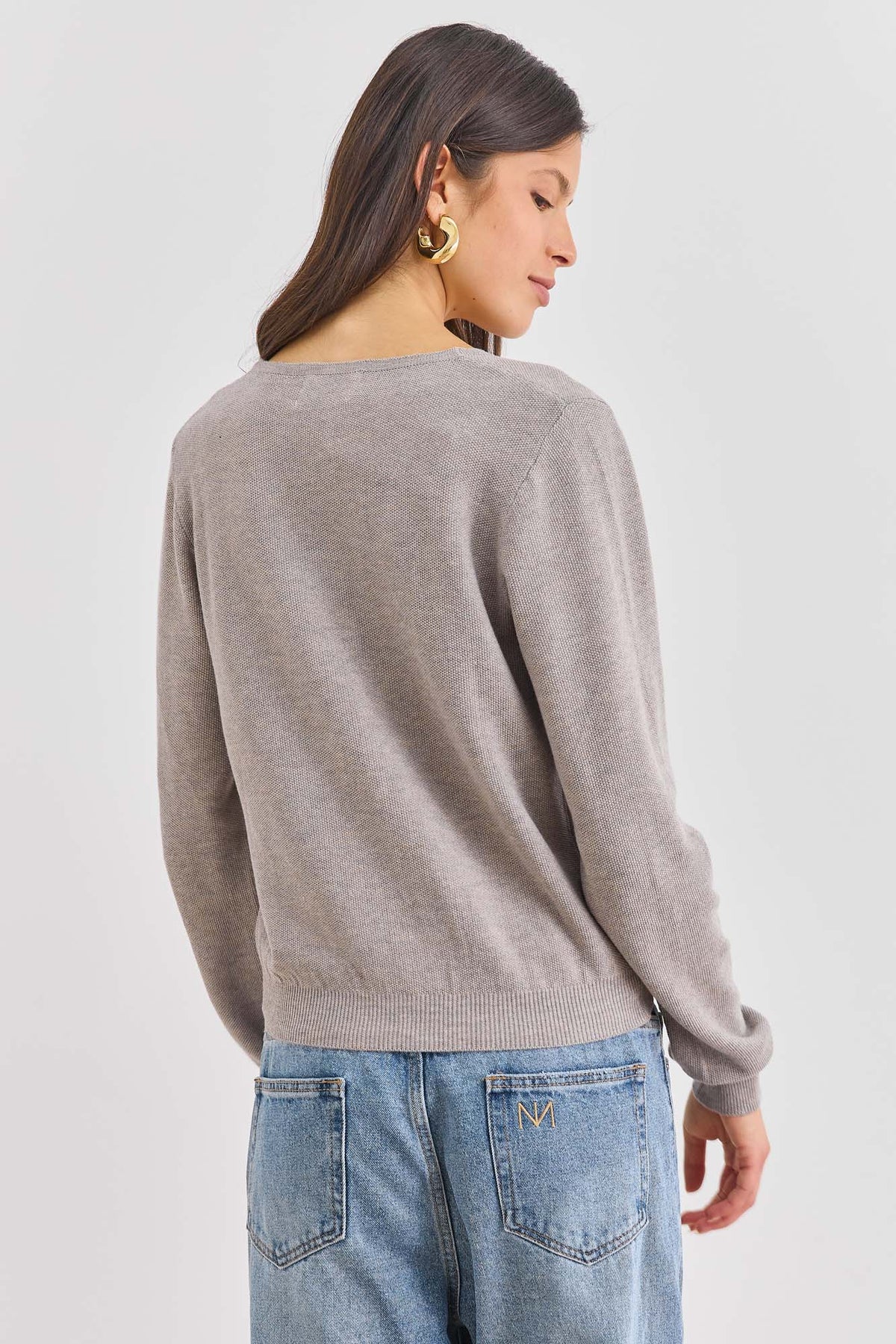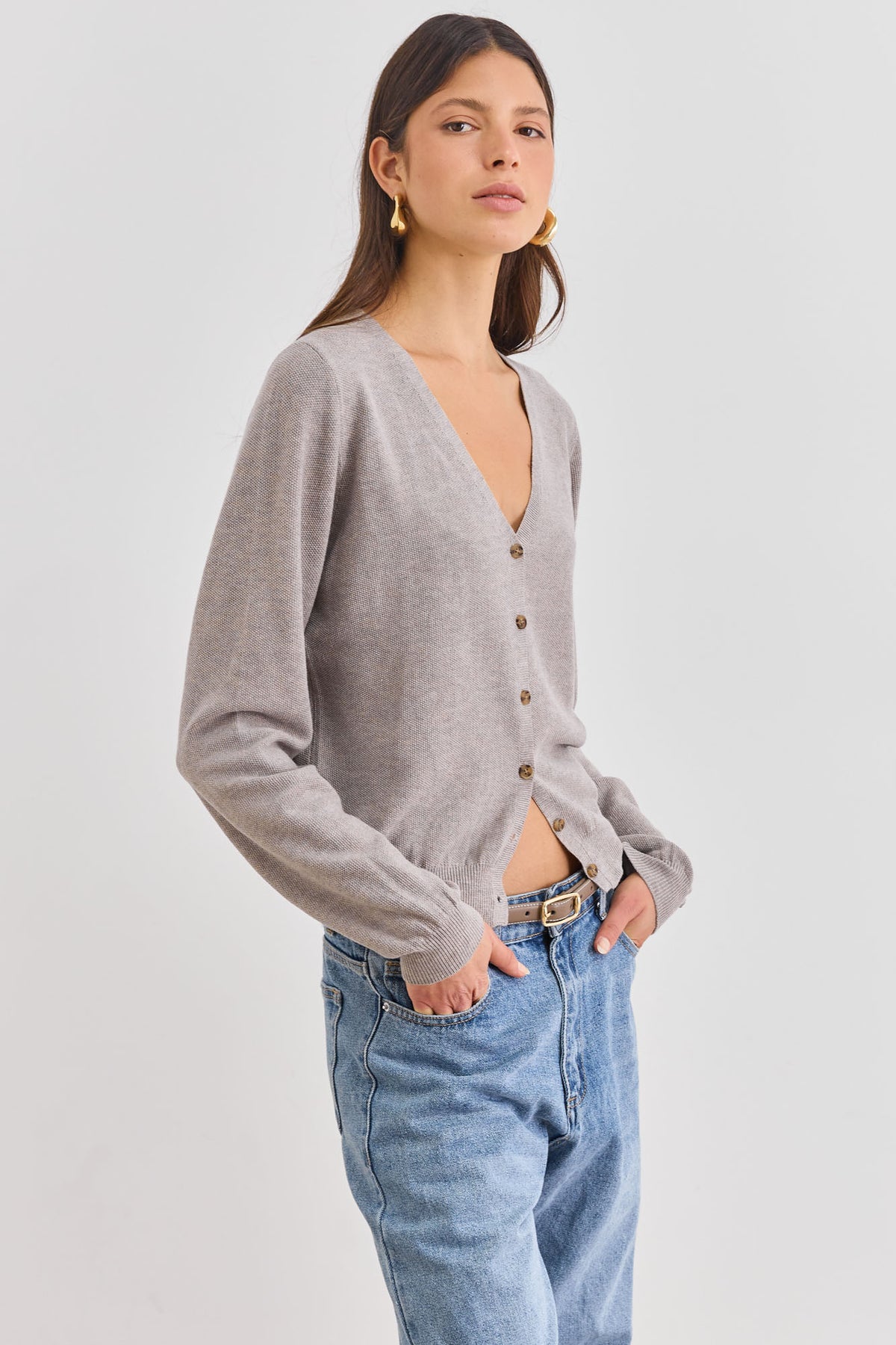 סריג כפתורים מבד דק עם צווארון וי וכיווצים בסיומת