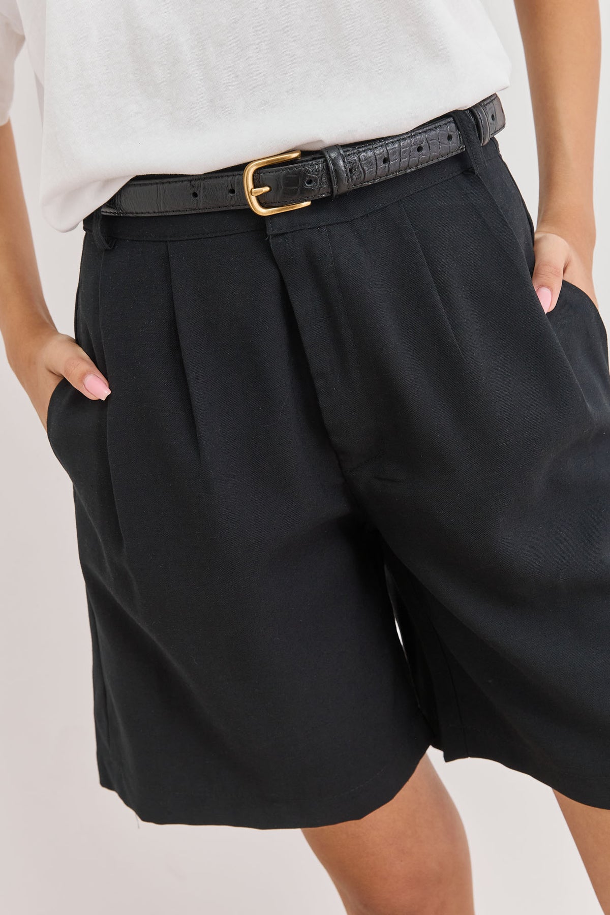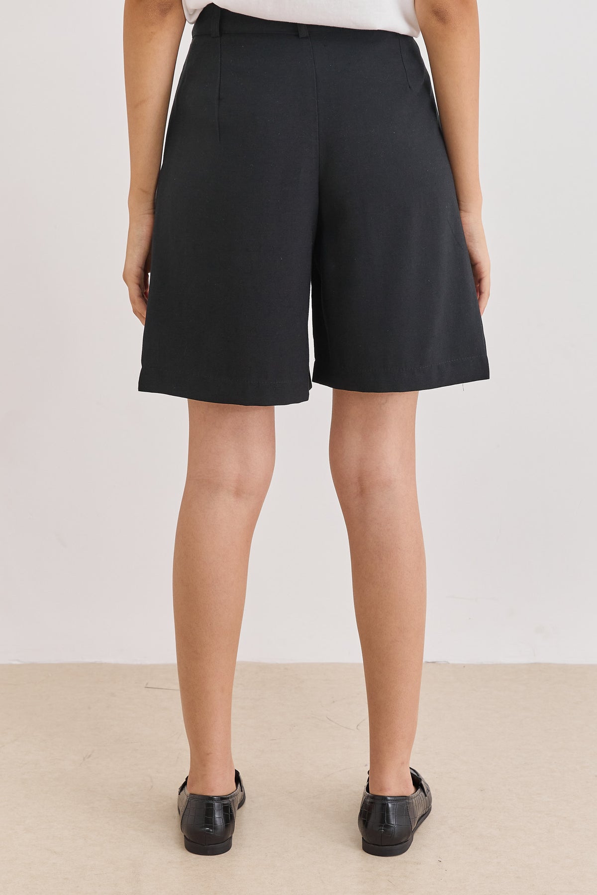 מכנסי ברמודה מבד דמוי פשתן בגזרה מחויטת עם קפלים וכיסים