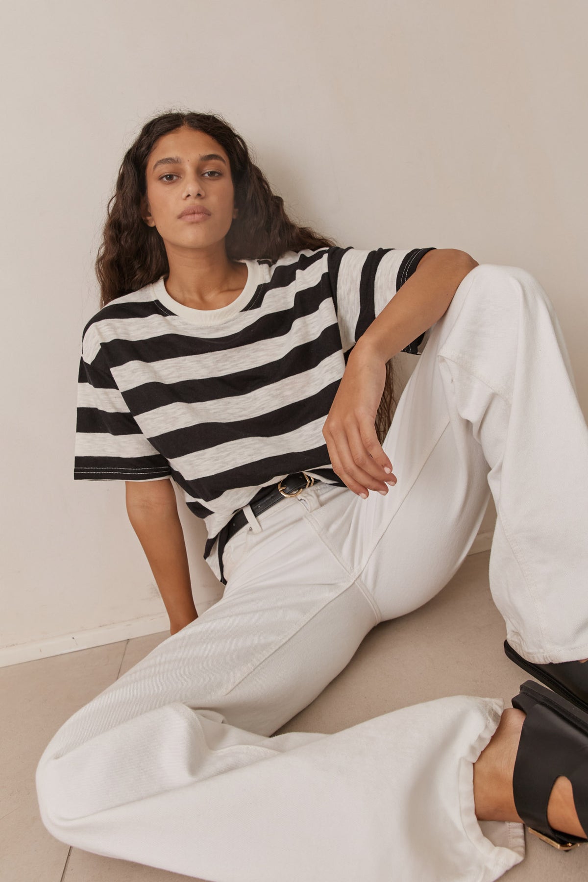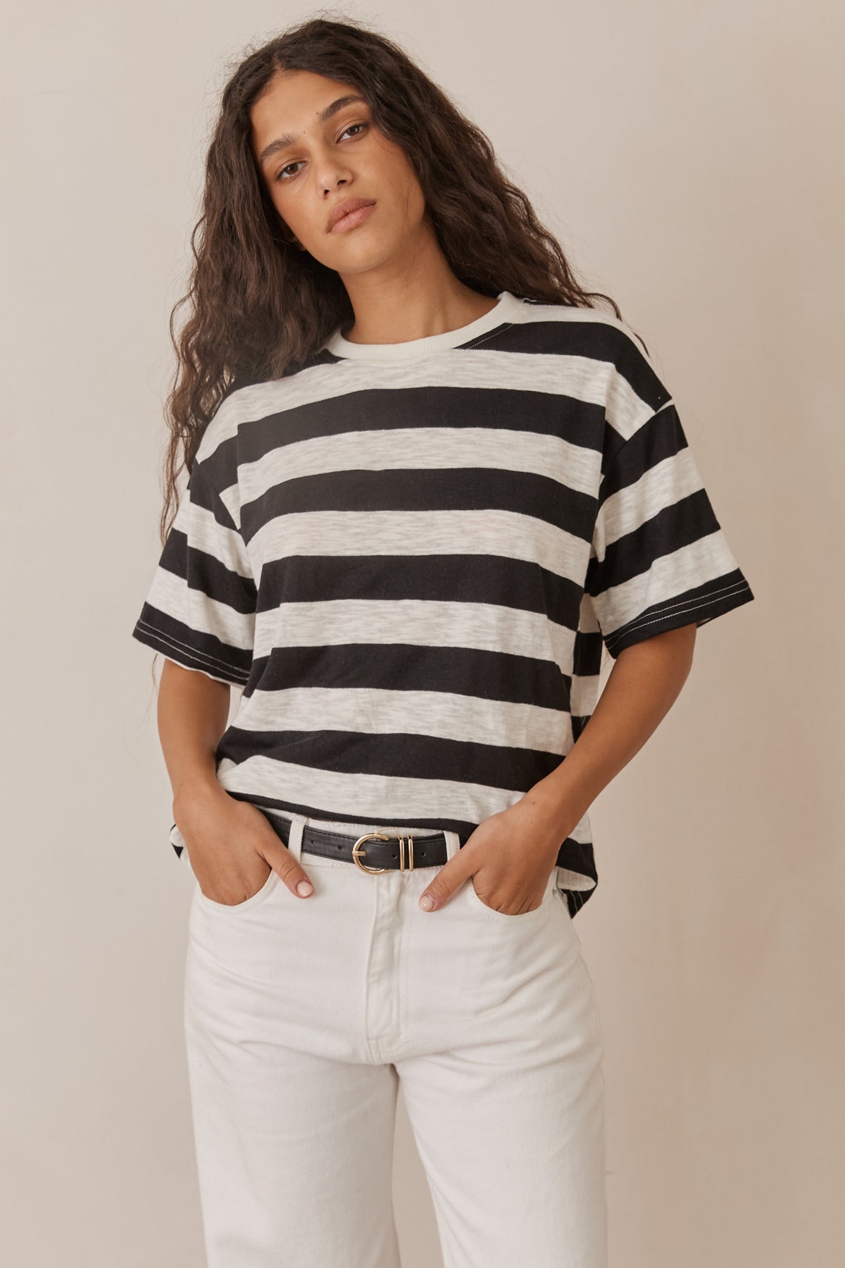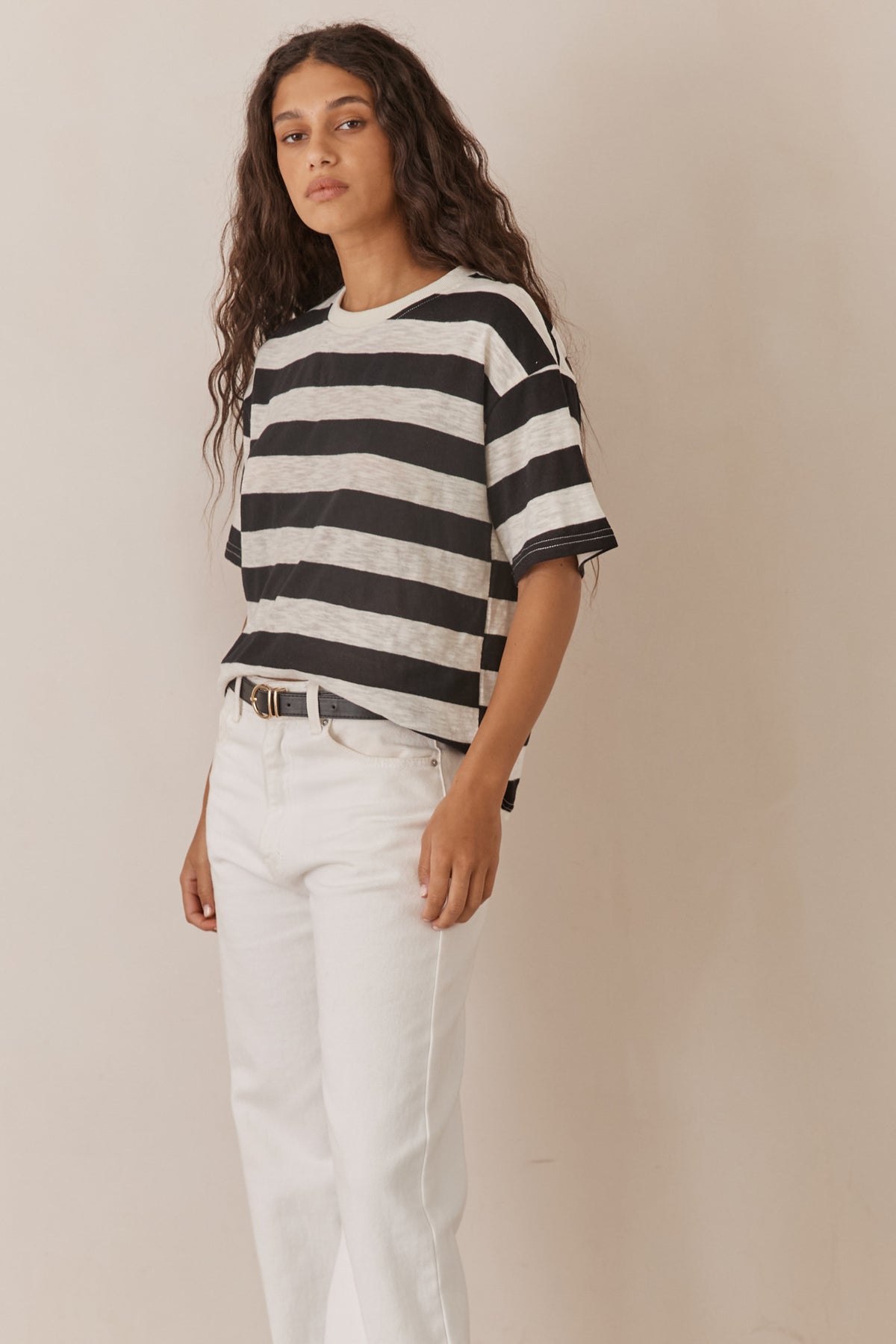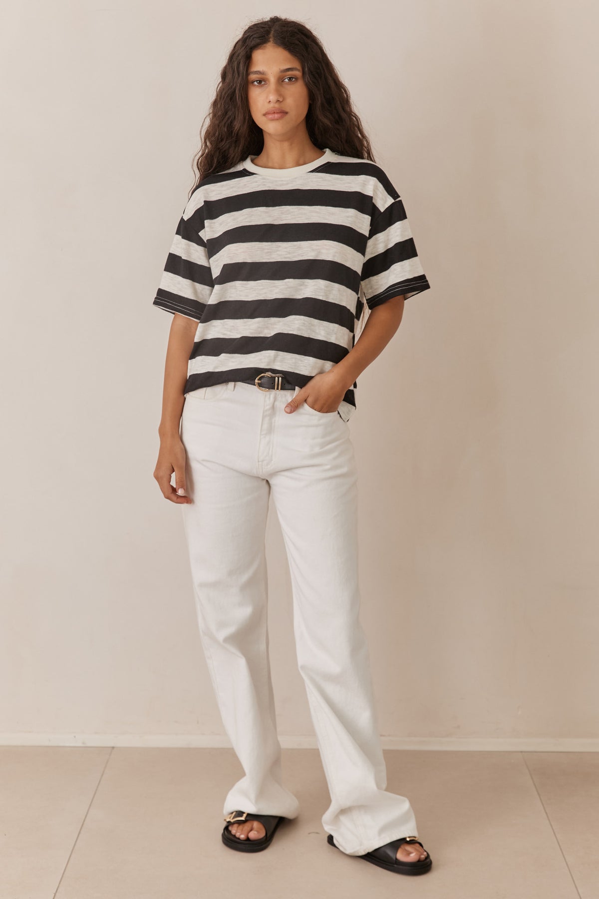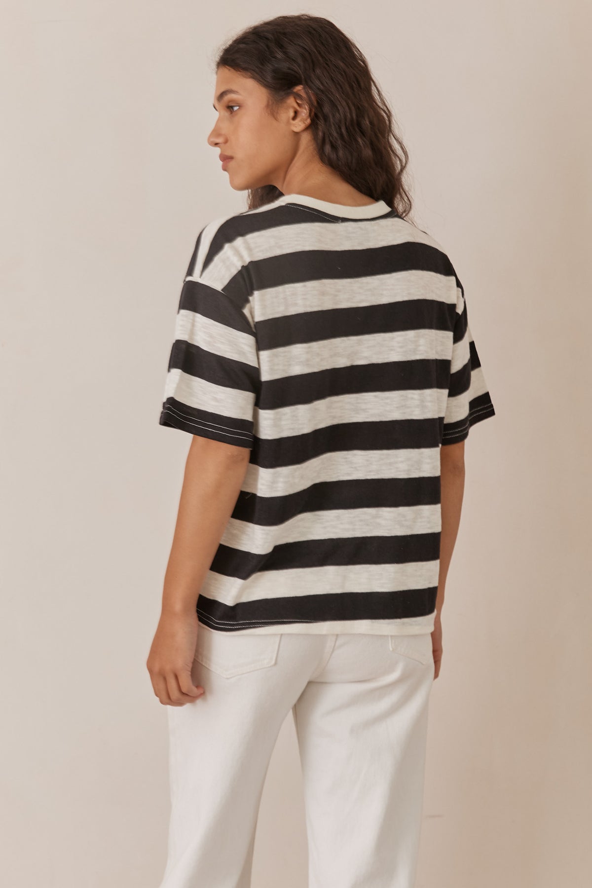 טי שירט שרוול קצר עם צווארון ניקי בשילוב הדפס פסים רחבים