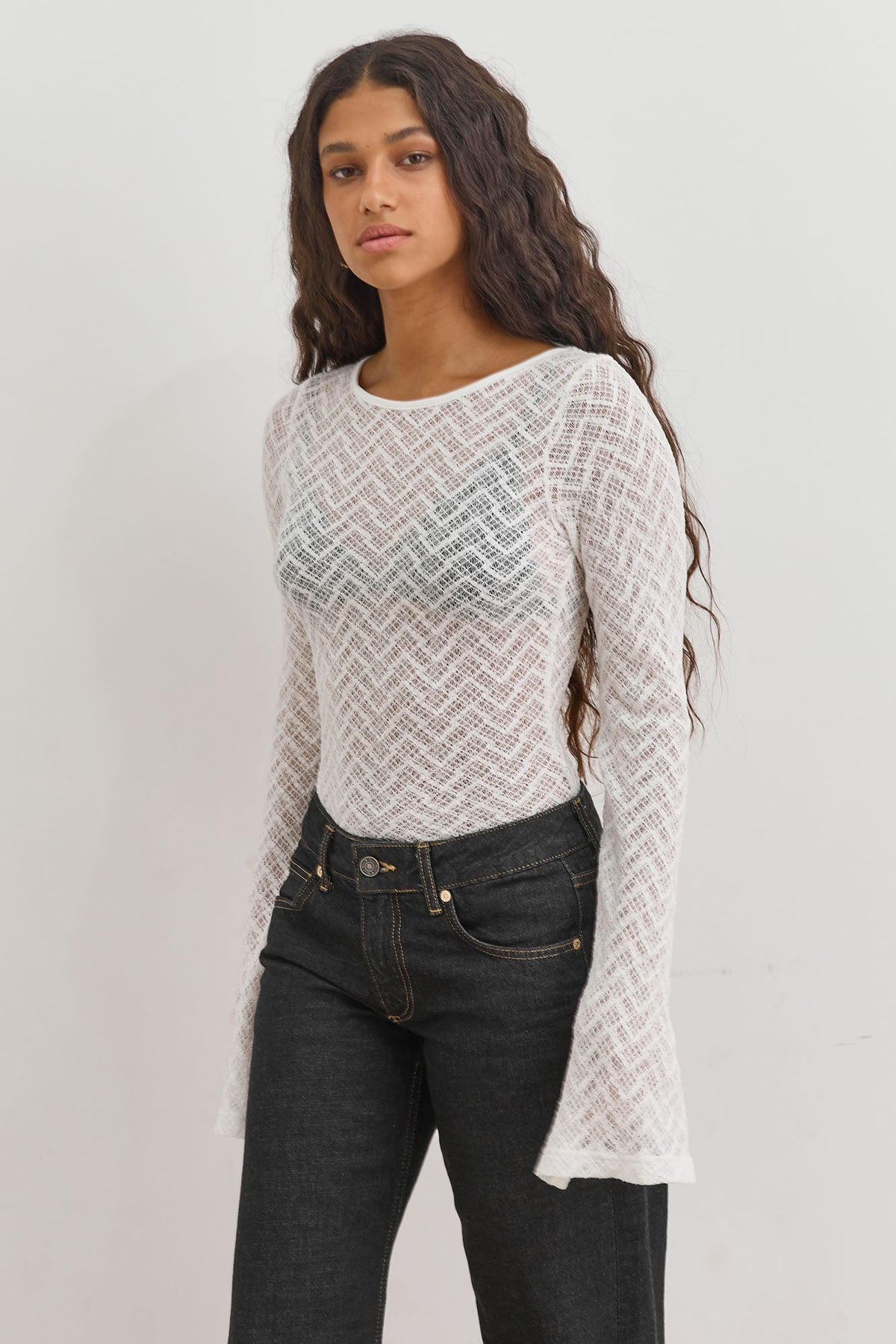חולצה שקפקפה עם טקסטורה ומחשוף מעוגל, שרוולים מתרחבים עם שסע, מחשוף גב וסגירת קשירה