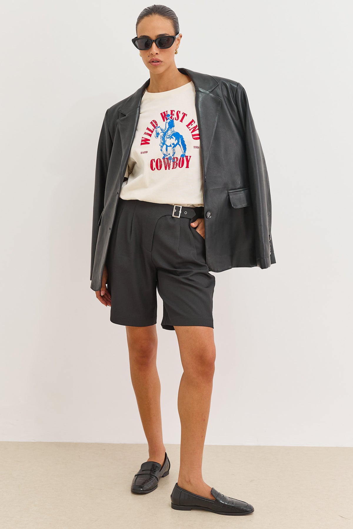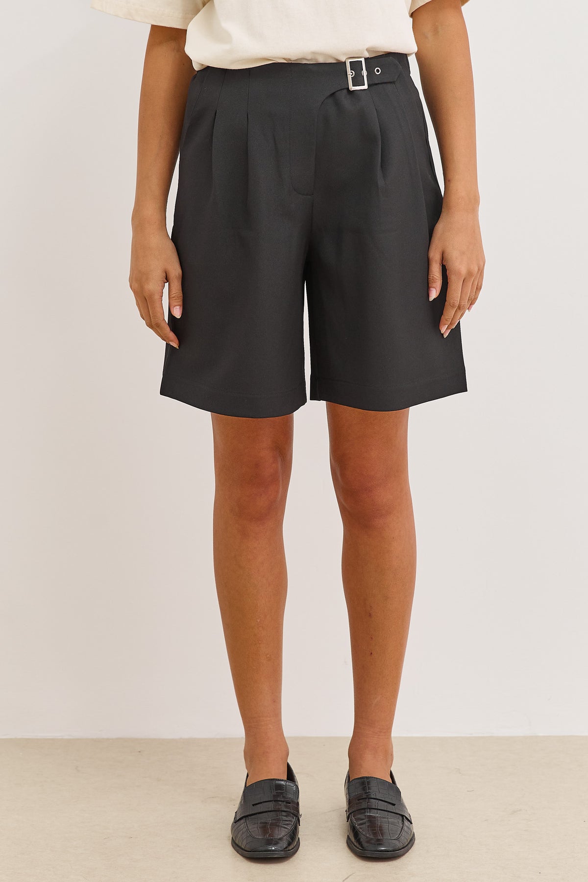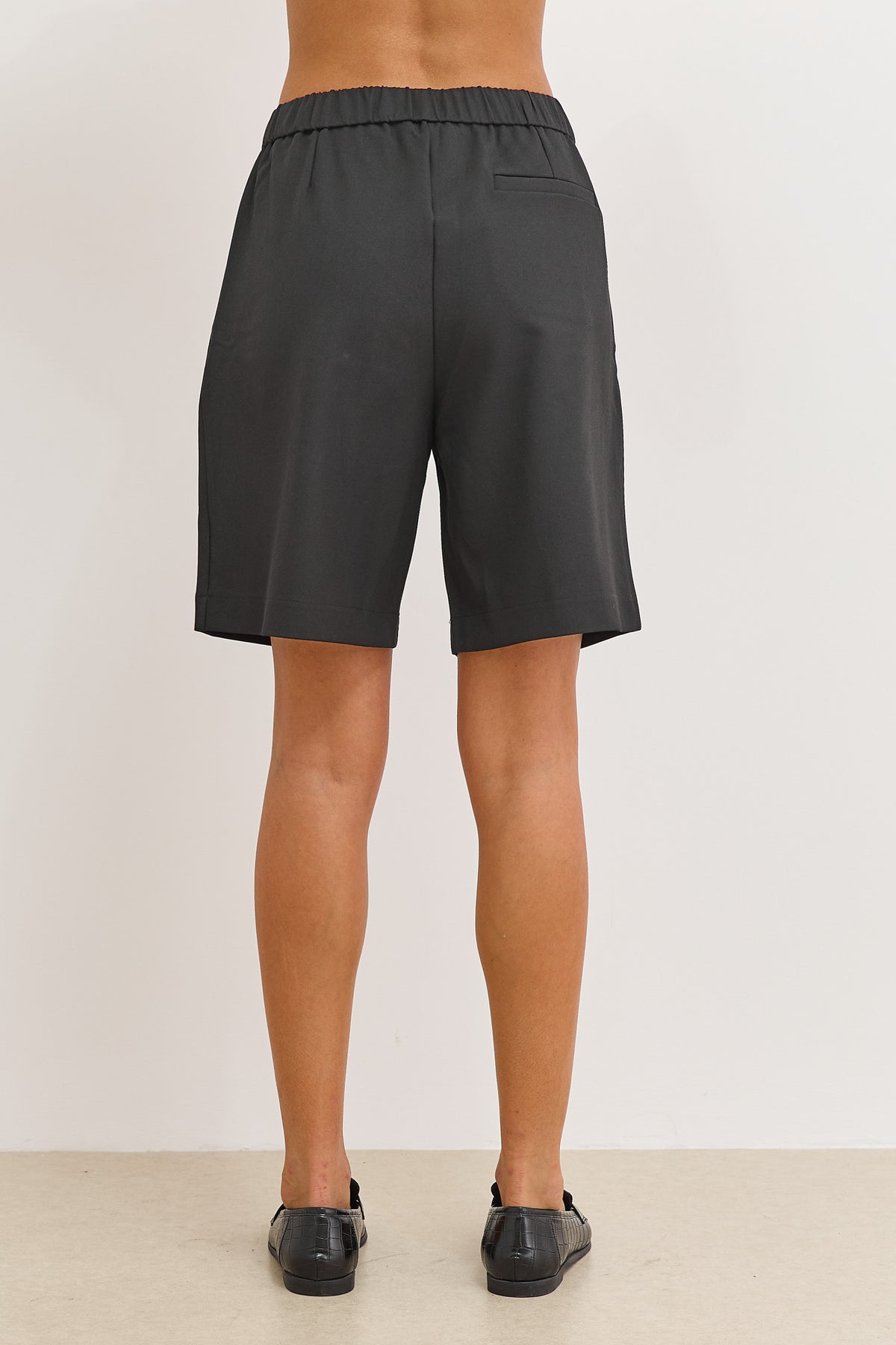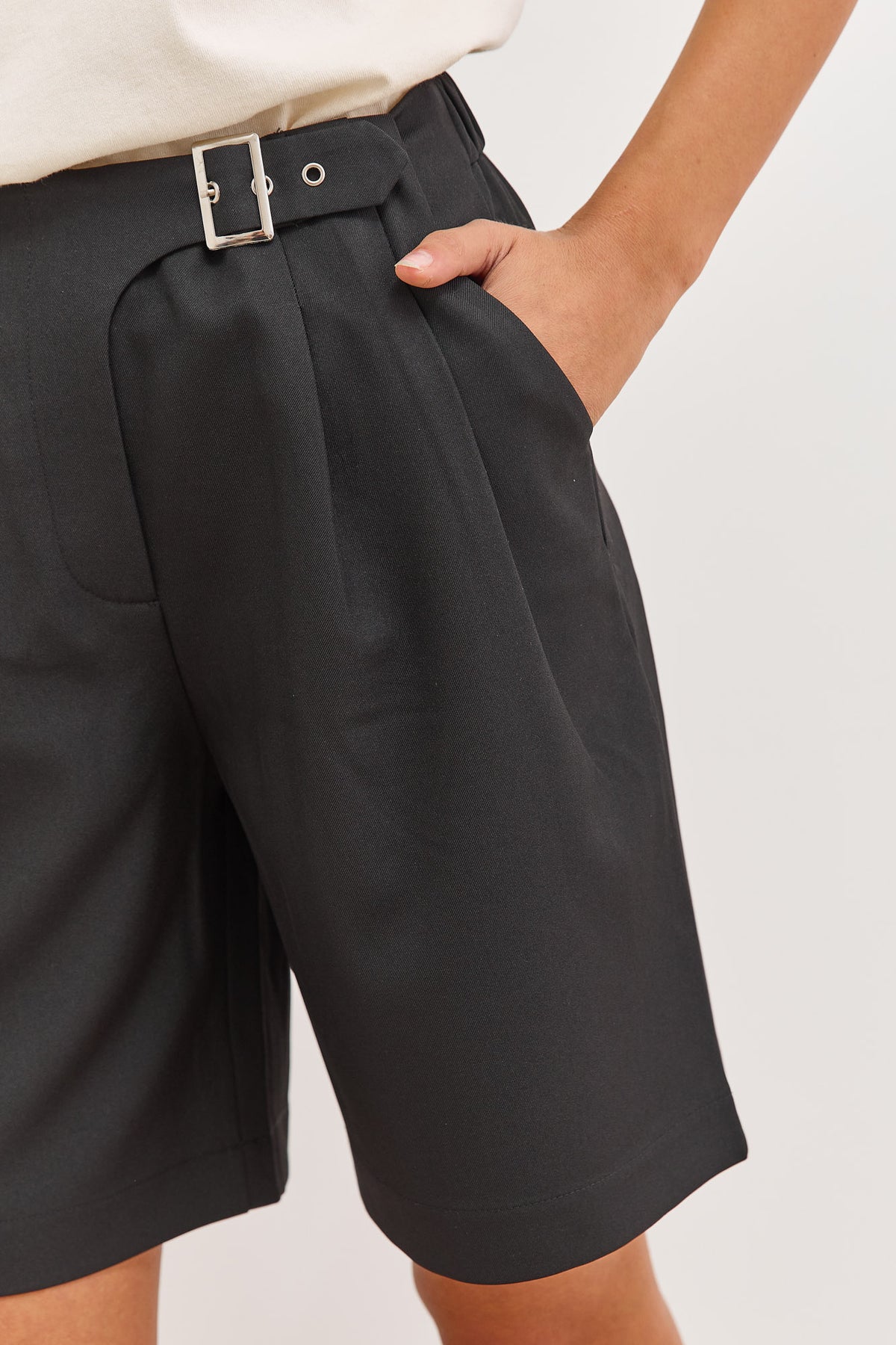 מכנסי ברמודה בגזרה מחוייטת עם כיסים גומי במותן וחגורה צידית עם אבזם כסוף