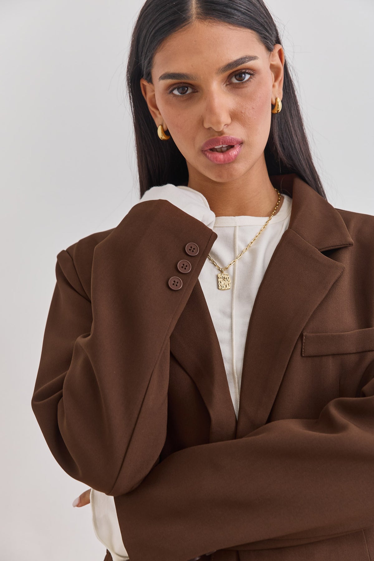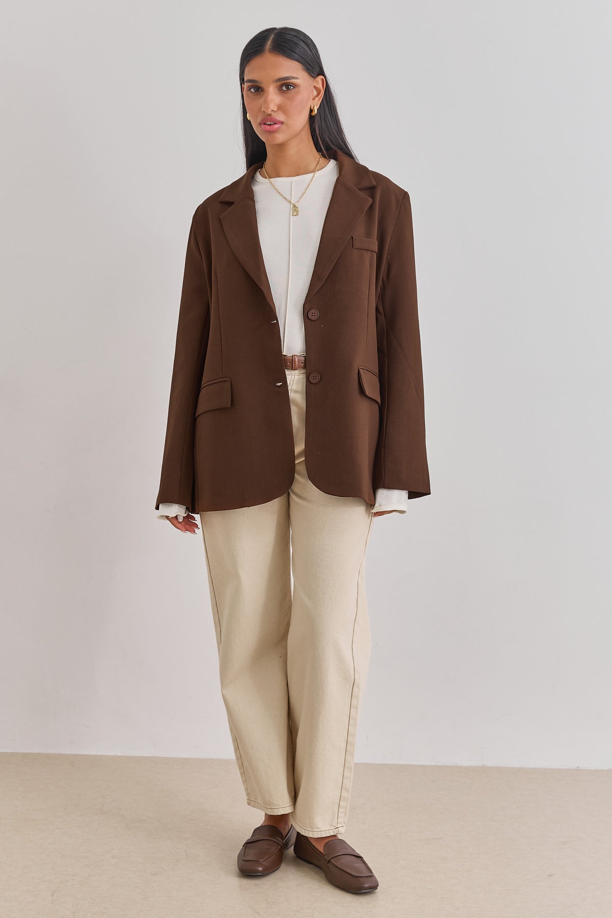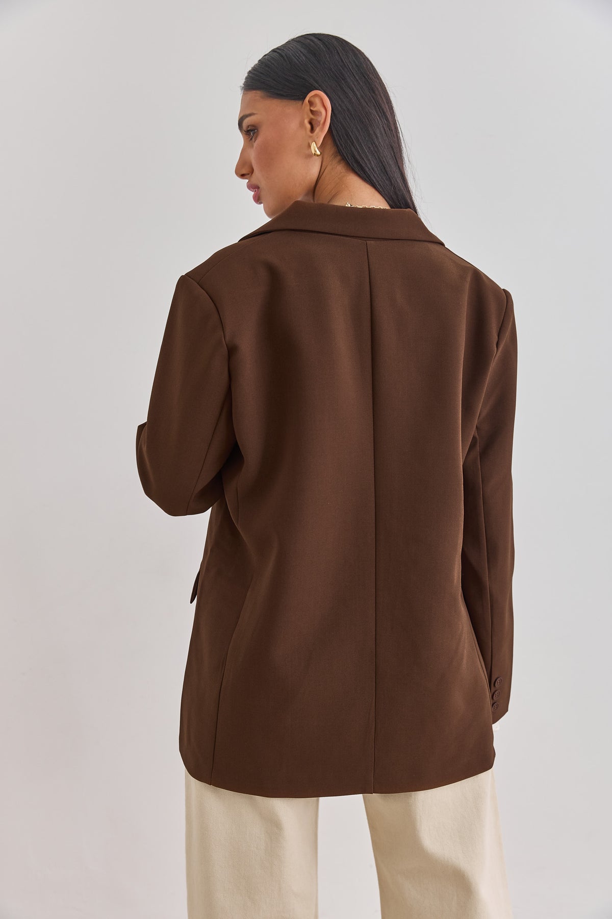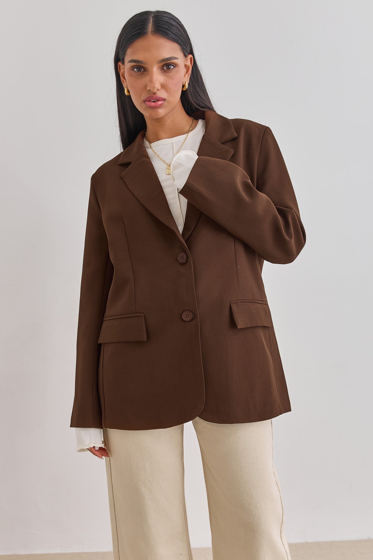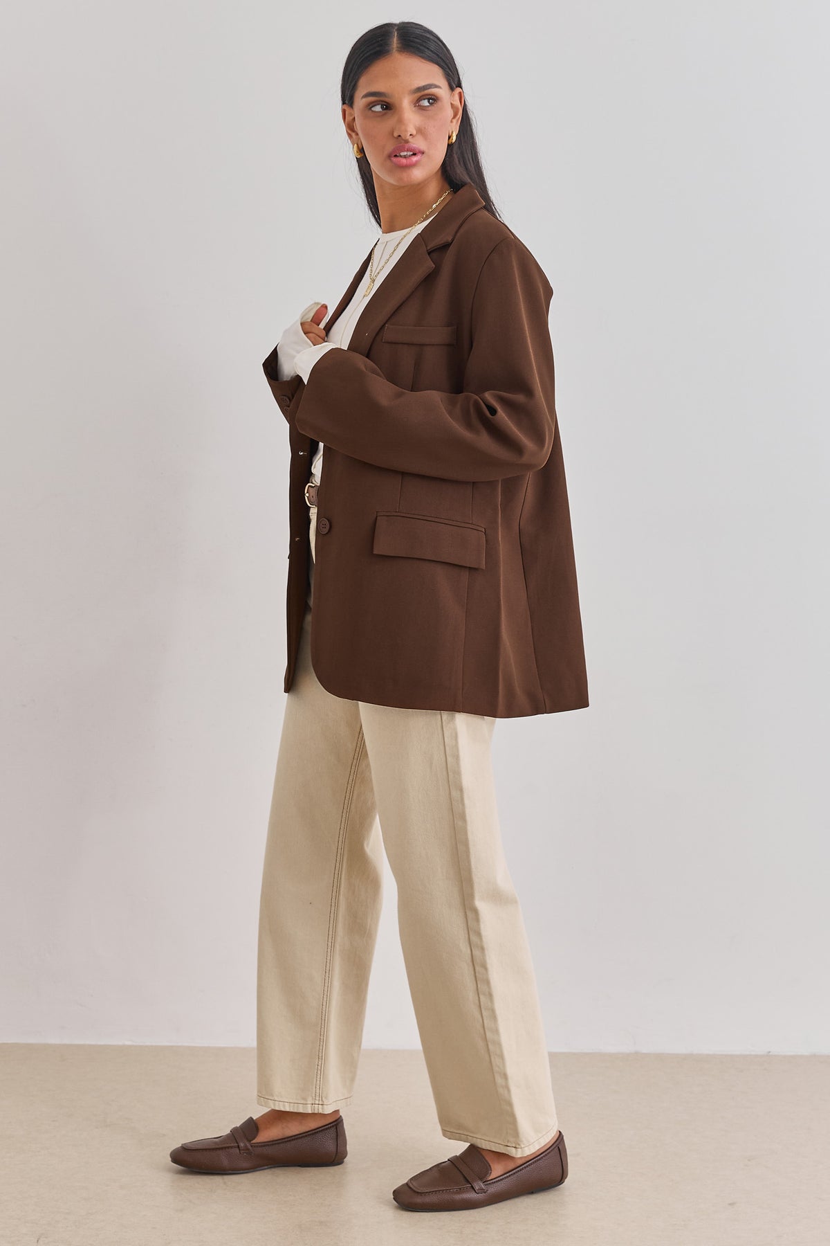 בלייזר מחויט בגזרת אוברסייז בשילוב כפתורים וכיסים קדמיים