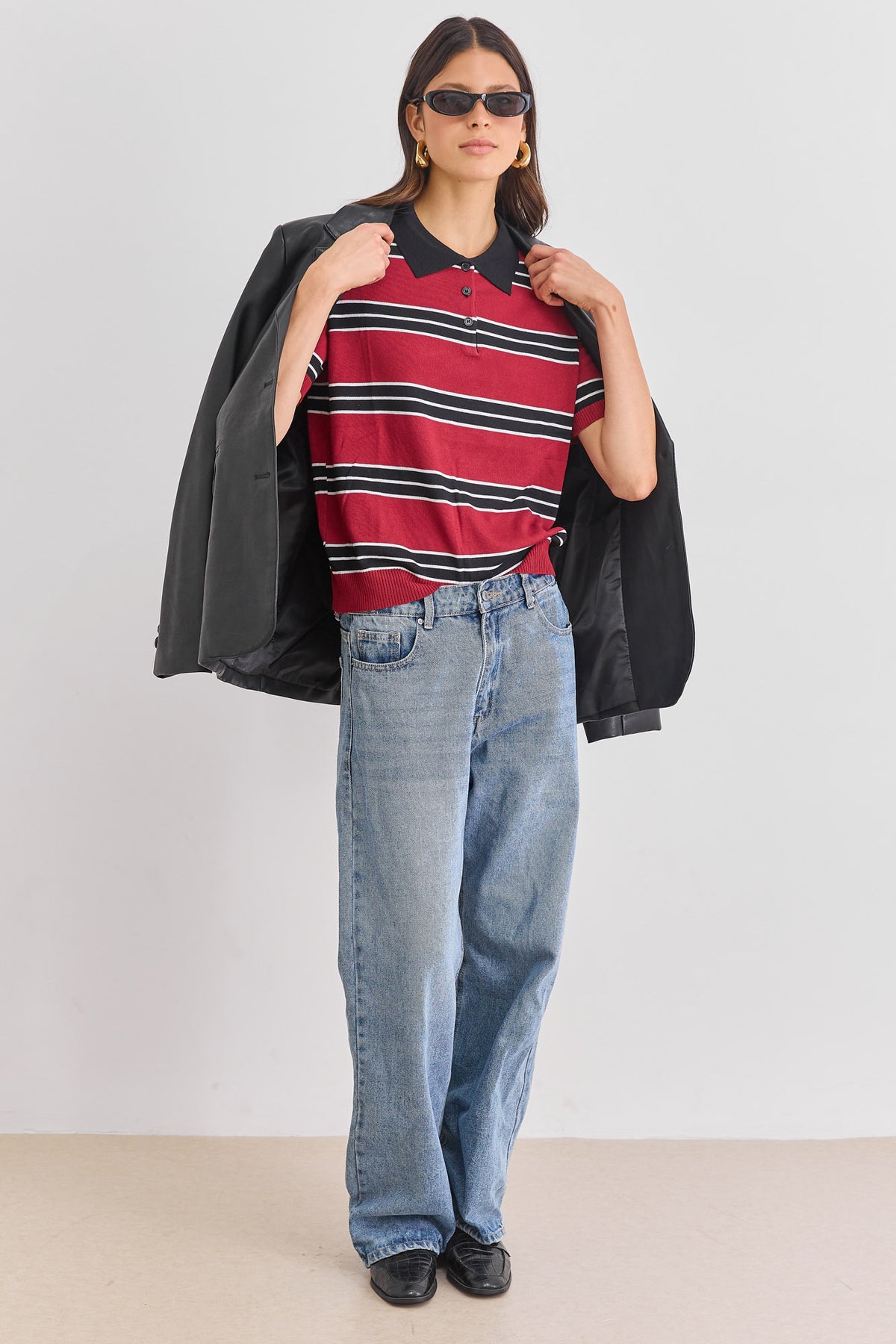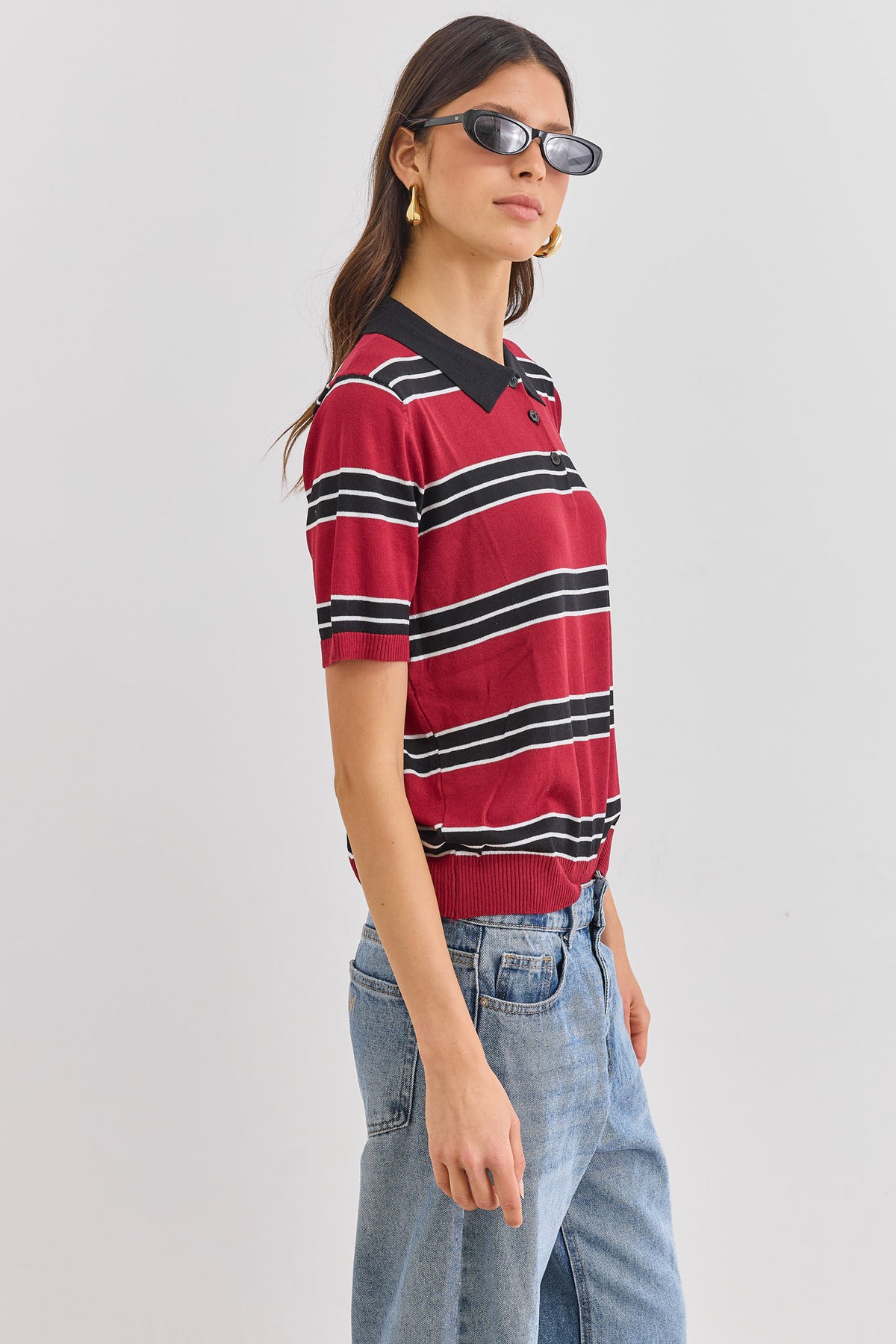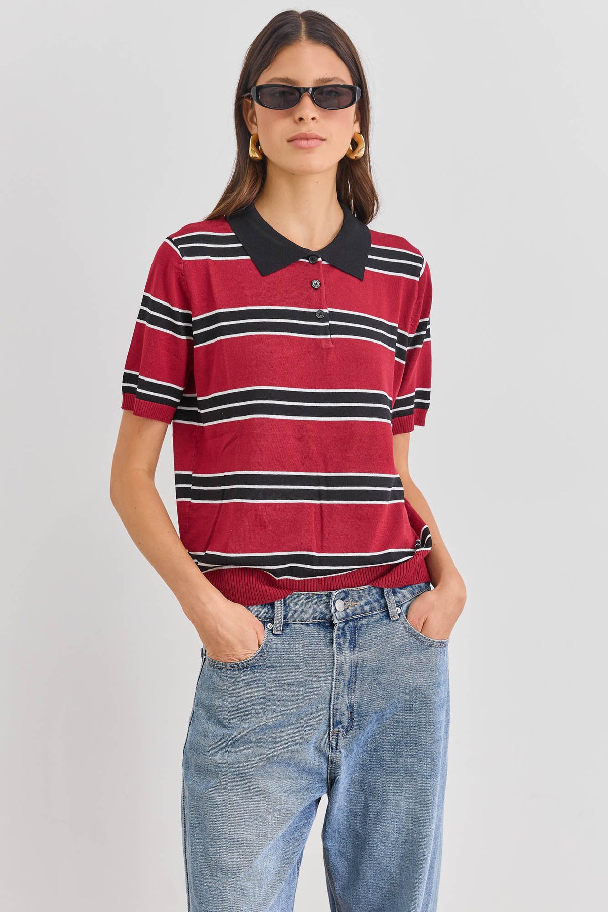 חולצת צווארון פולו מבד סריג דק עם כפתורים בחלק עליון ודוגמת פסים