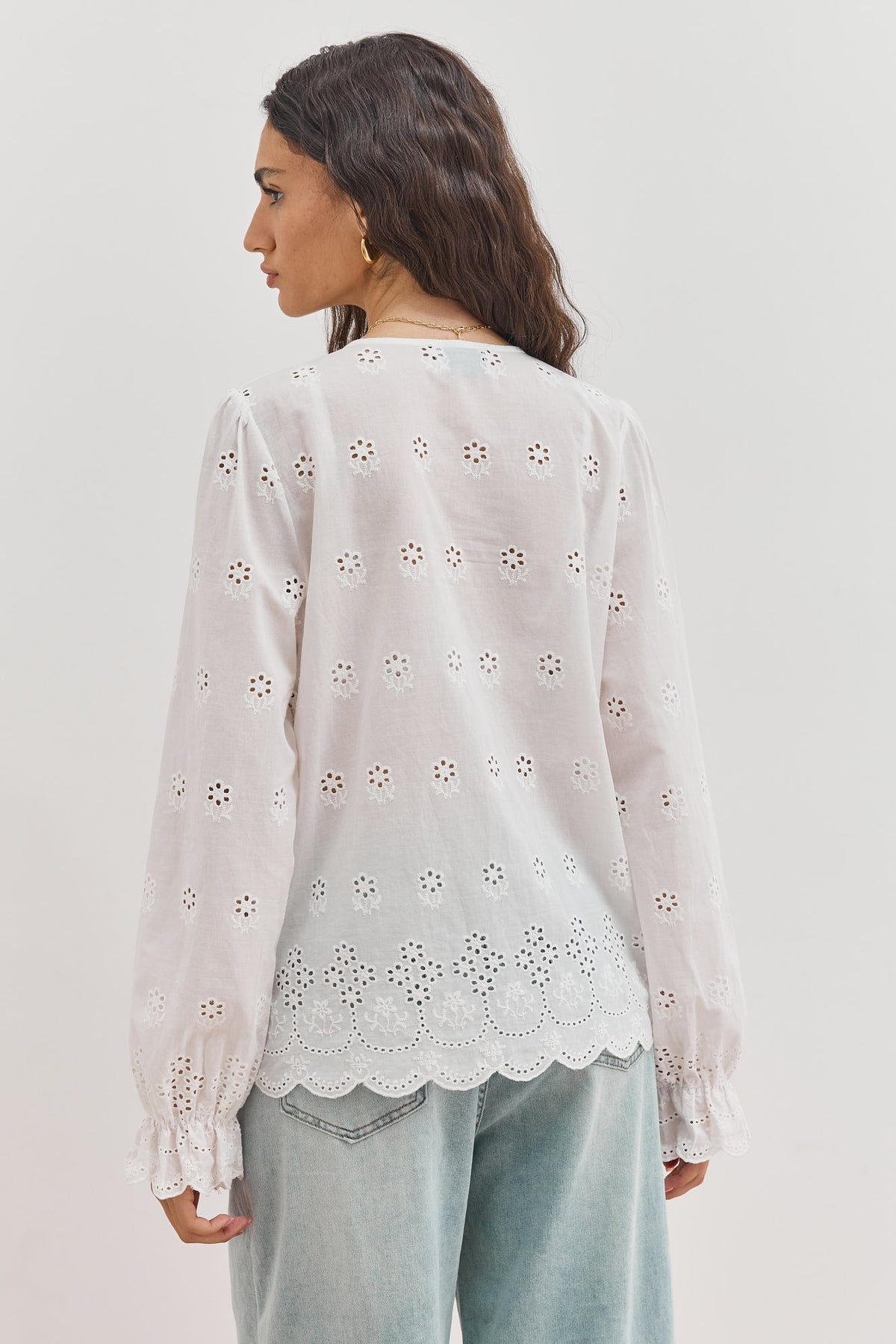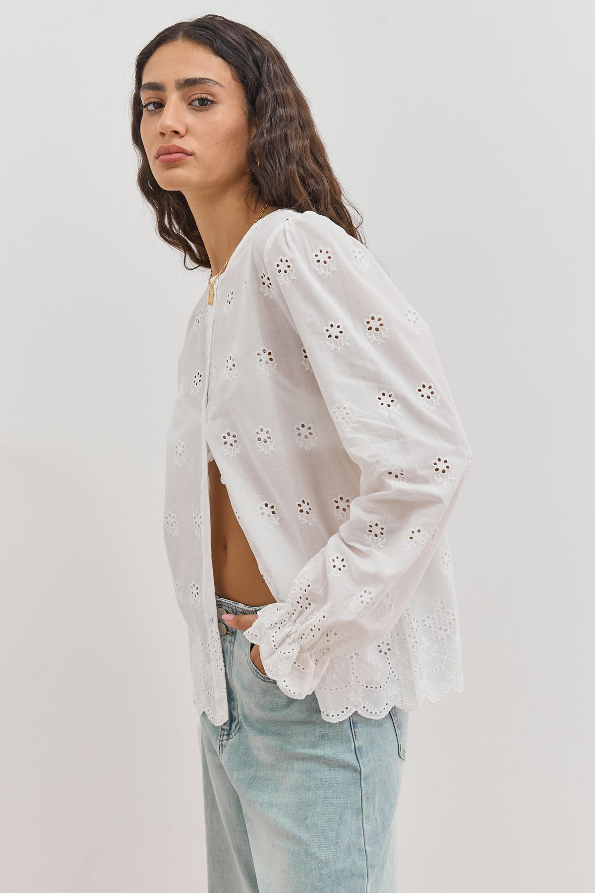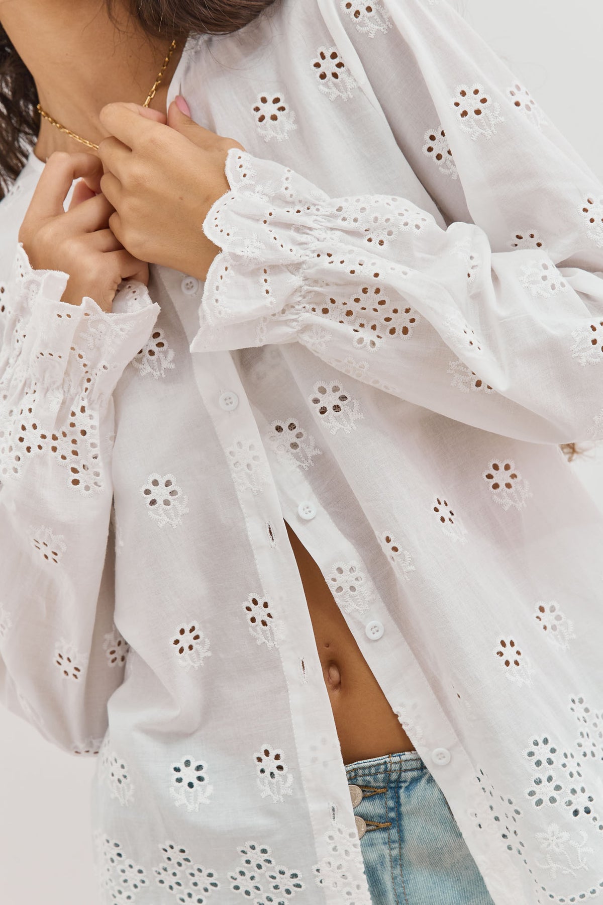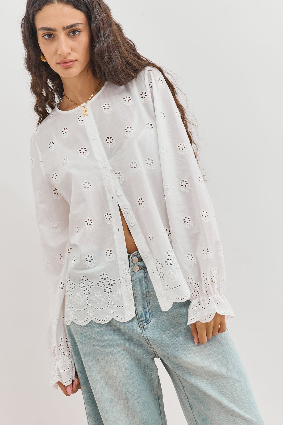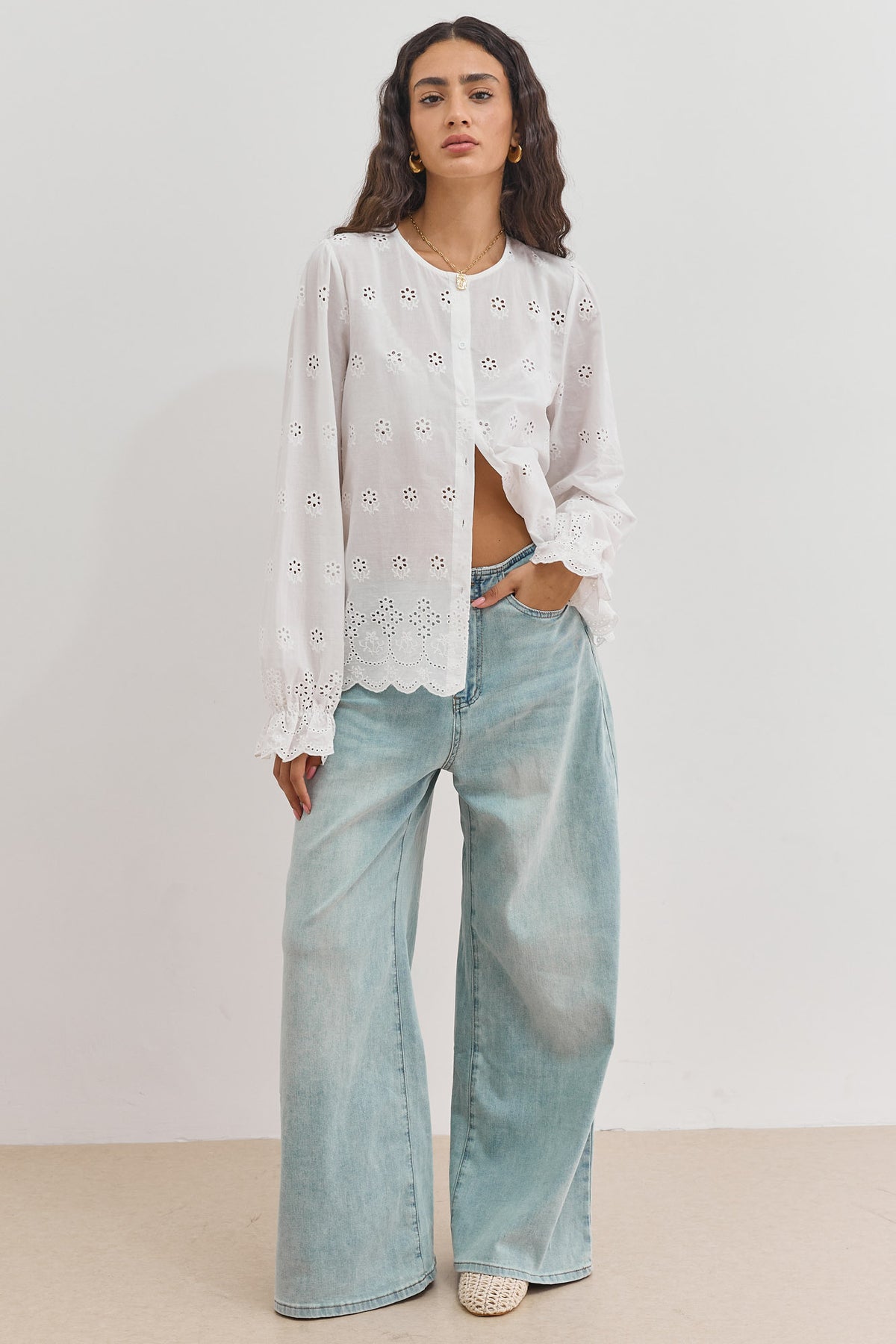 חולצה מכופתרת מבד רקמה עם עיטורים סיומת גלים וגומי בשרוול