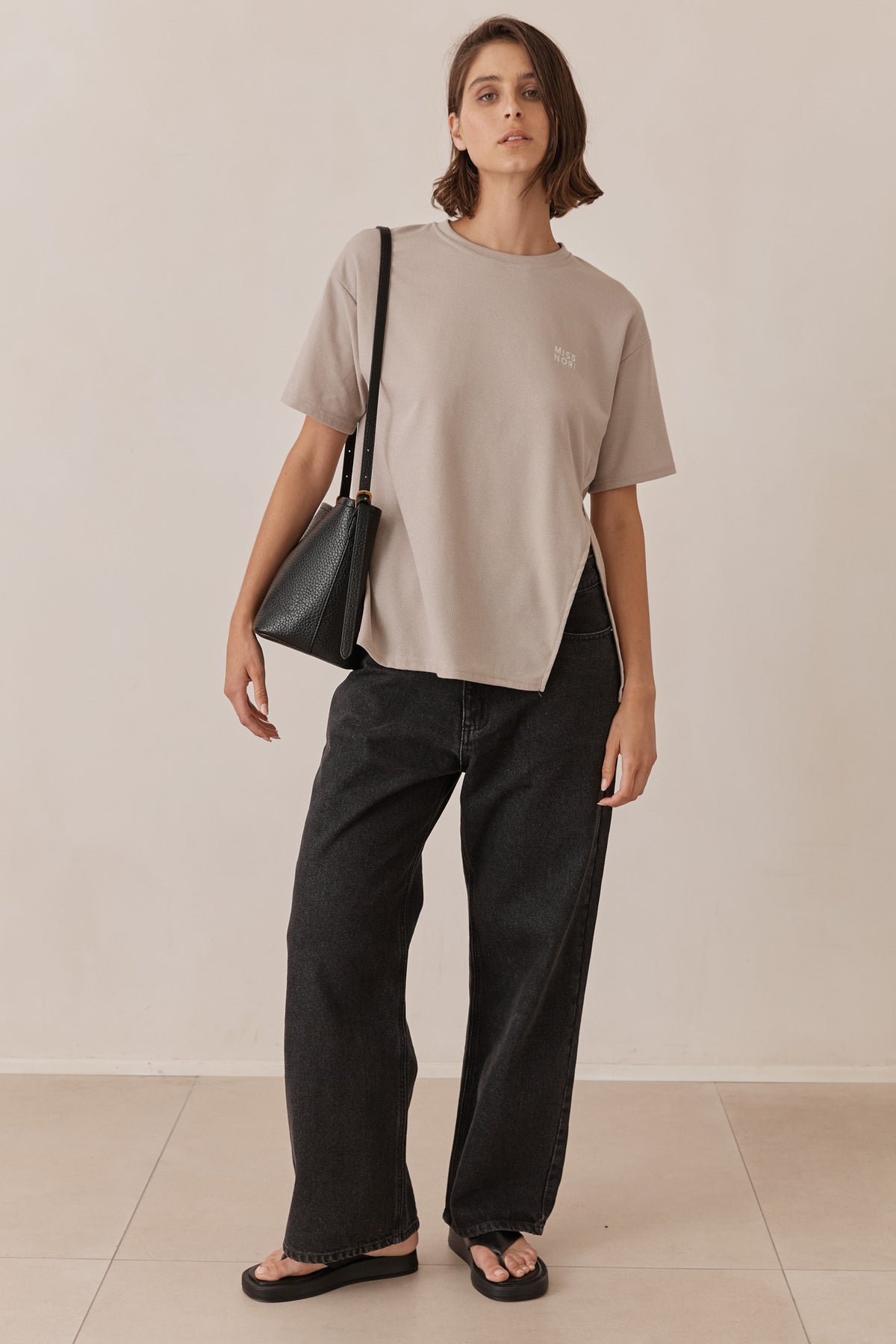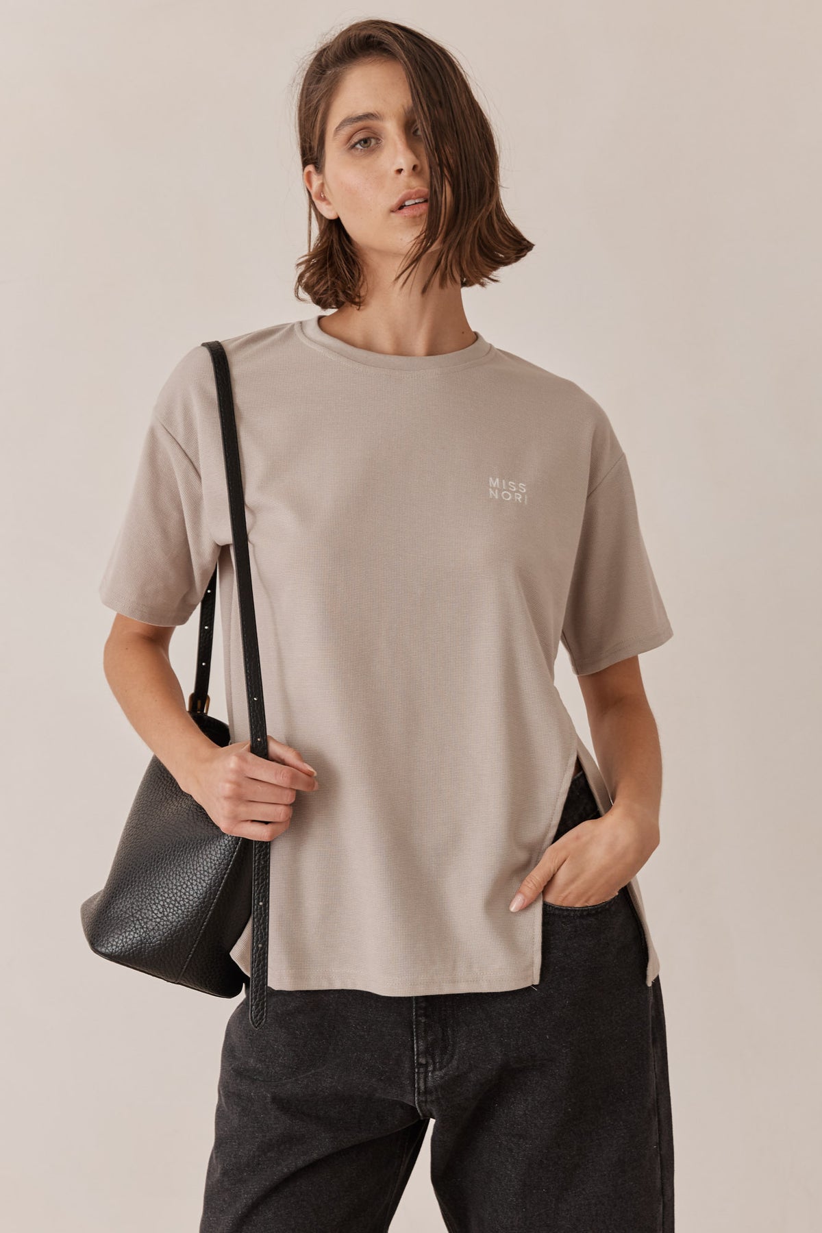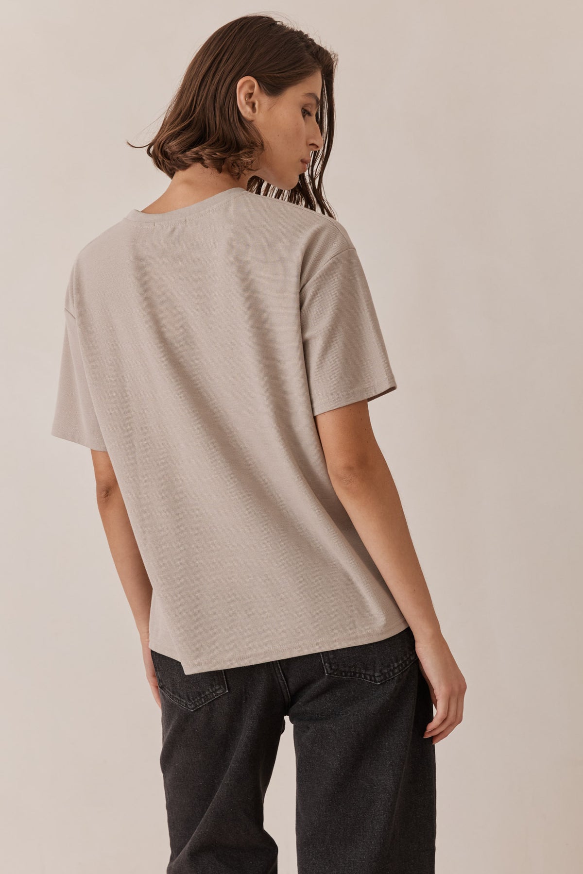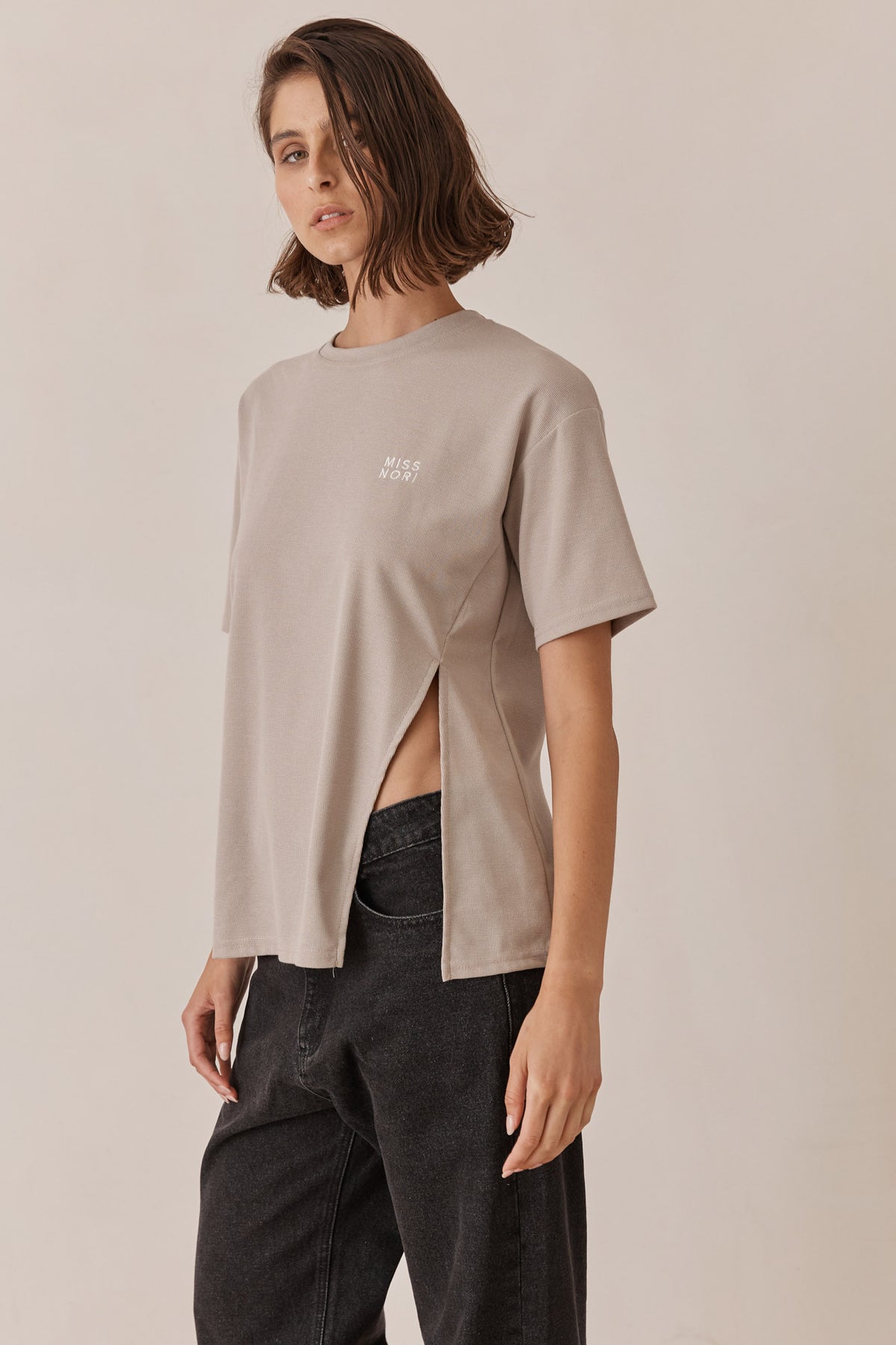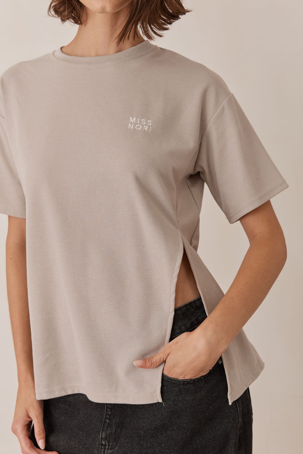 טי שירט מבד וופל בשילוב רקמת לוגו ושסע צידי