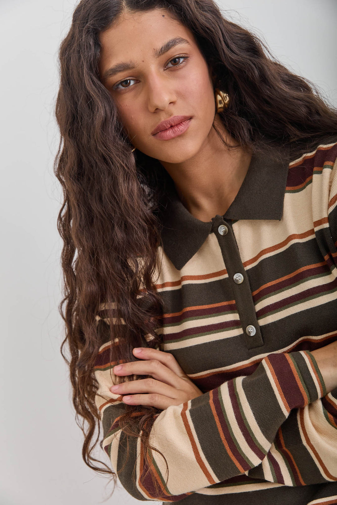 סריג צ'לסי סטרייפס צווארון פולו | בז'/ירוק זית