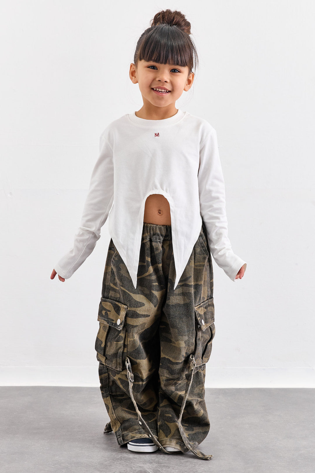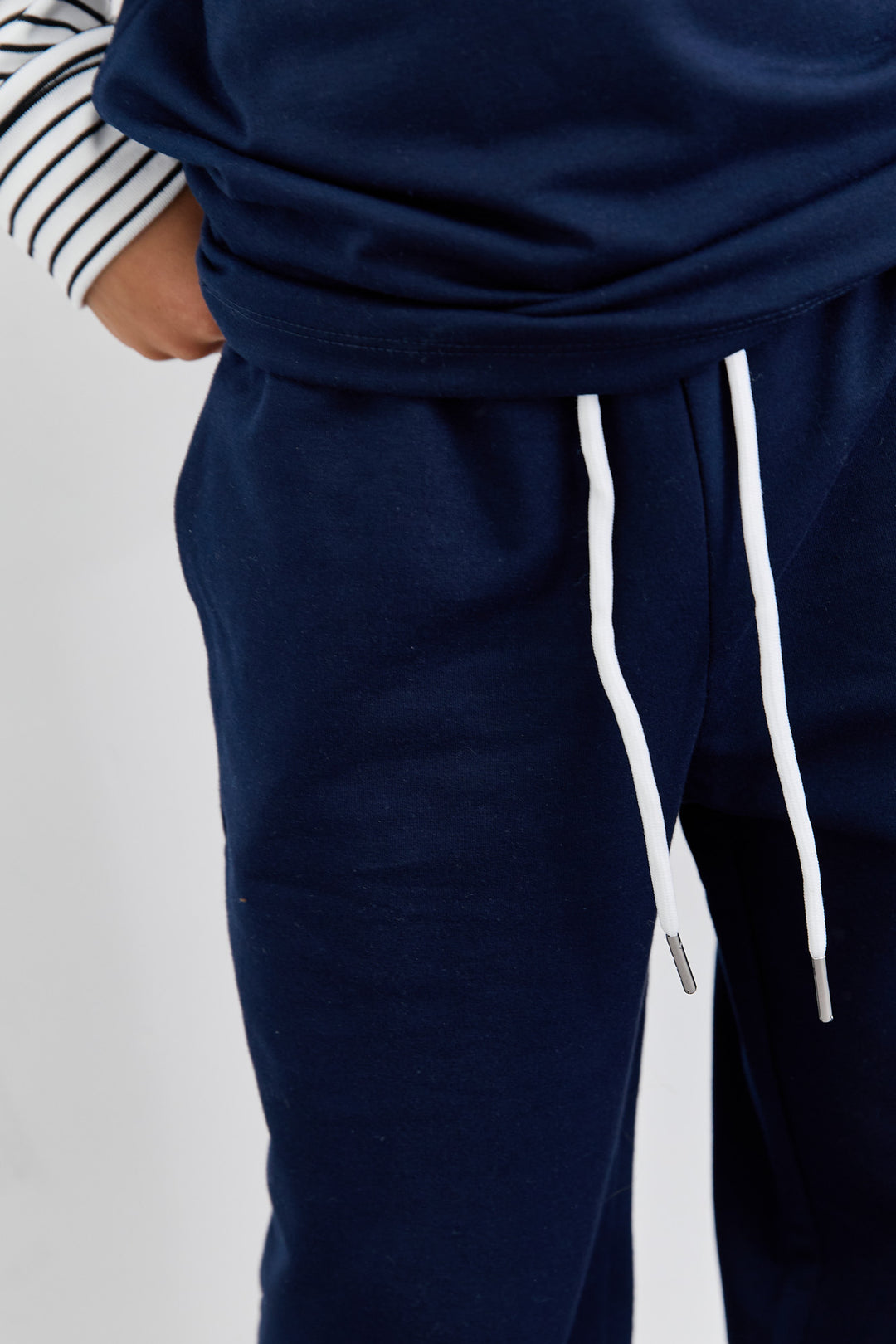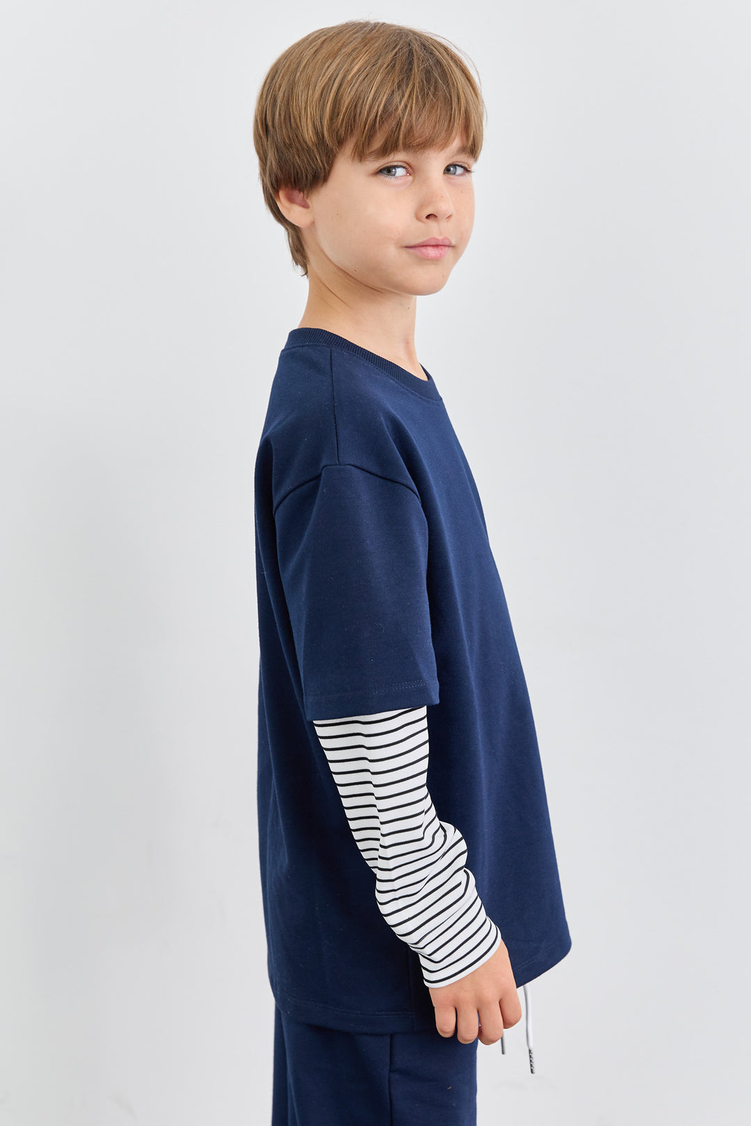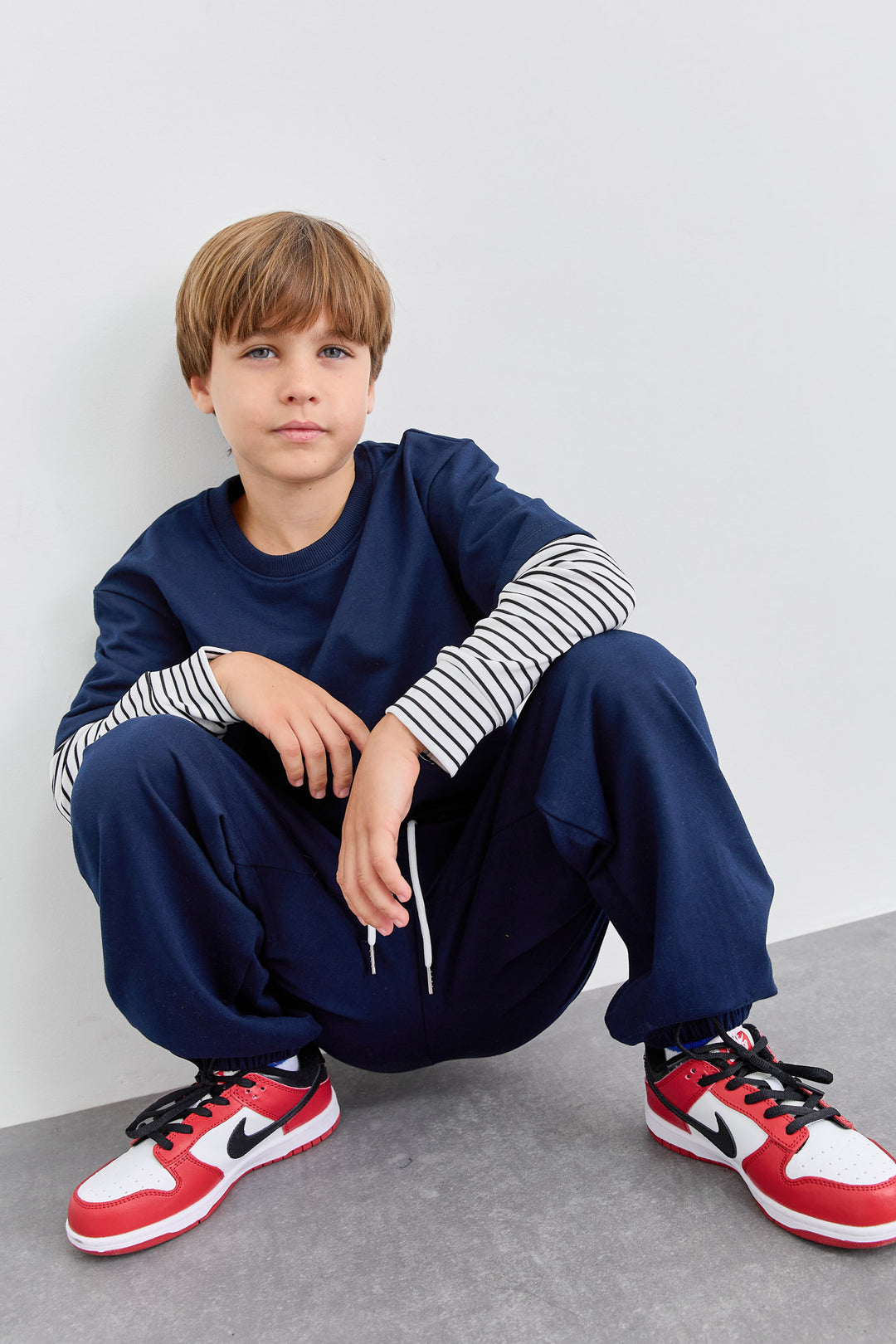 חליפת שני חלקים טי שירט שרוול ארוך בד משולב ומכנסי בלון | כחול