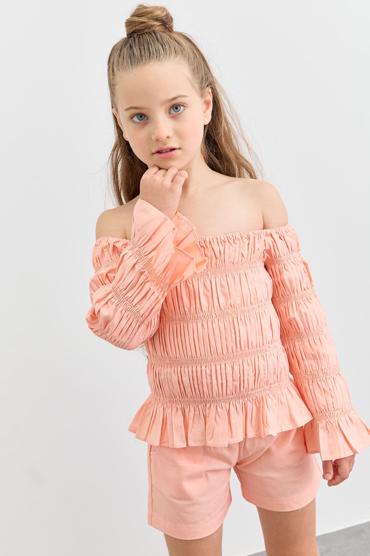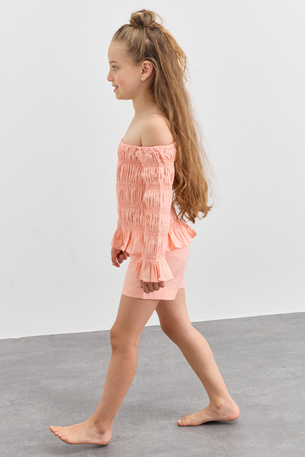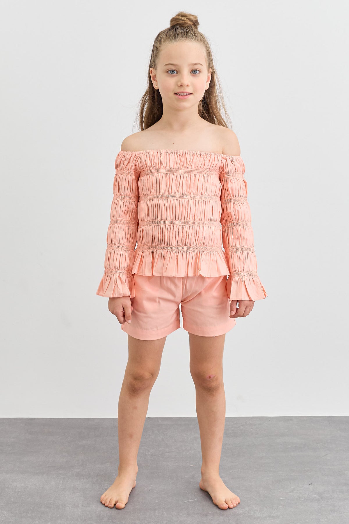 חליפה הנמכרת כסט וכוללת חולצת כיווצים בגזרת אוף שולדרס עם שרוולים בסיומת מתרחבת ומכנסיים קצרים תואמים עם גומי במותן וכיסים
