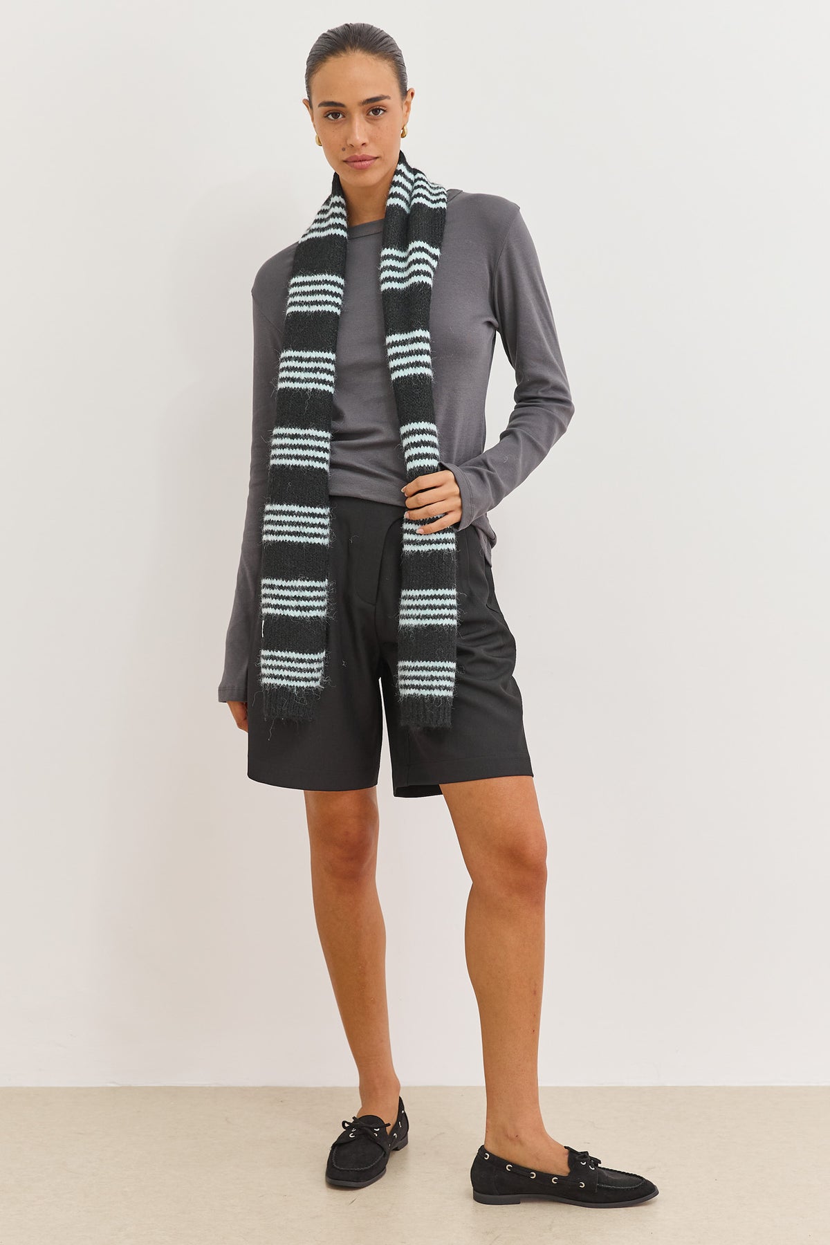 צעיף מבד אריג צמר דק בדוגמת פסים בשילוב פאץ' לוגו