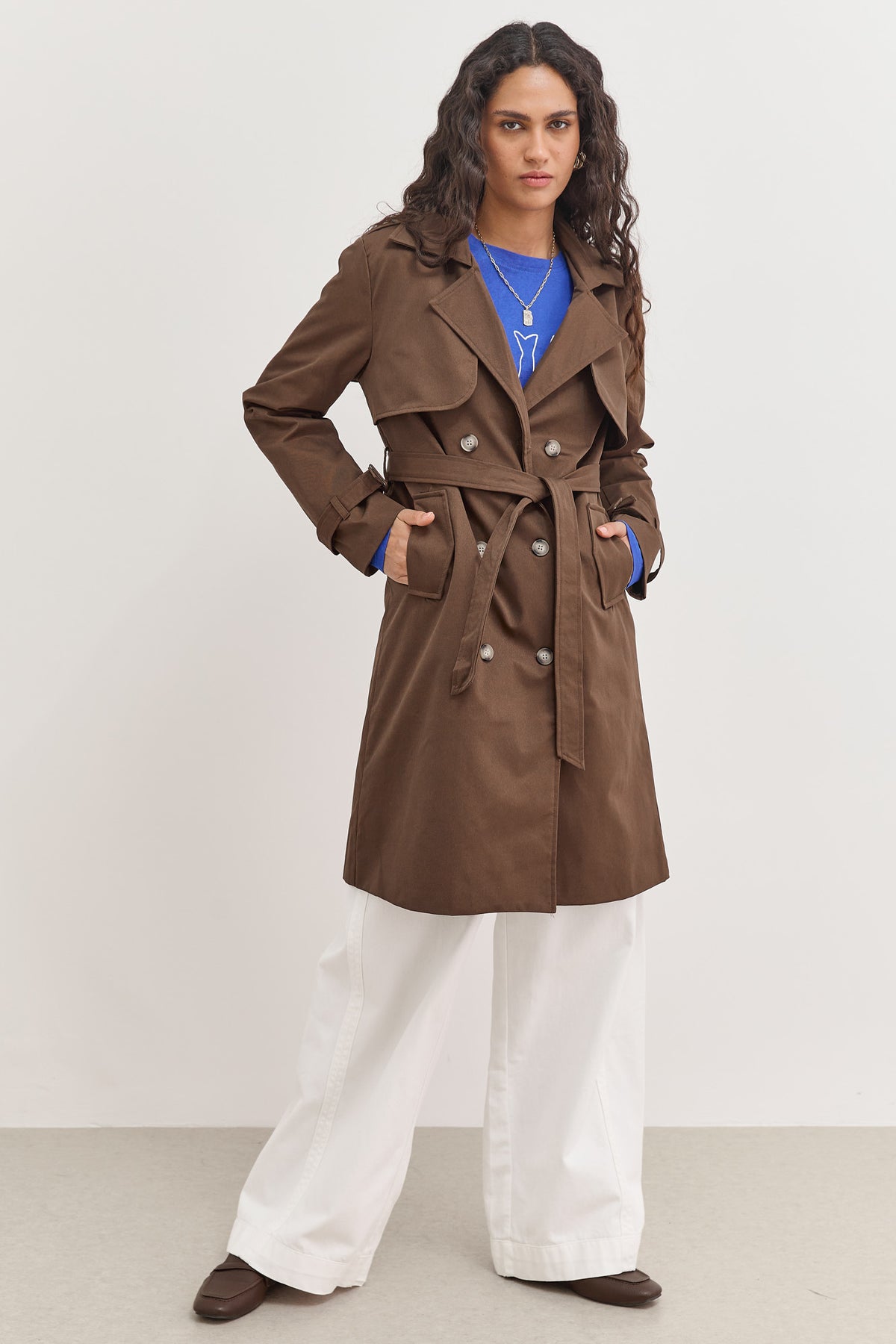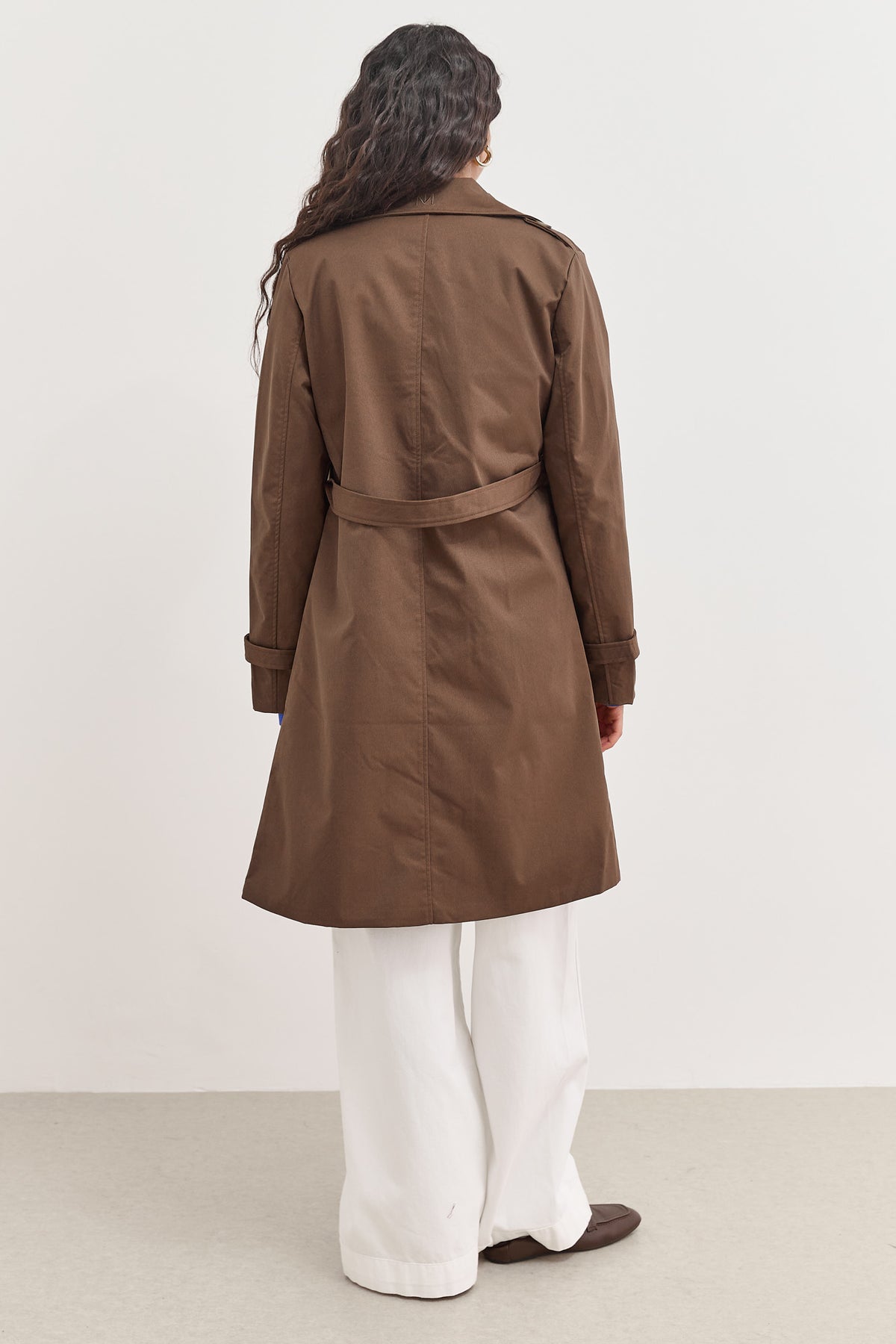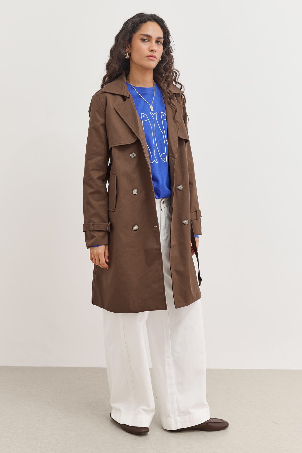 מעיל טראנץ׳ ארוך בעל בטנה עם הדפסי לוגו בשילוב רקמת לוגו בצווארון עם כפתורים וחגורת קשירה