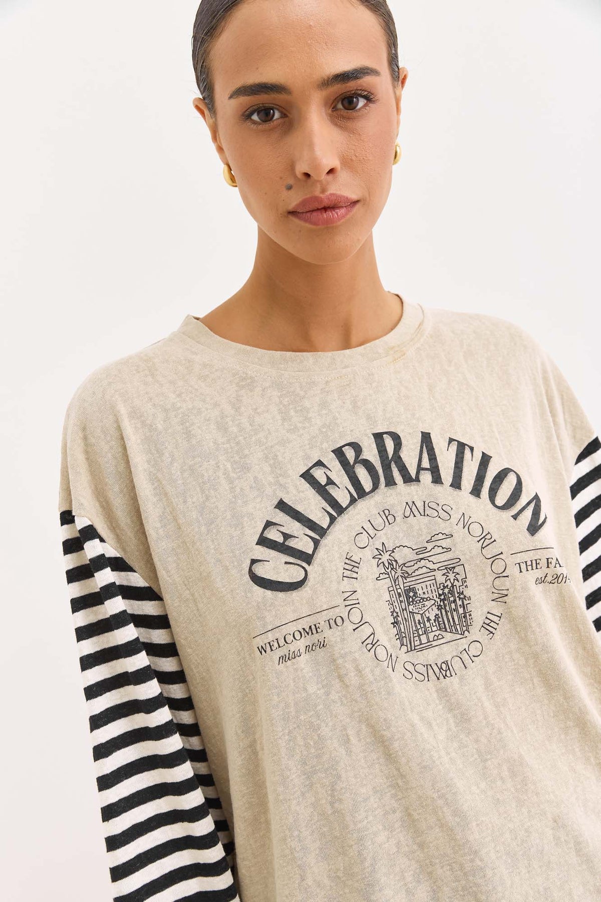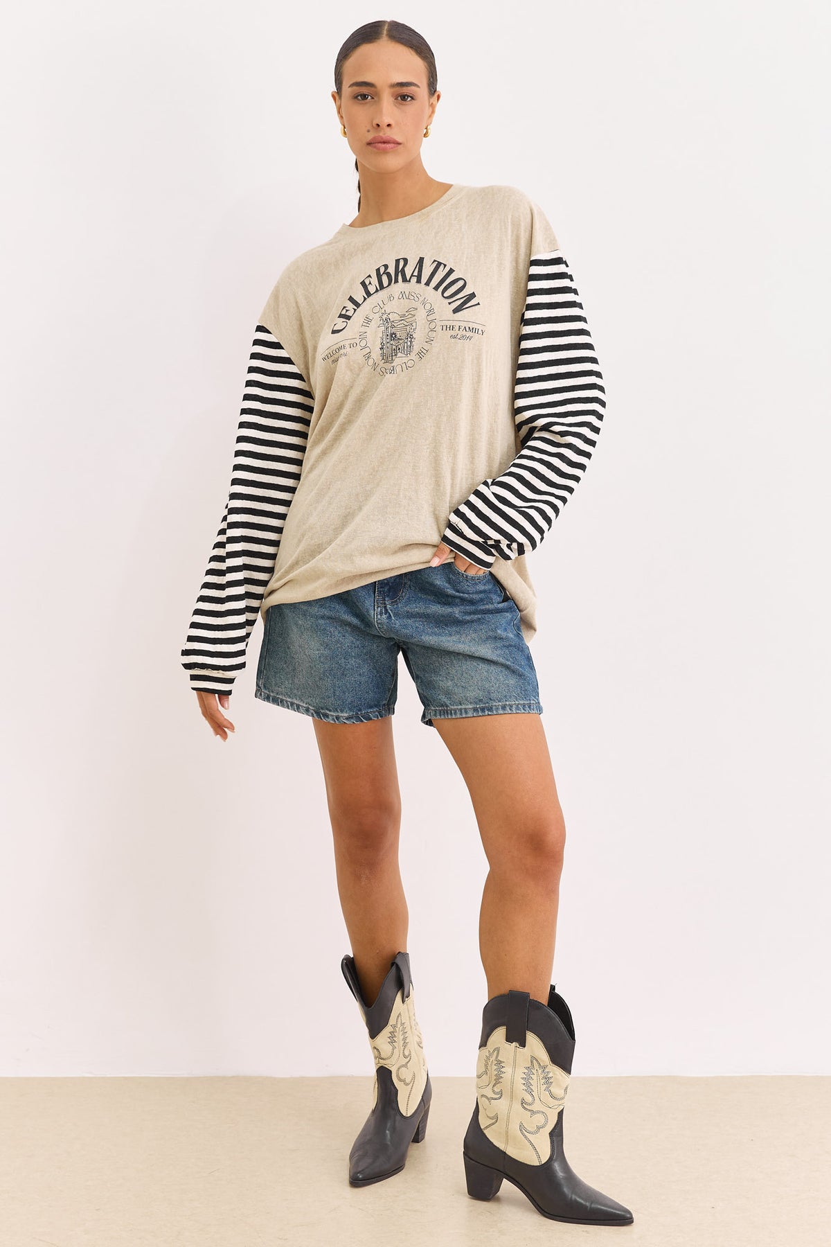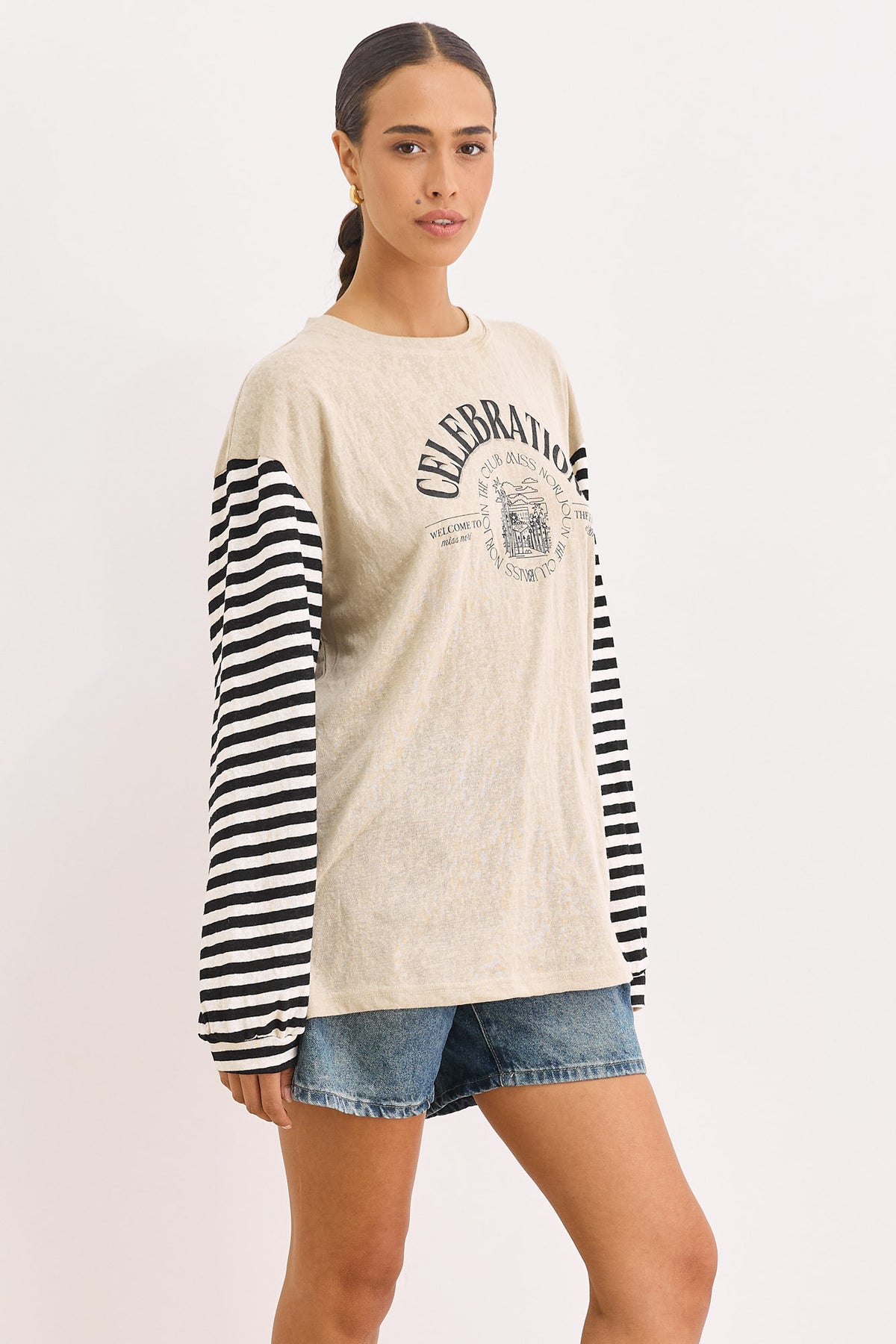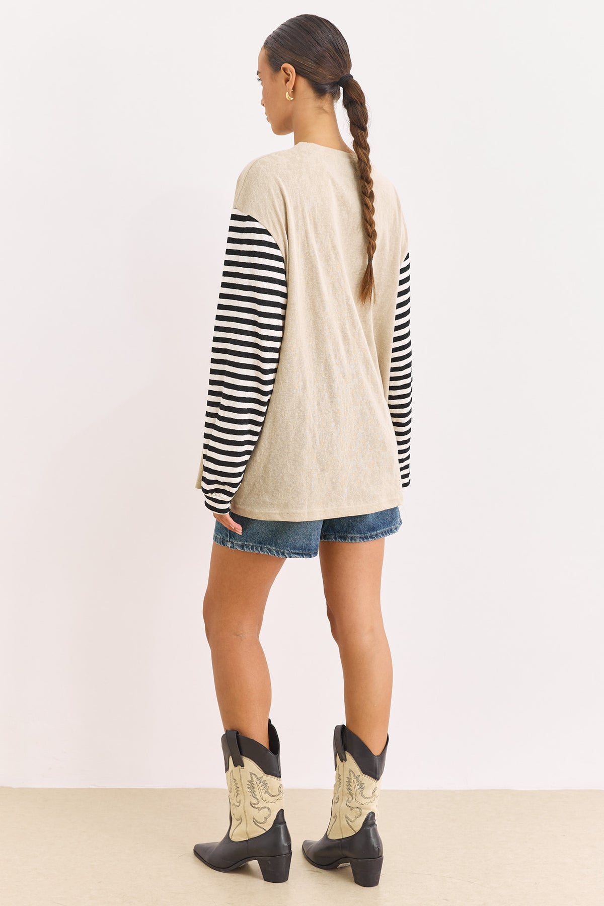 חולצת טוניקה דקה בשילוב פרינט, שרוולים ארוכים בהדפס פסים ומחשוף ניקי