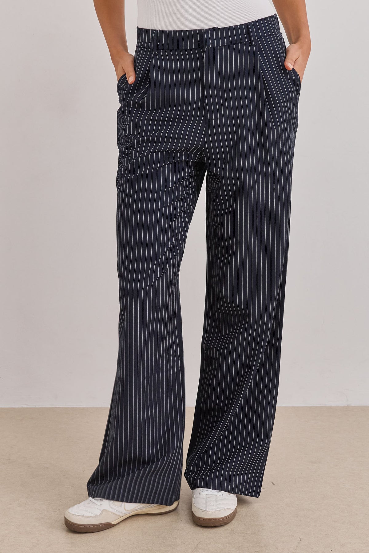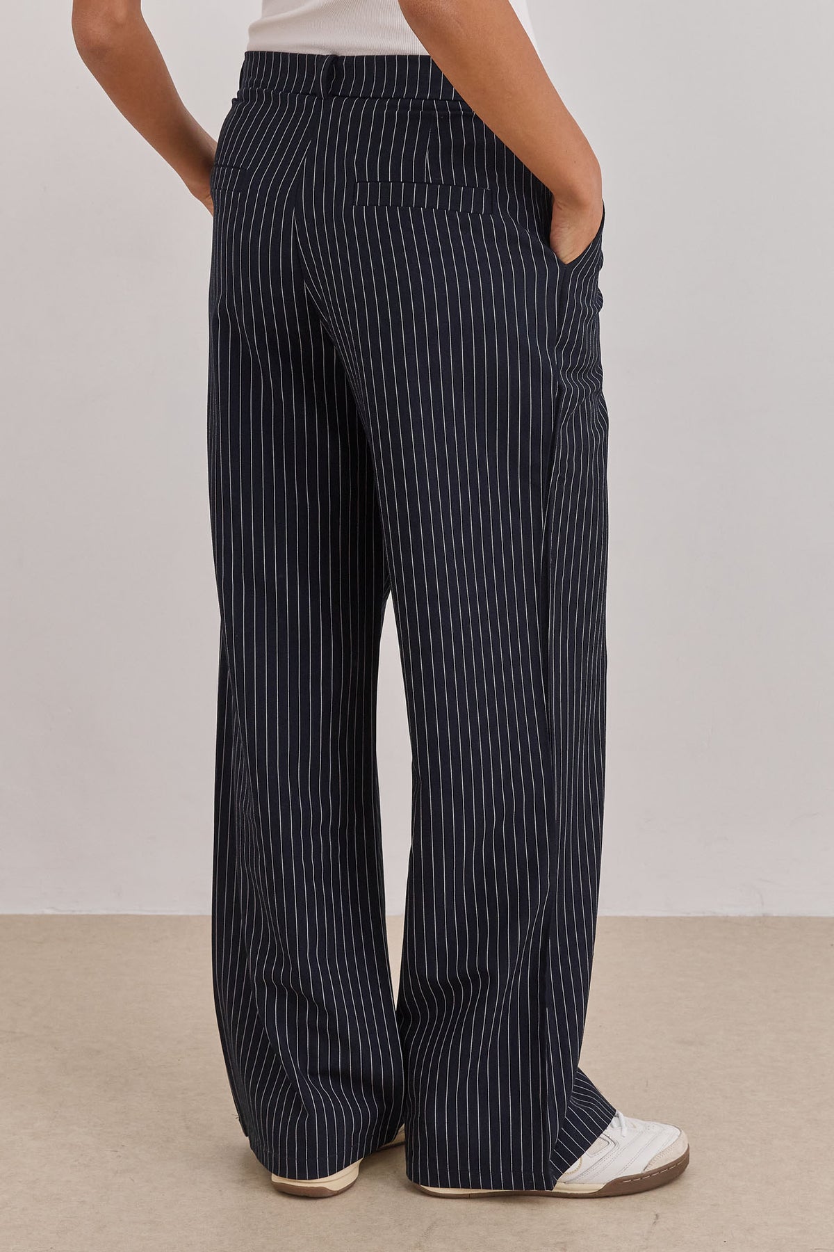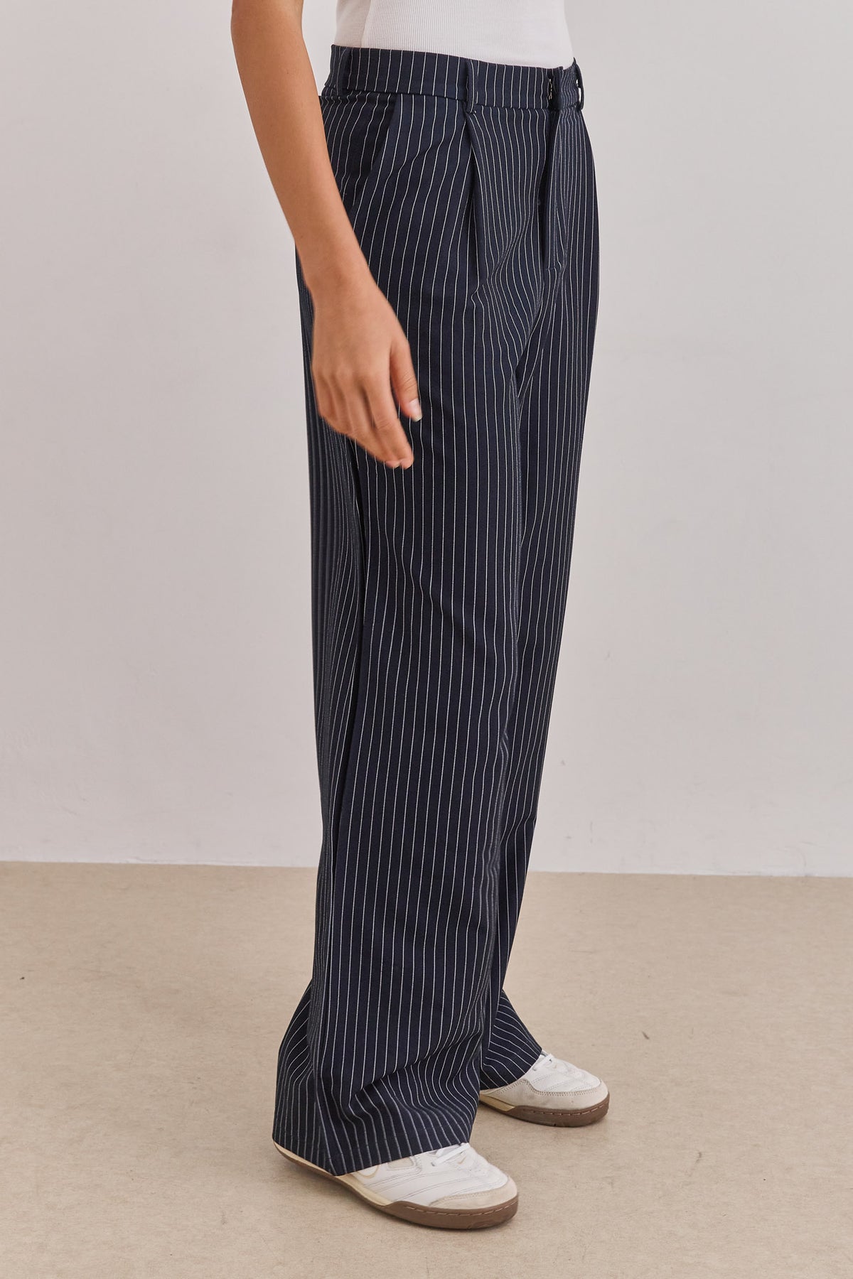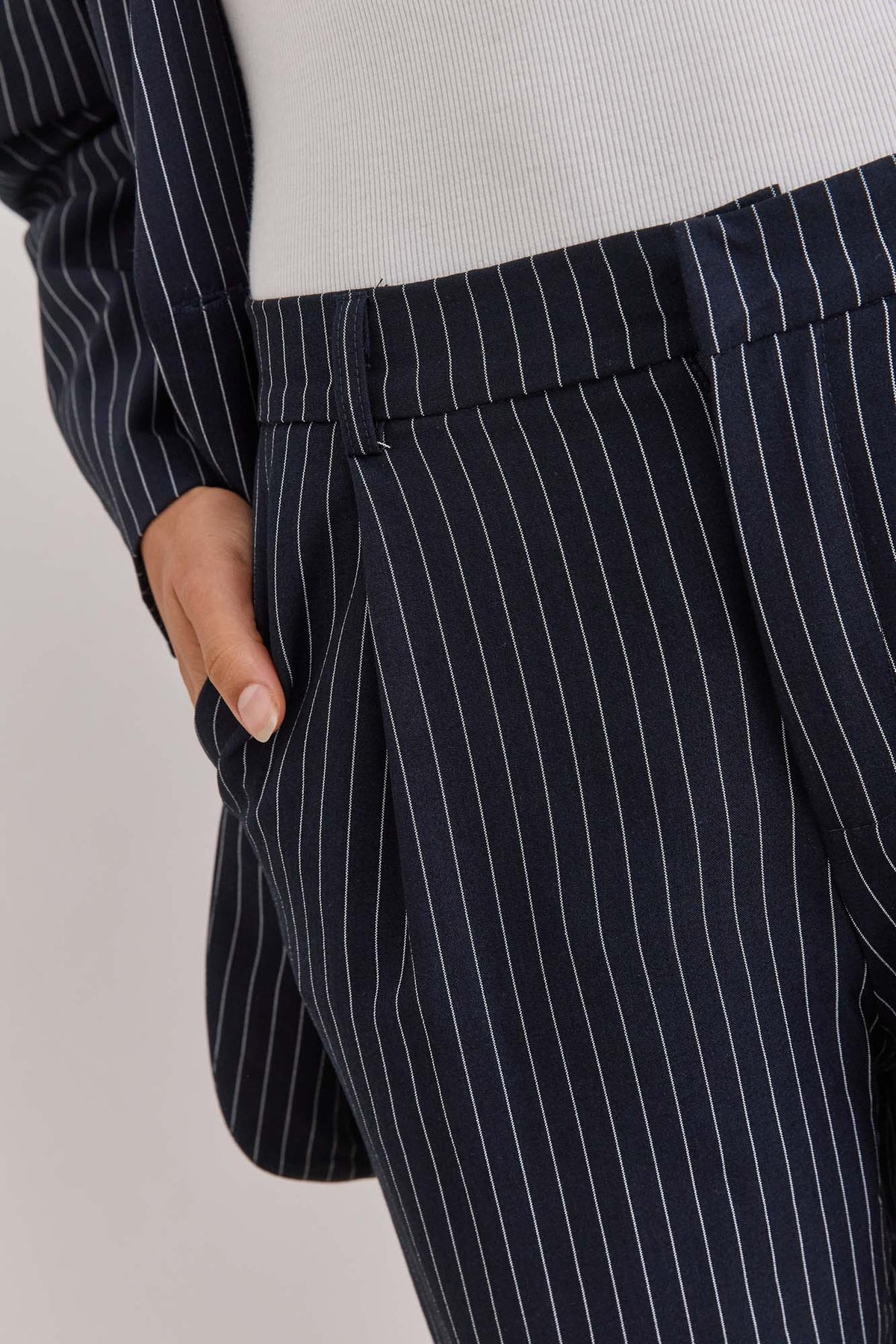 מכנסיים בדוגמת פסי סיכה דקים בגזרה מחויטת, בשילוב כיסים צדדיים ולולאות לחגורה