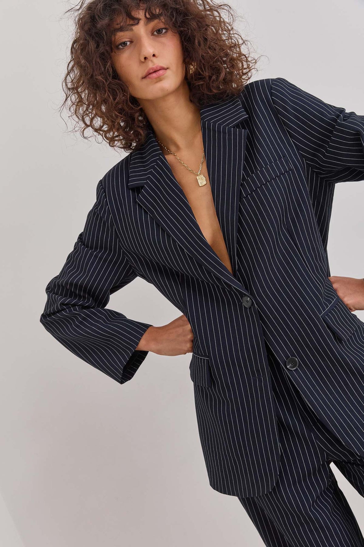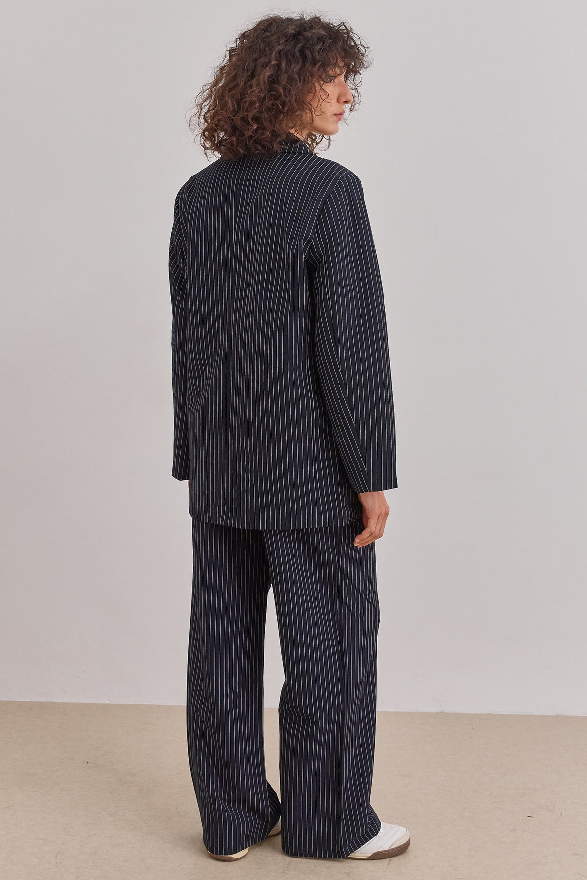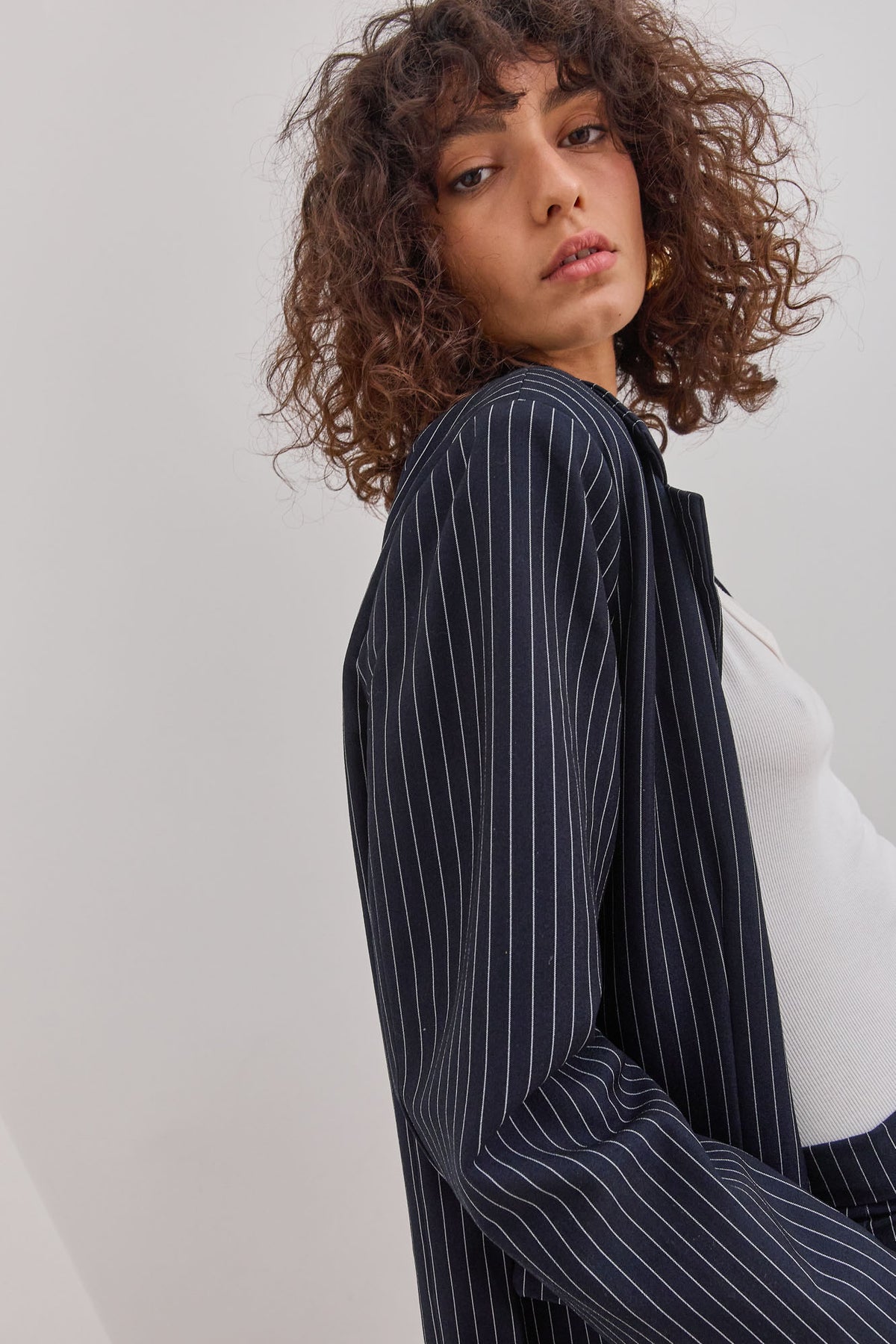 בלייזר בדוגמת פסי סיכה דקים בגזרה מחויטת בשילוב כיסים קדמיים וסגירת כפתור