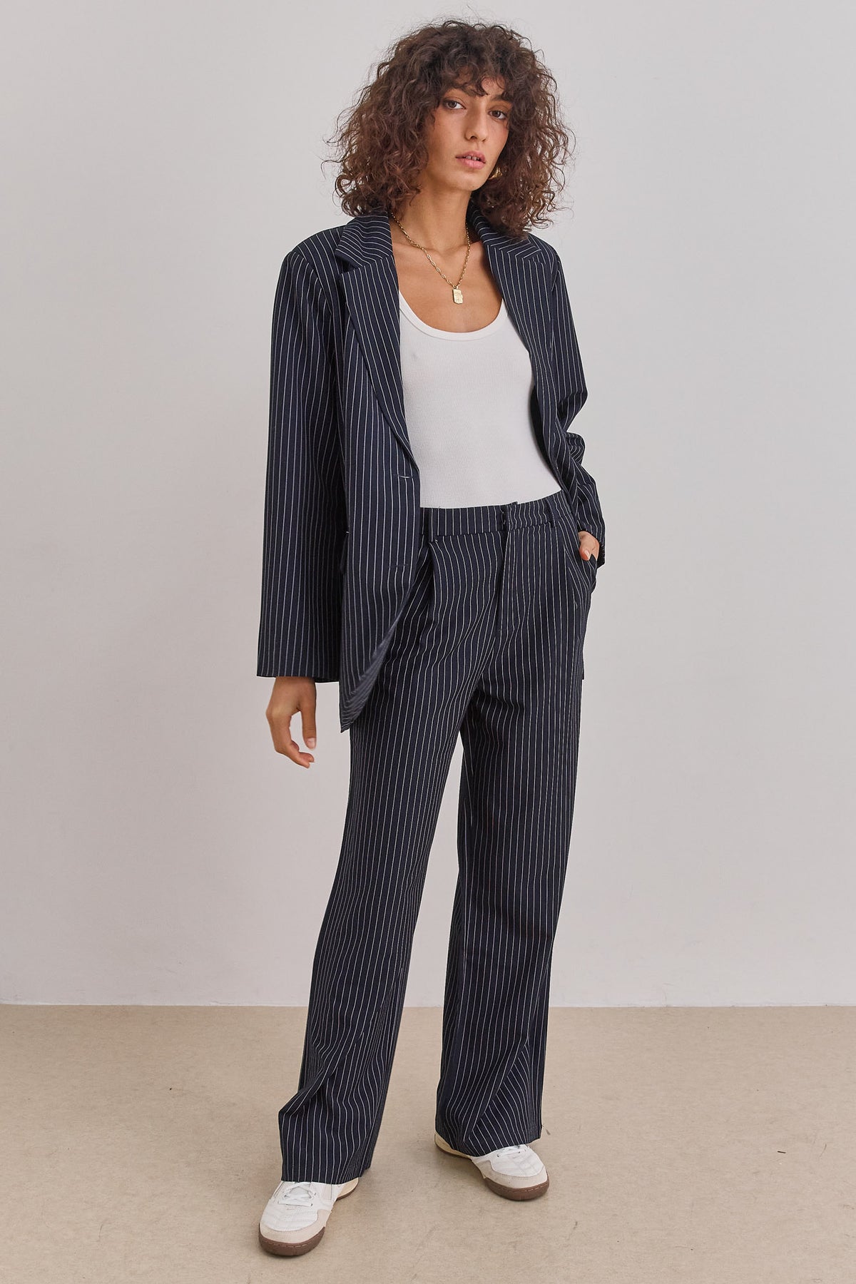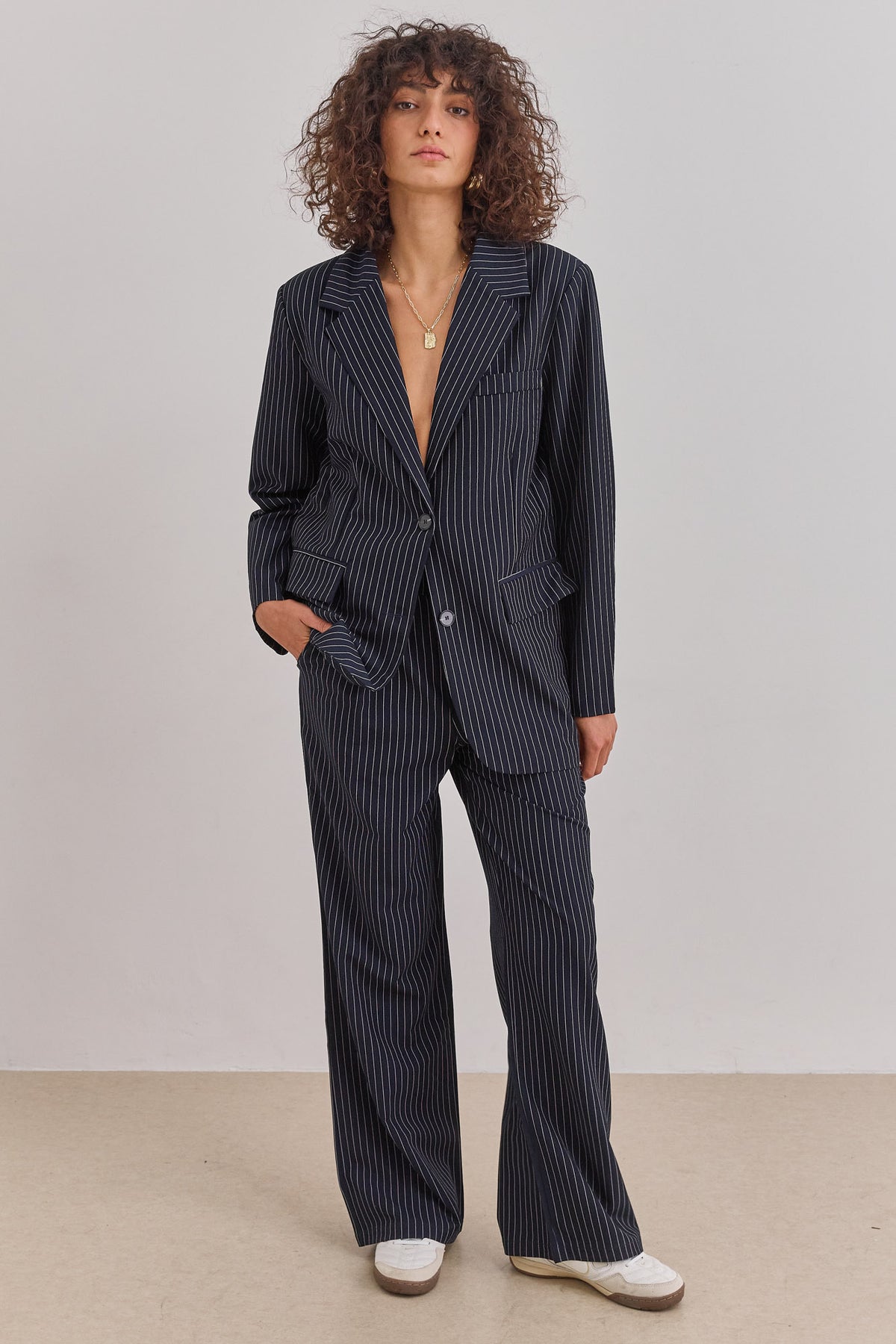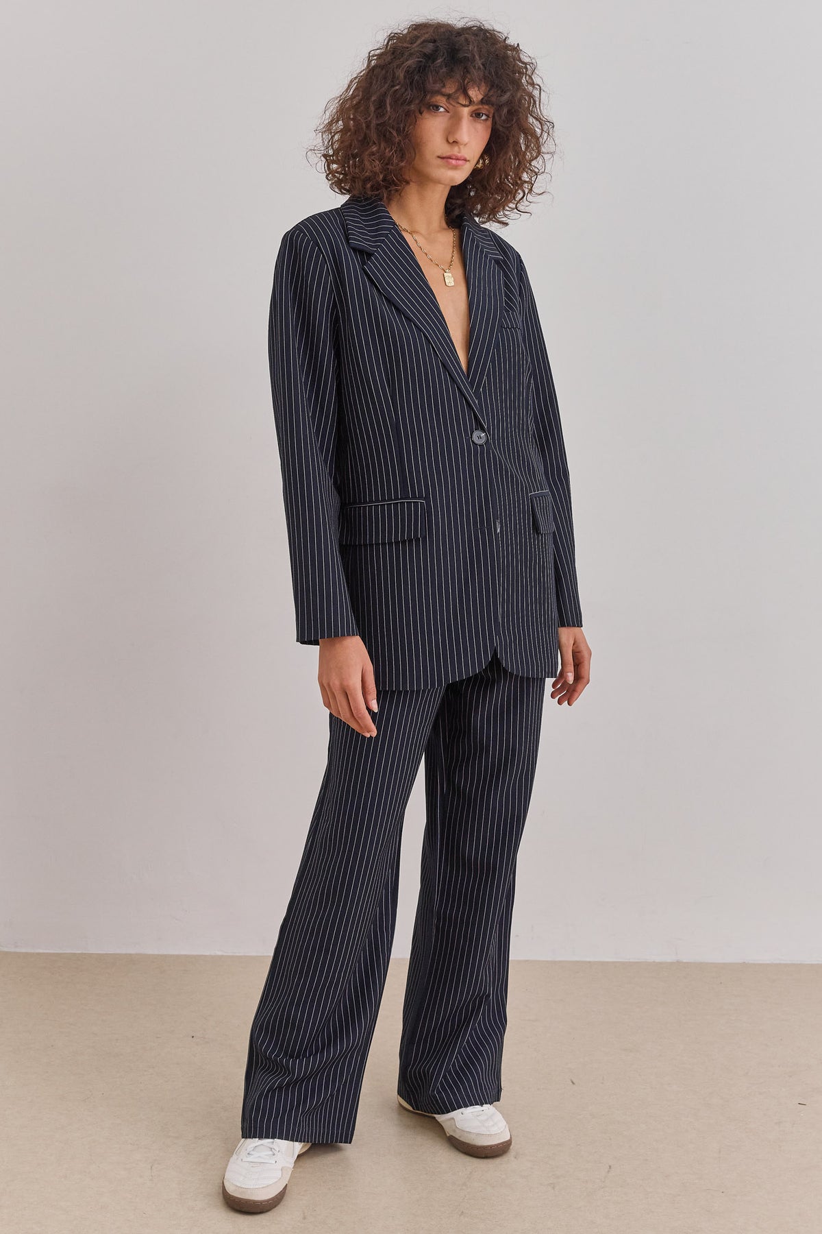 בלייזר בדוגמת פסי סיכה דקים בגזרה מחויטת בשילוב כיסים קדמיים וסגירת כפתור