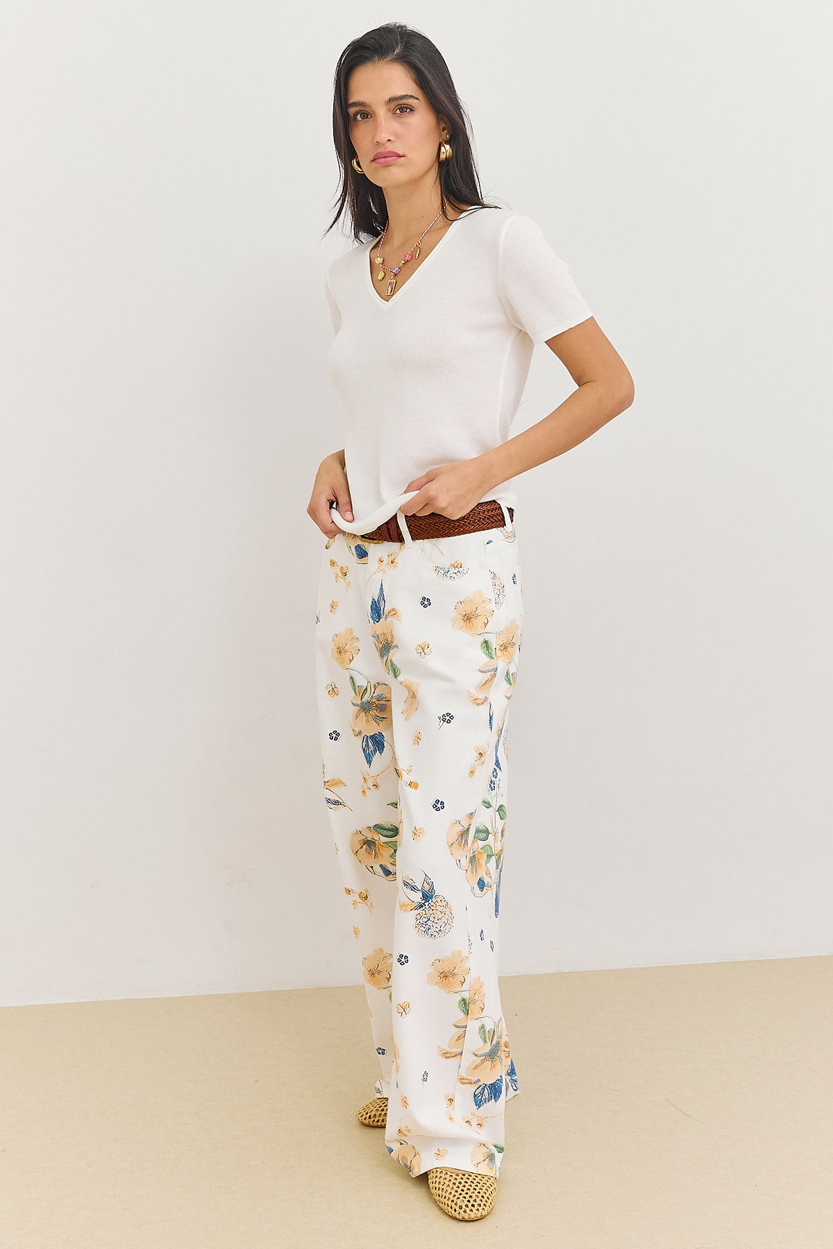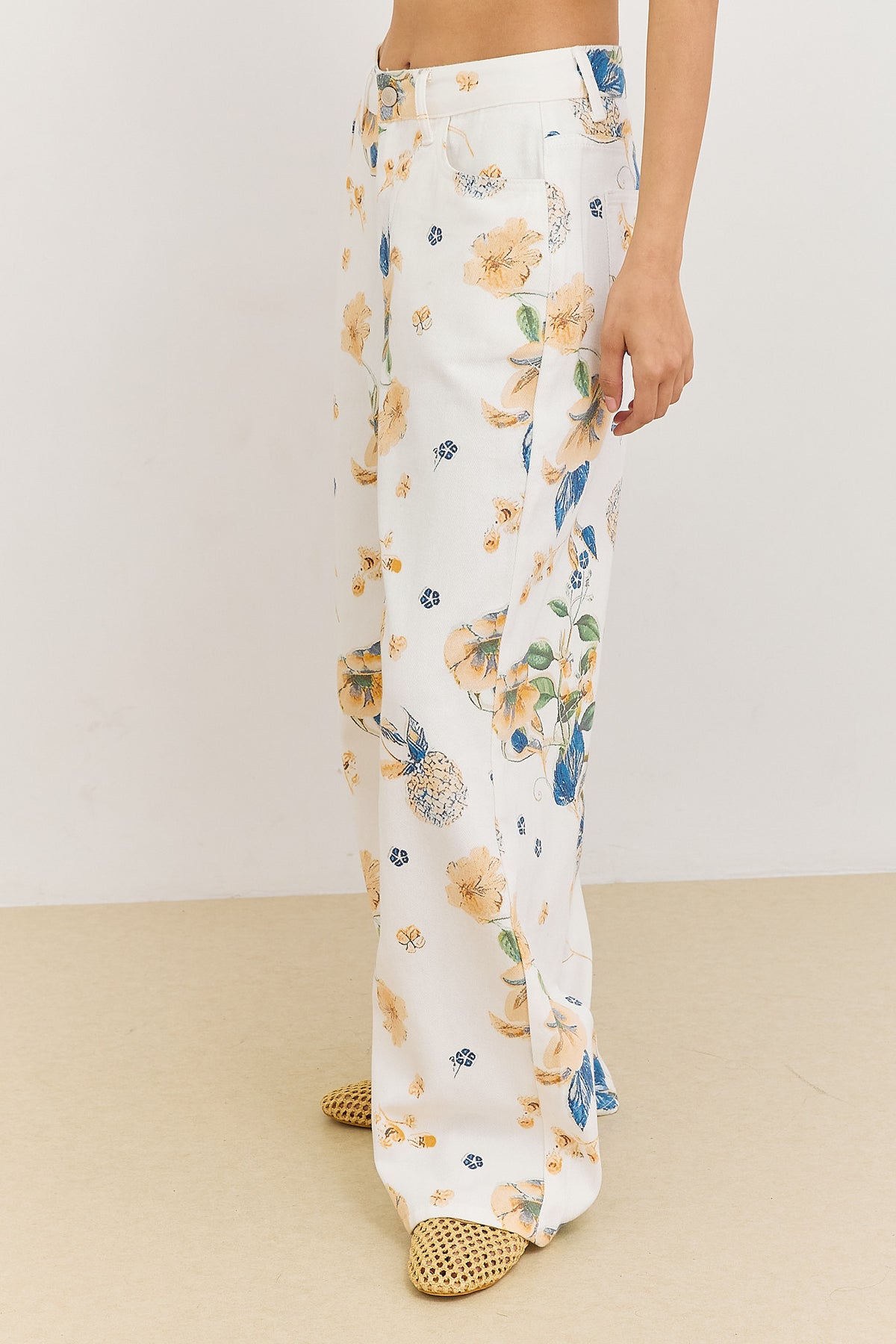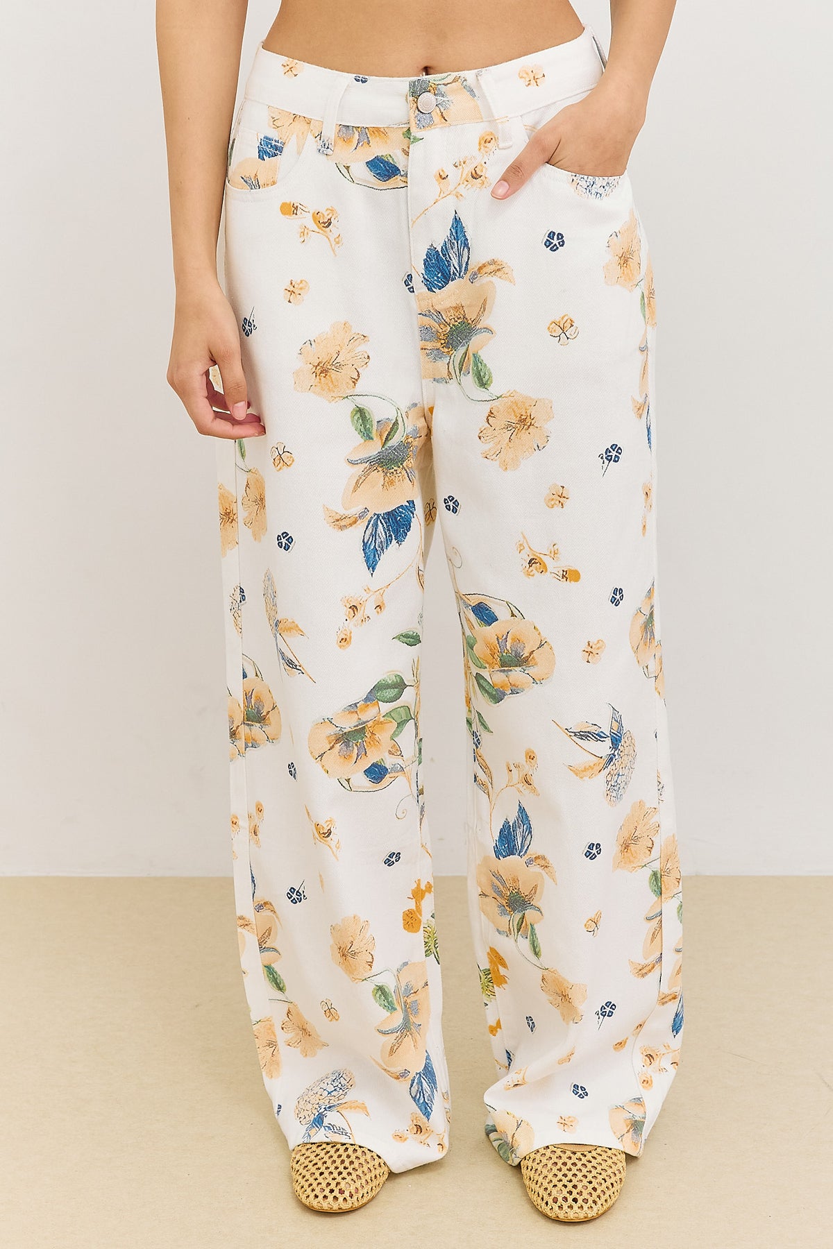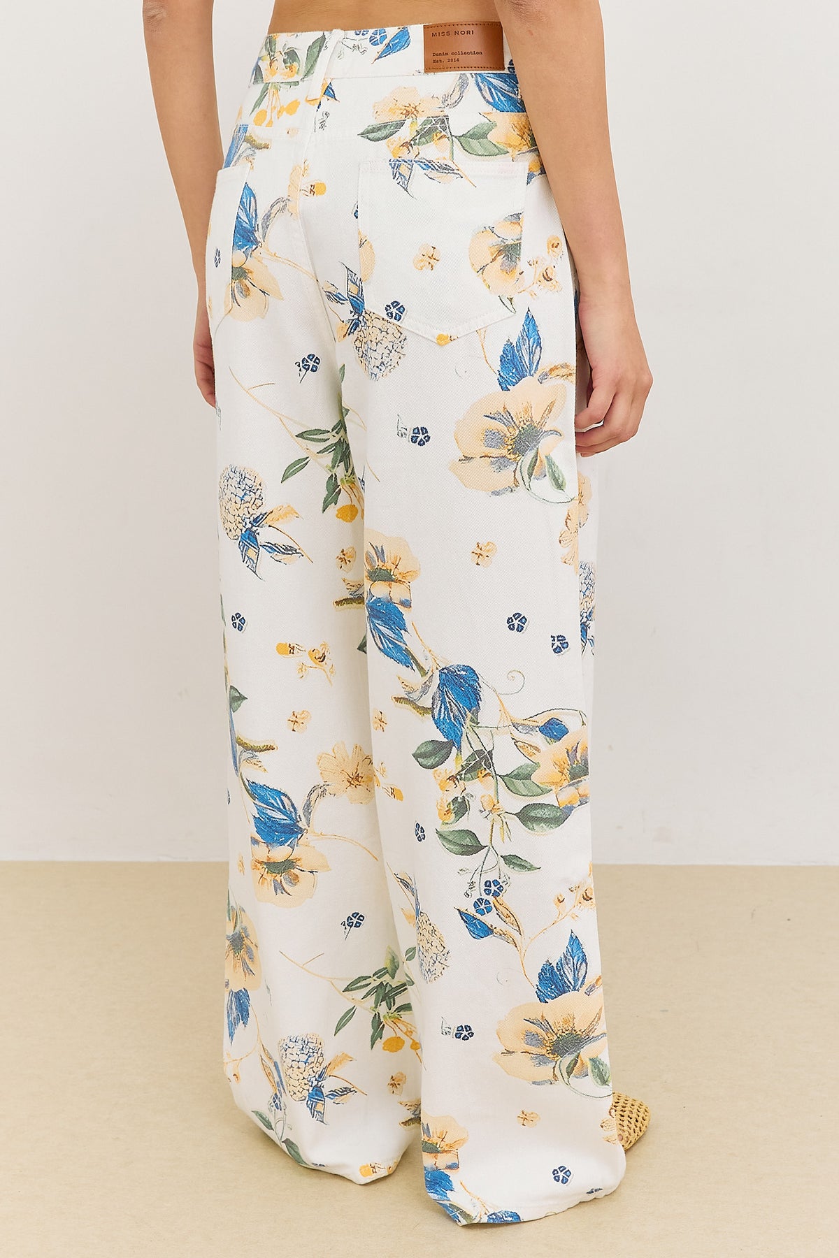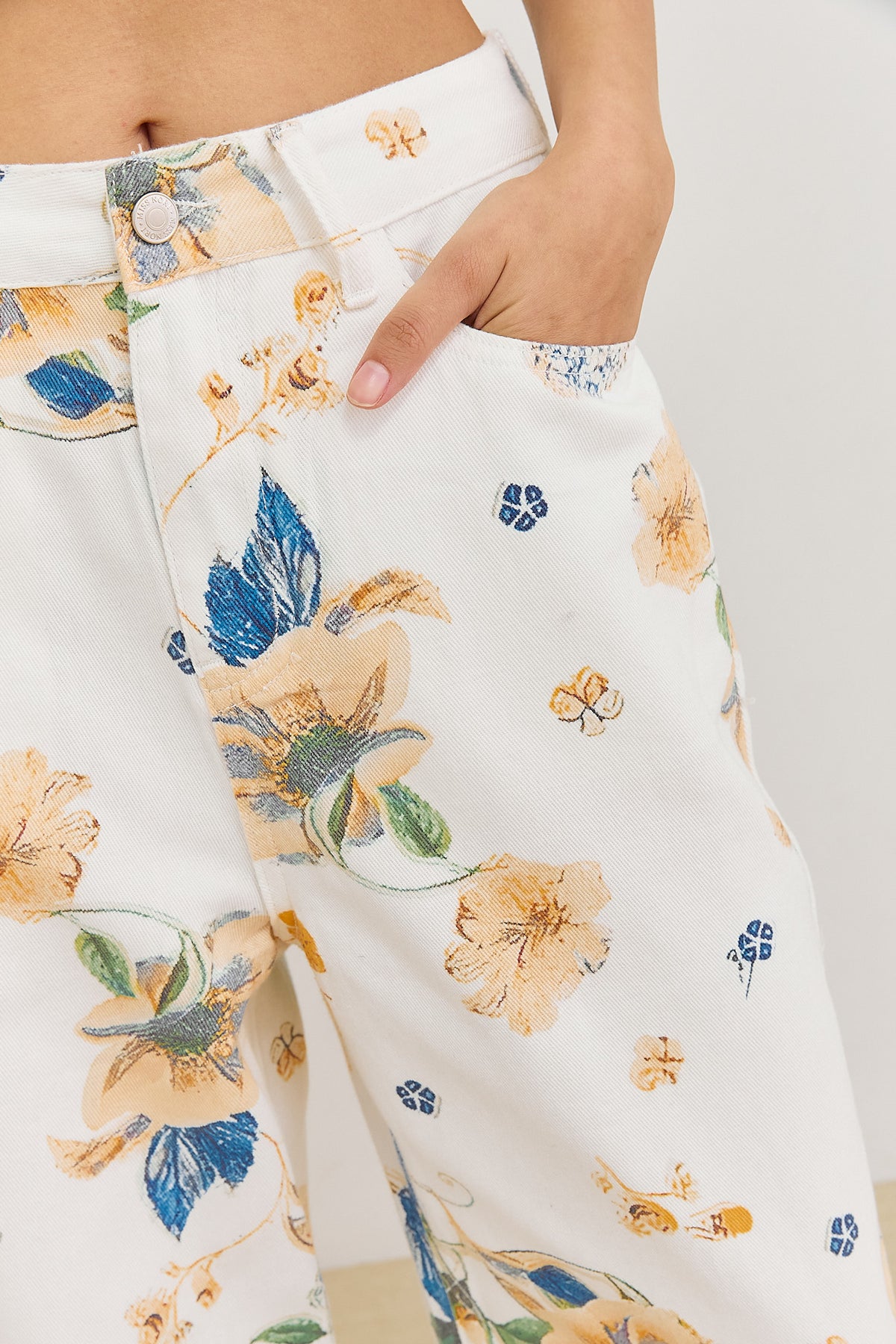 מכנסי דנים בגזרה רחבה בשילוב פרינט וכיסים