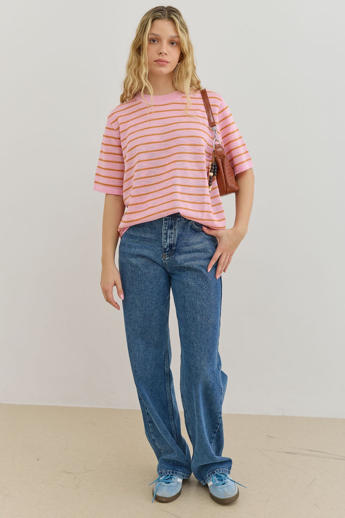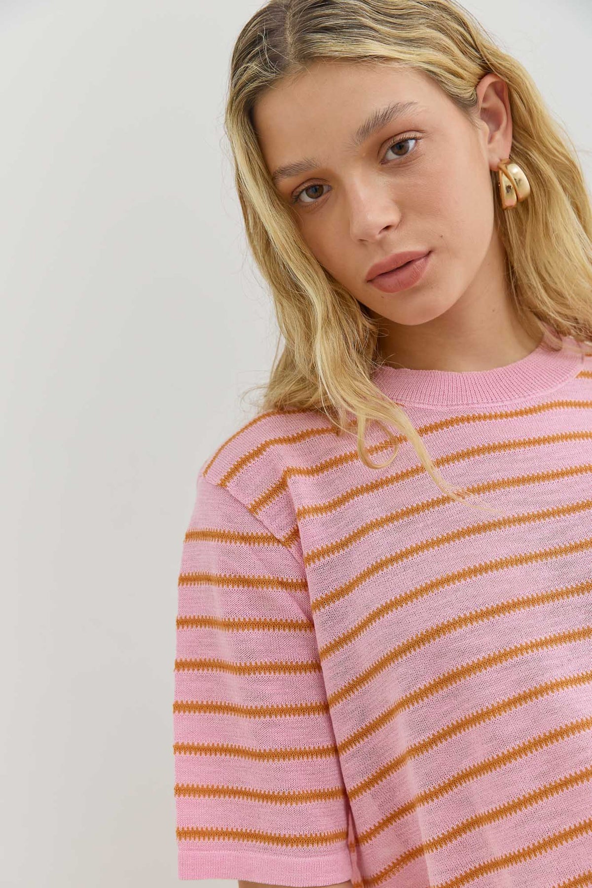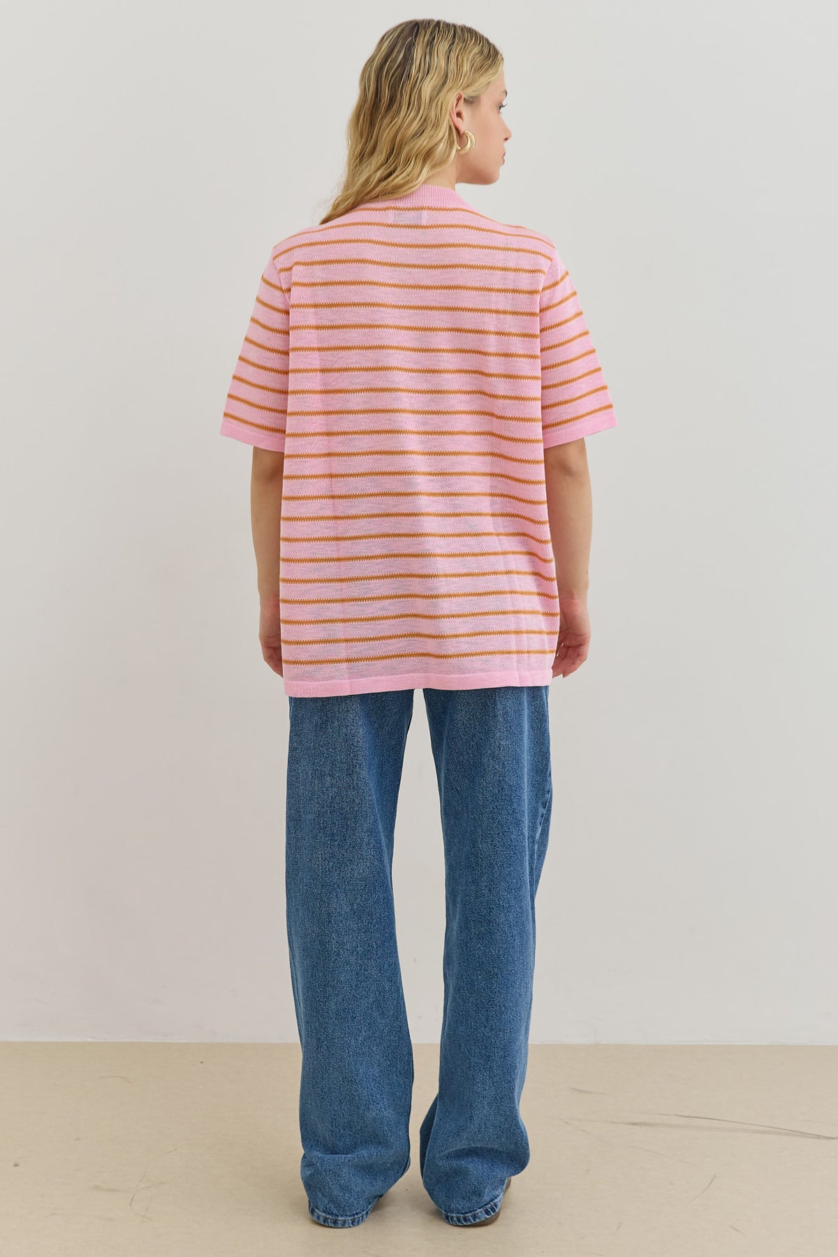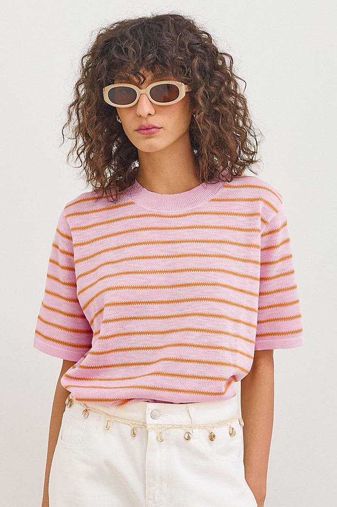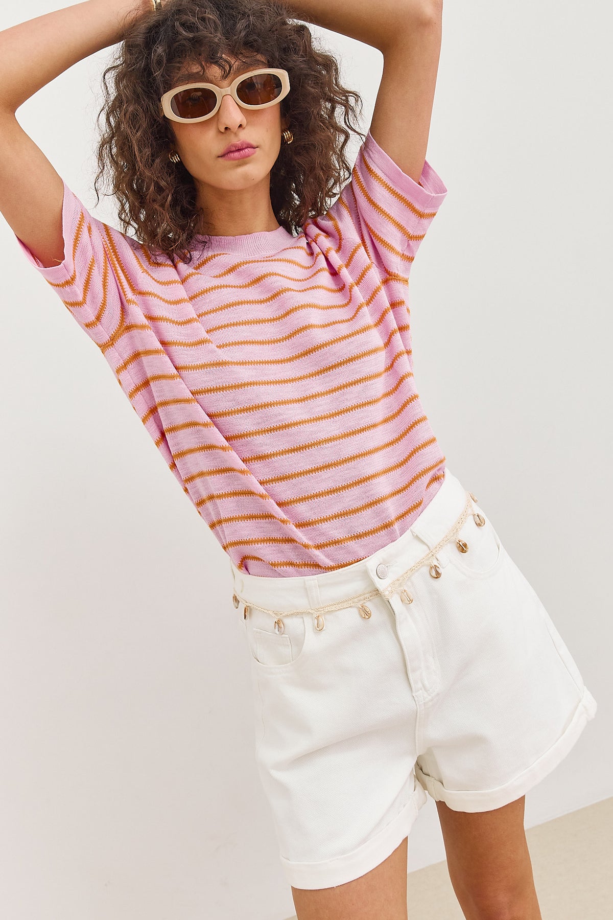 חולצה שקפקפה מבד סריג דק בדוגמת פסים ושרוולים קצרים