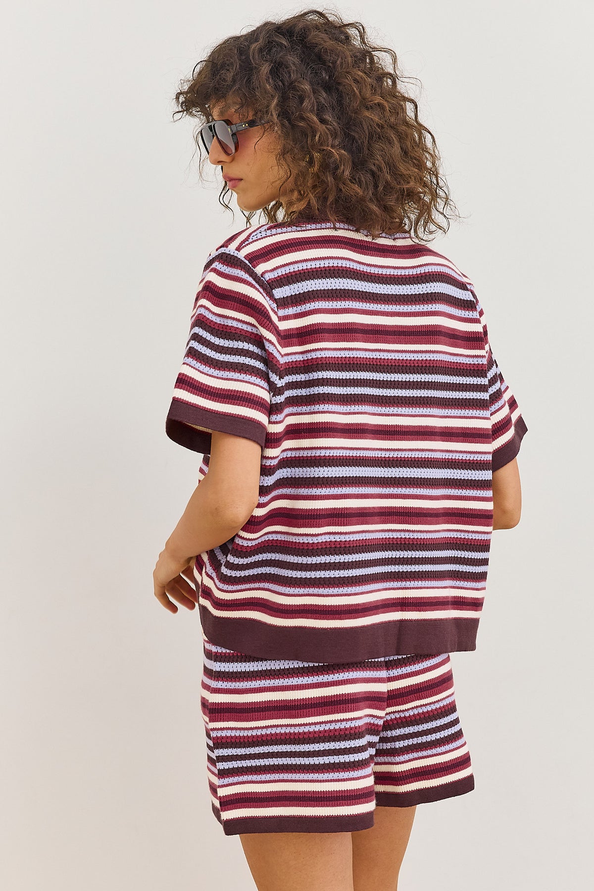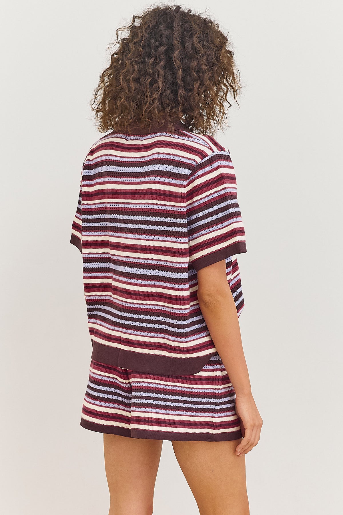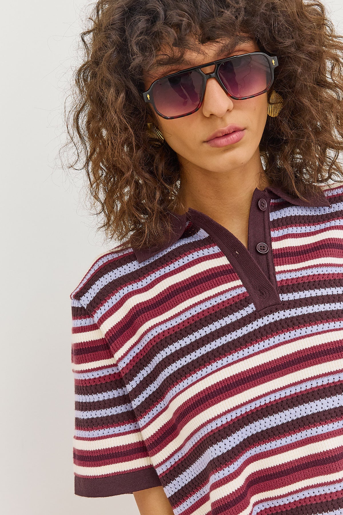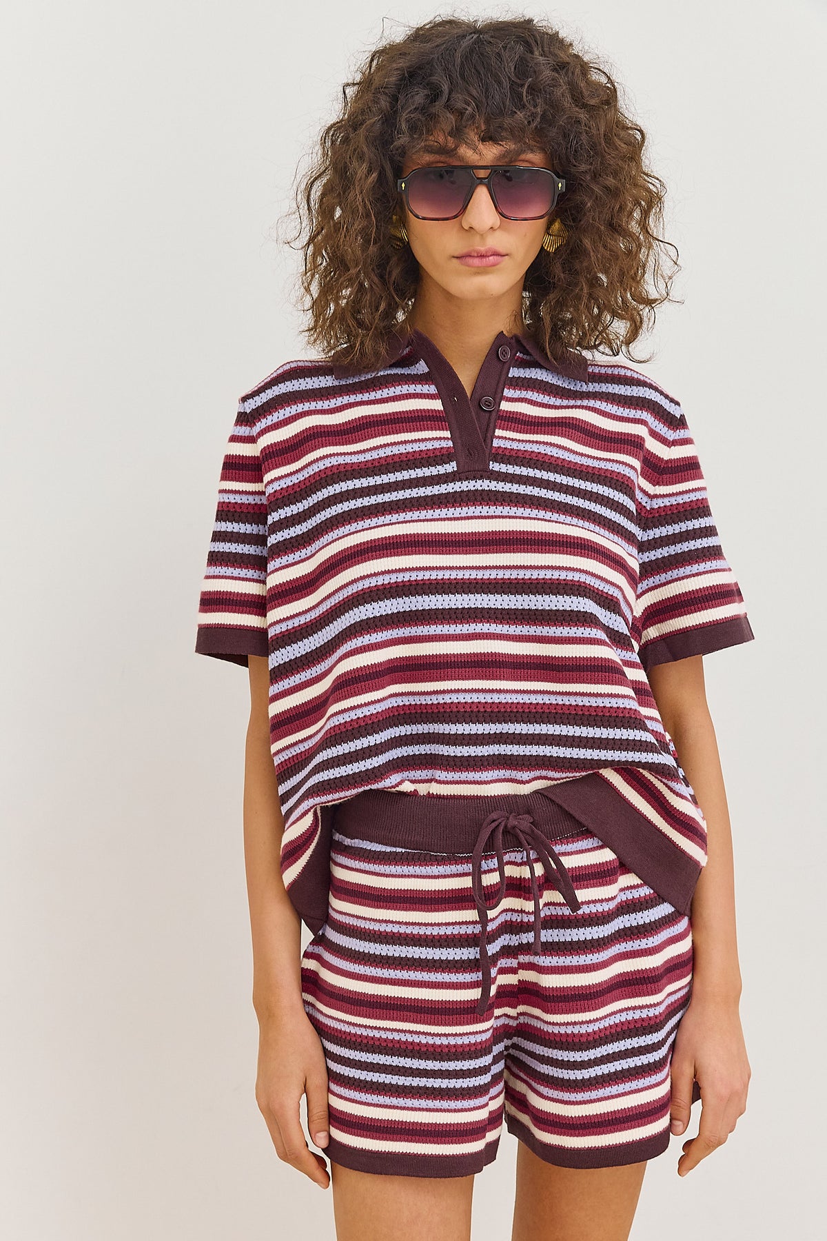 חולצת סריג בדוגמת פסים בשילוב צווארון פולו כפתורים