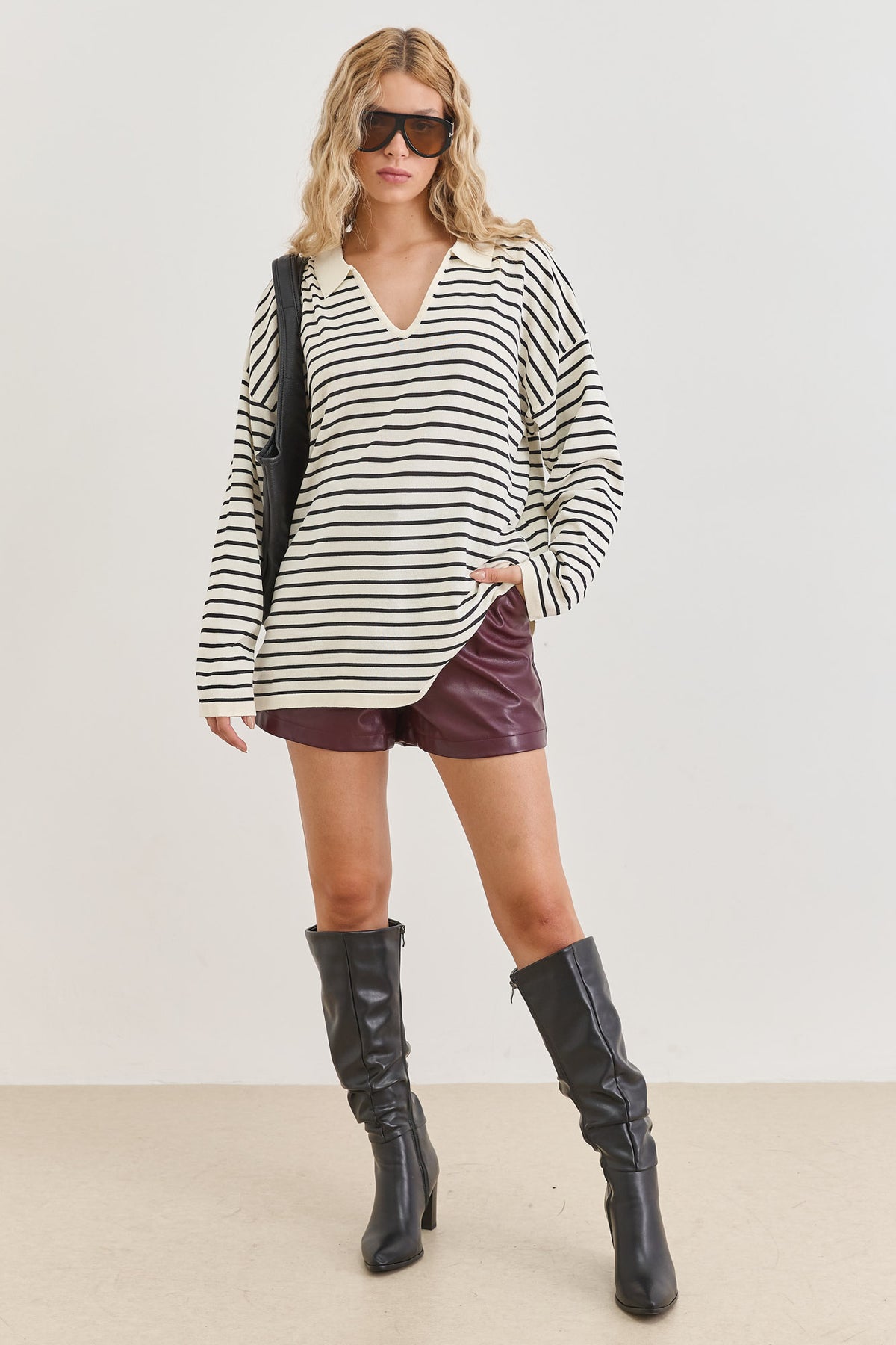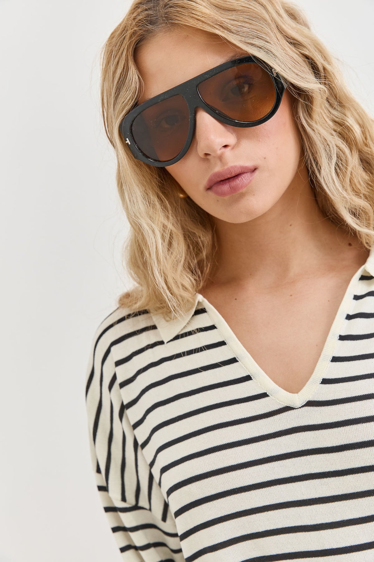 טוניקה מבד סריג דק בגזרה משוחררת ברקמת פסים בשילוב צווארון ומפתח וי