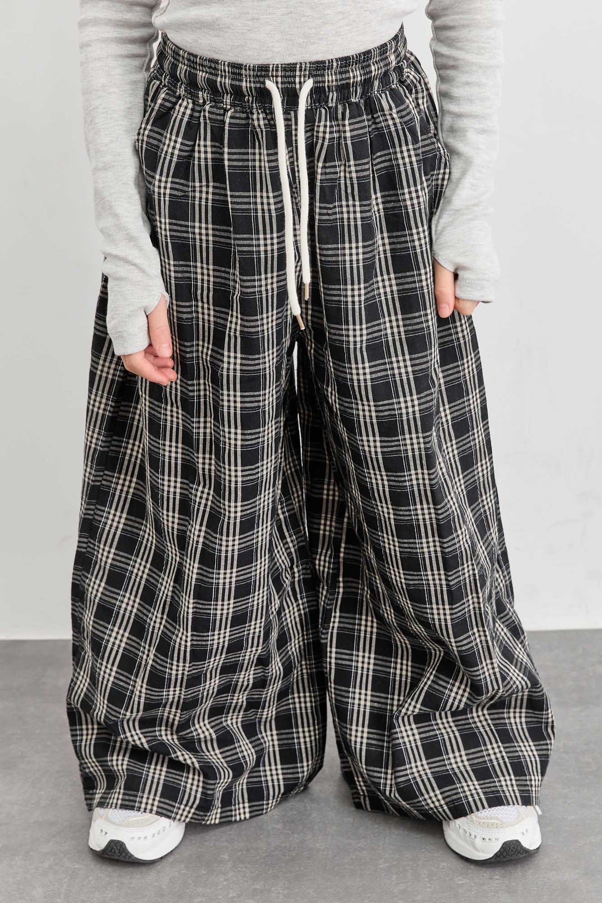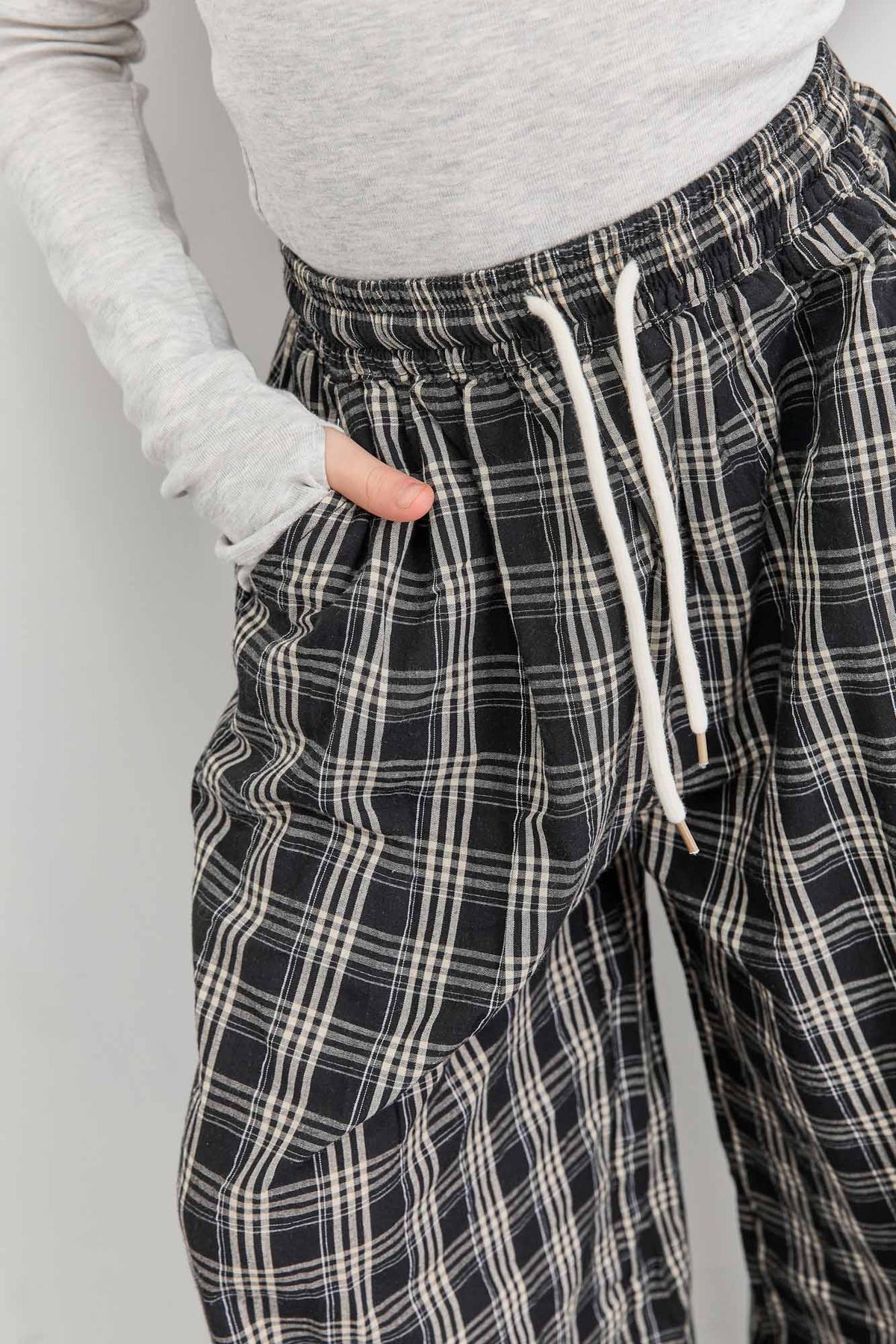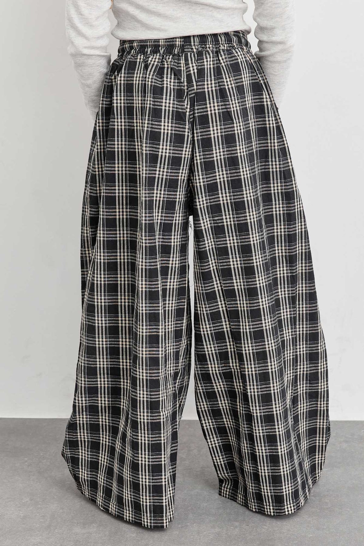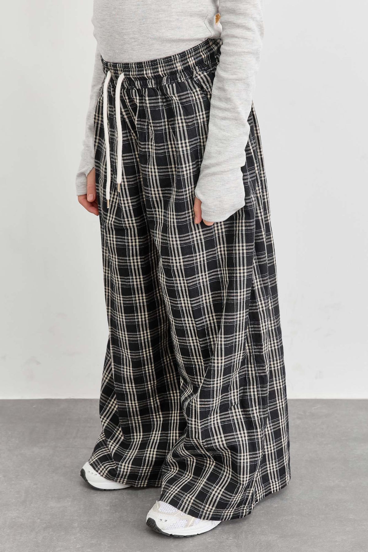 מכנסיים ארוכים בגזרה רחבה עם גומי במותן, שרוך ודוגמת משבצות