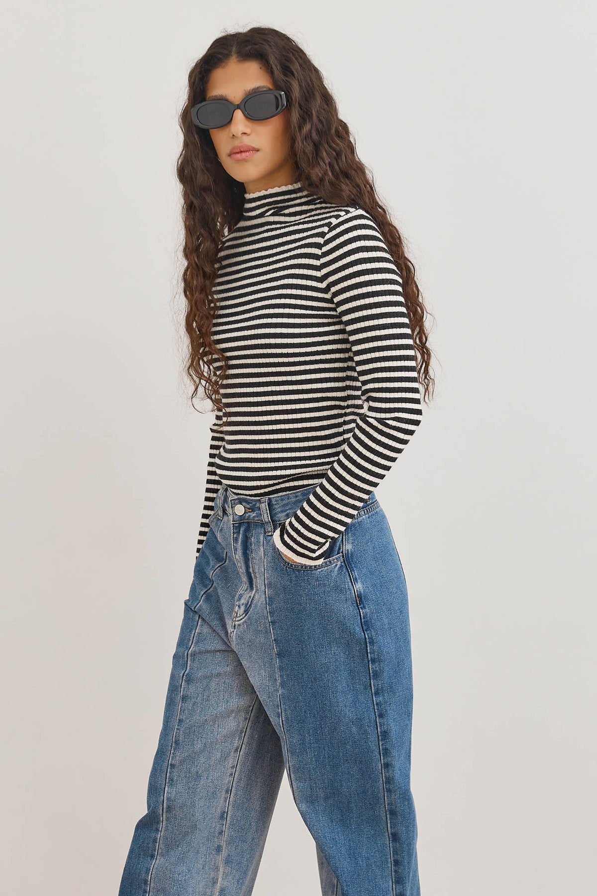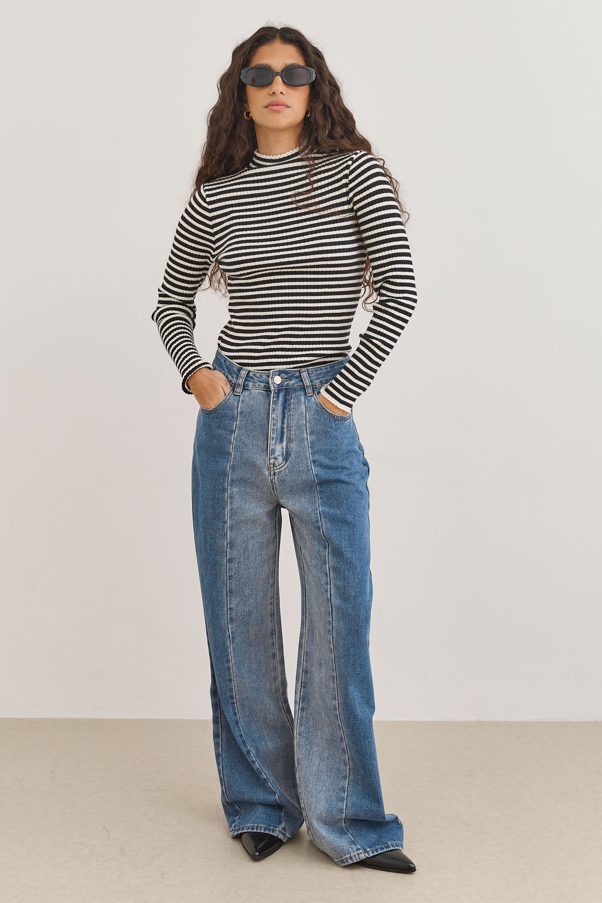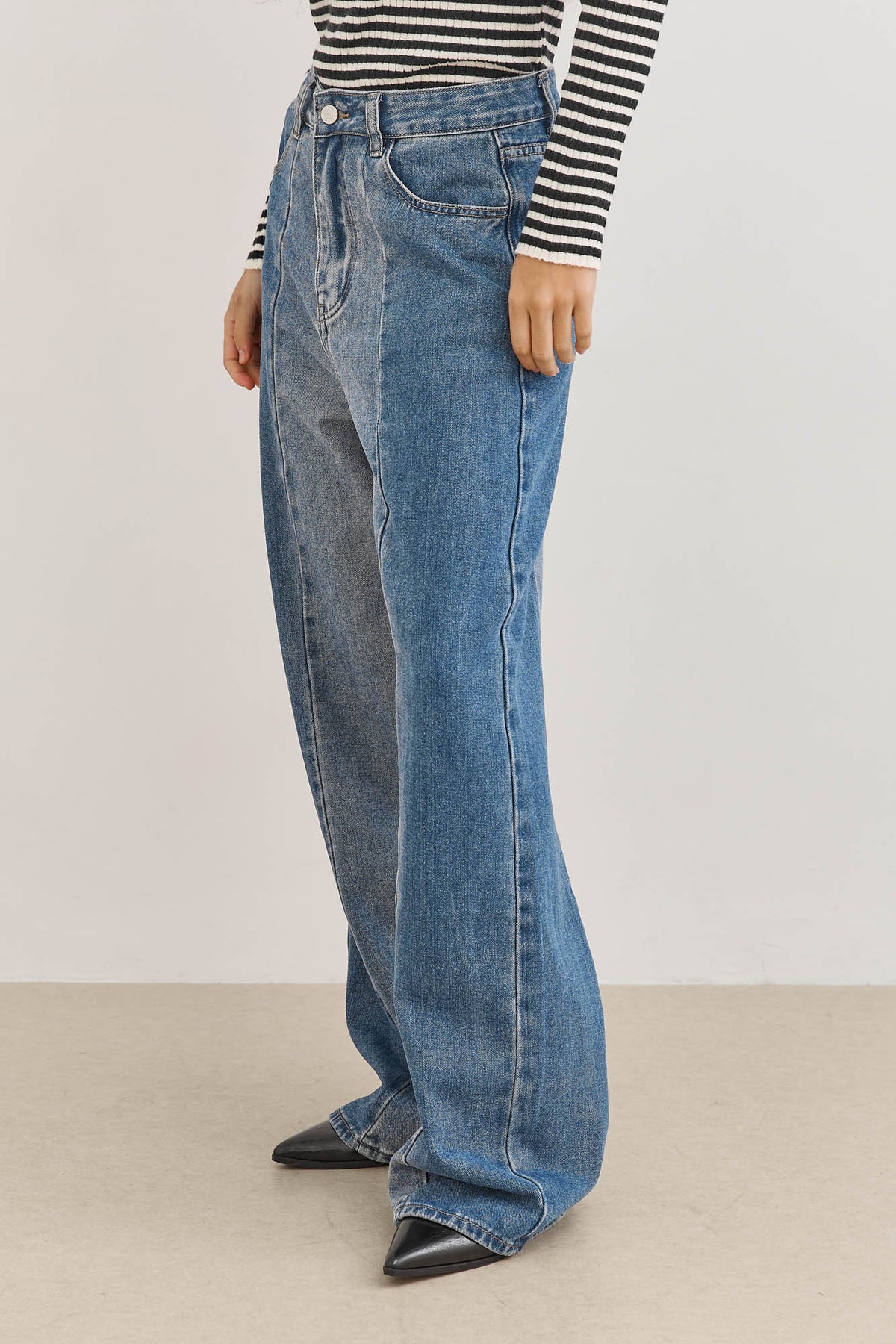 מכנסי ג'ינס ארוכים בגזרה מתרחבת בשילוב שני צבעים עם תפר קדמי מובלט