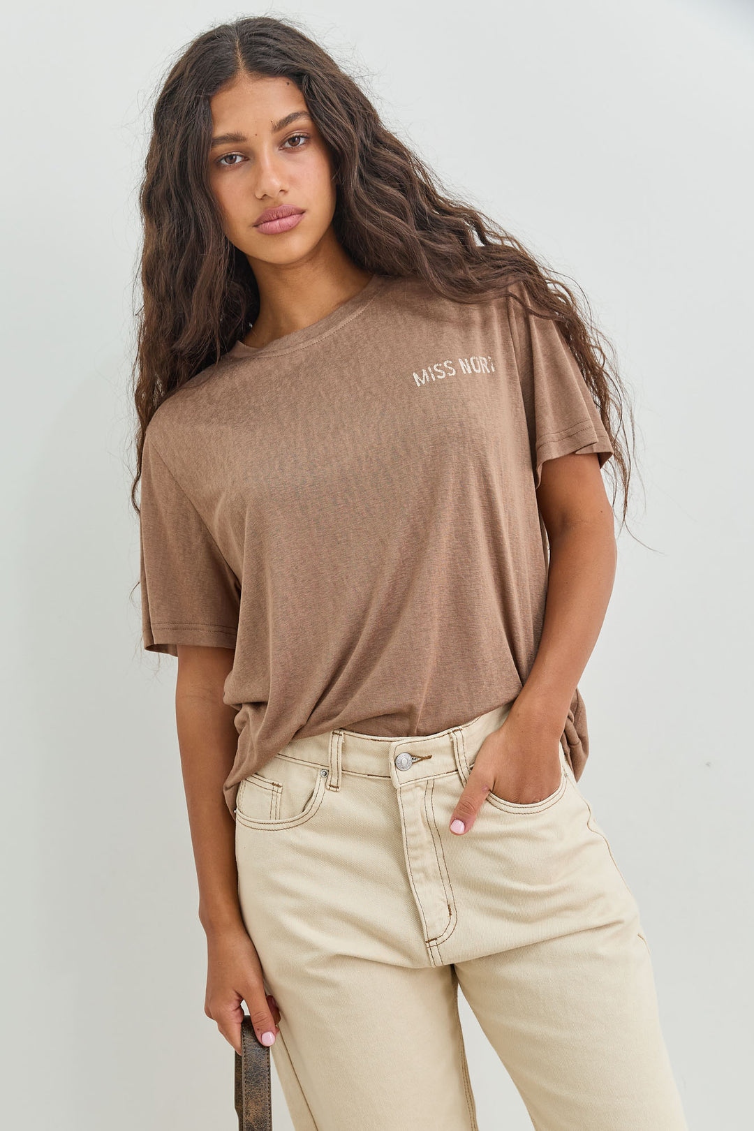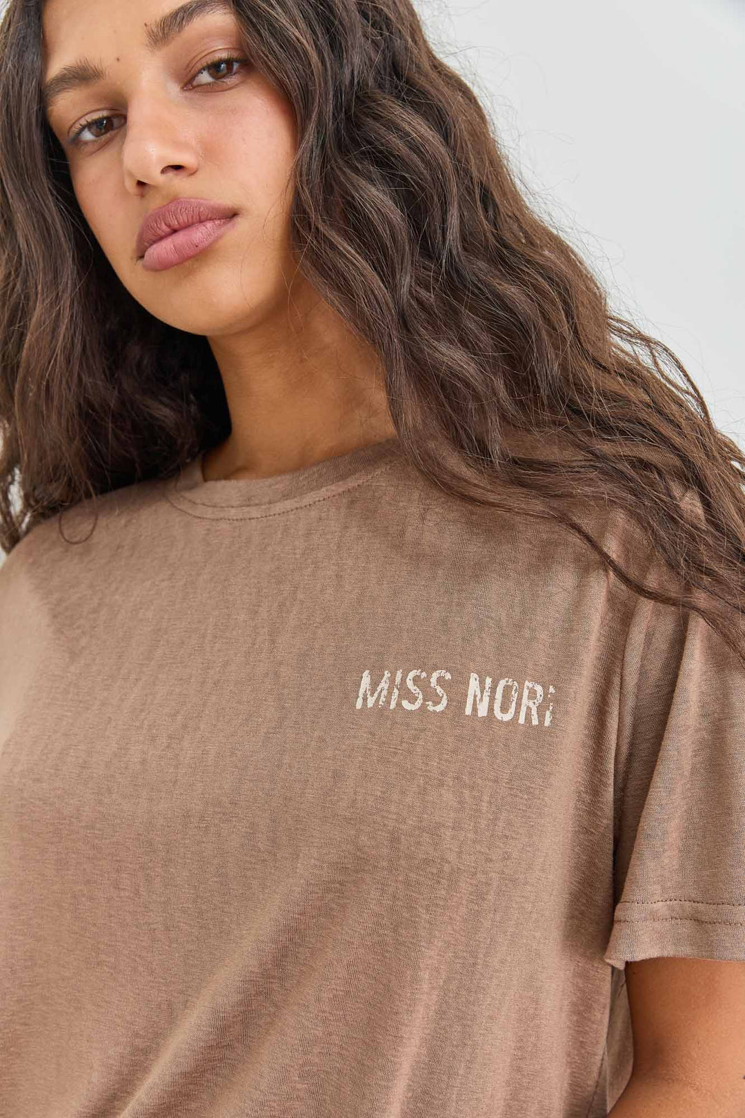 טי שירט טיירה מחשוף וי בסיומת פרומה | בז'