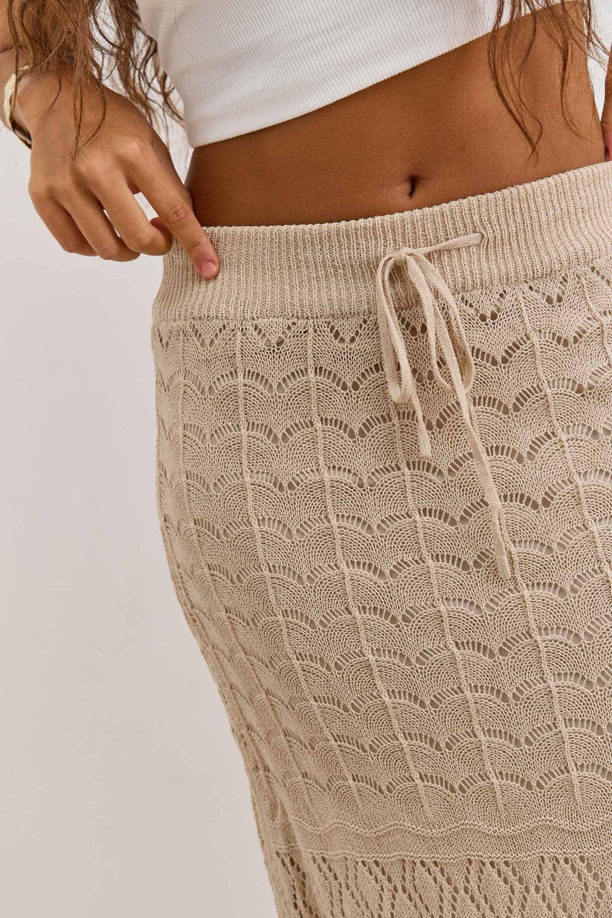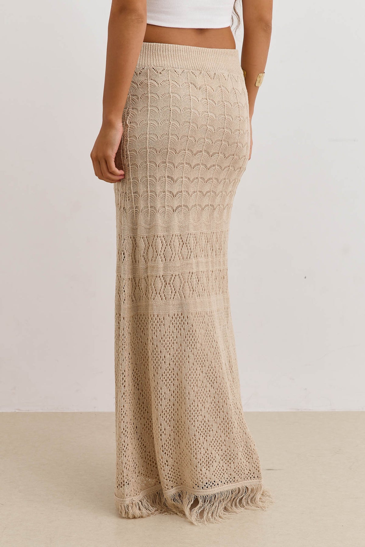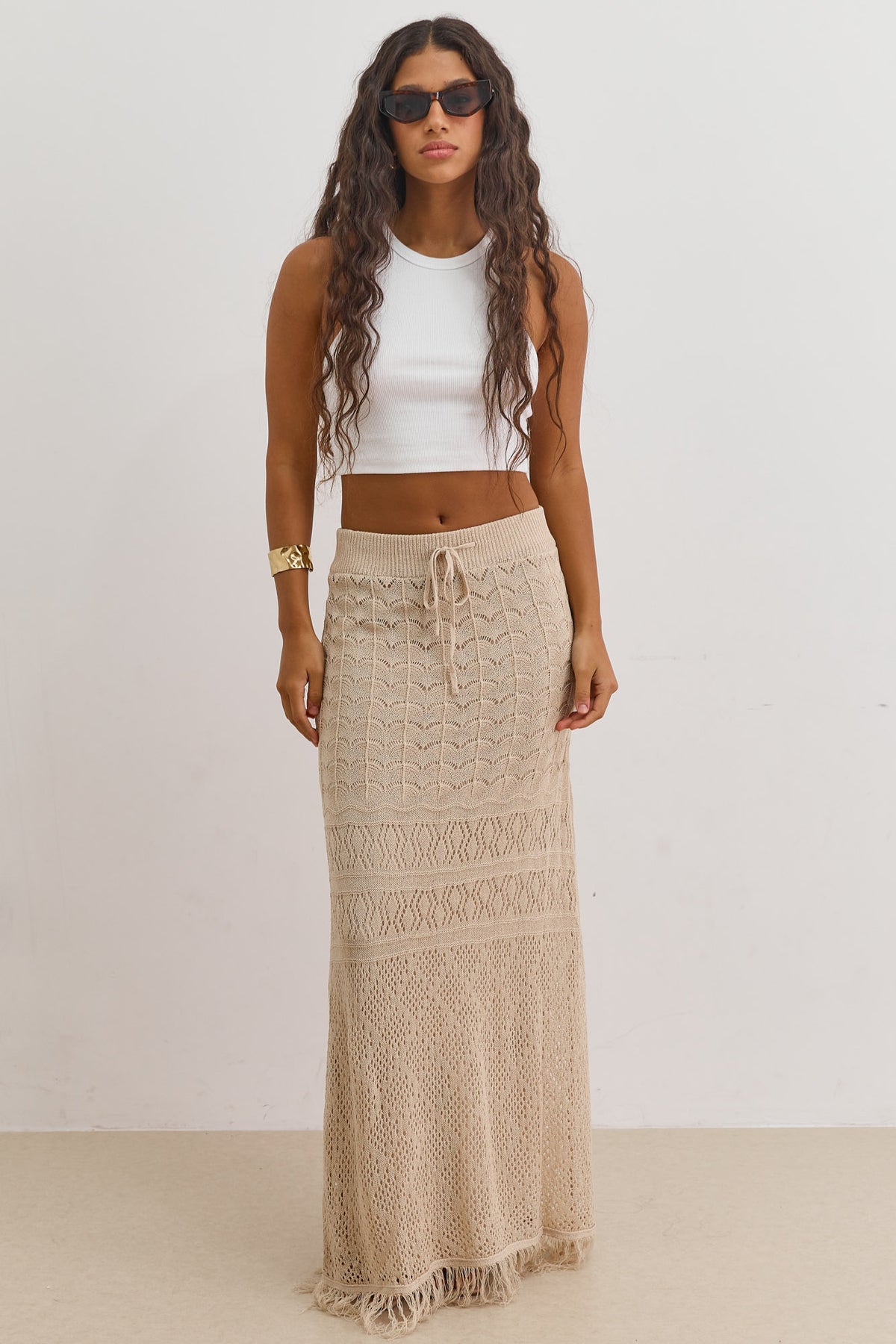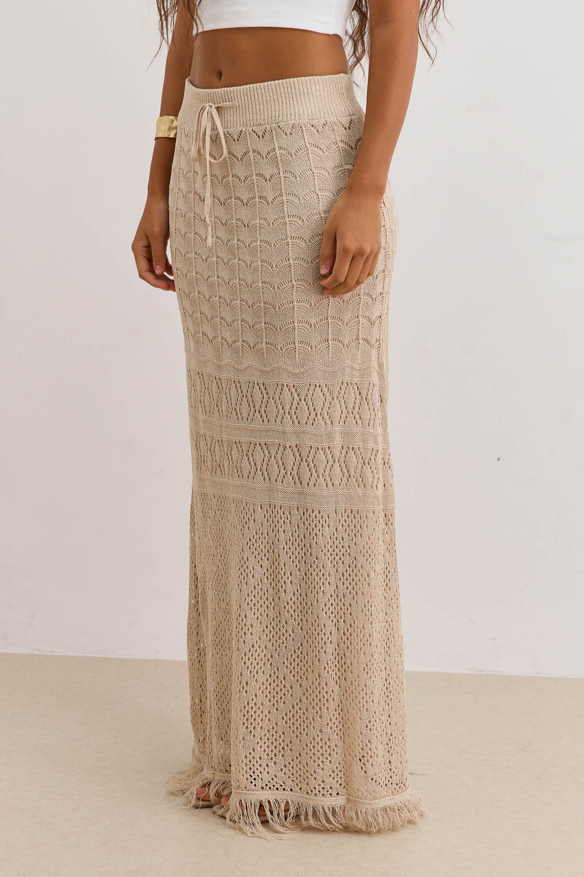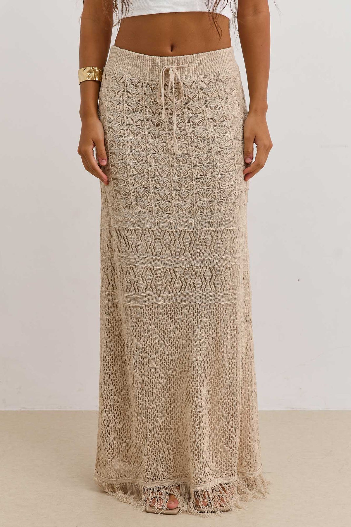 חצאית מקסי מבד קרושה עם טקסטורה בשילוב גומי במותן, שרוך וסיומת פרנזים