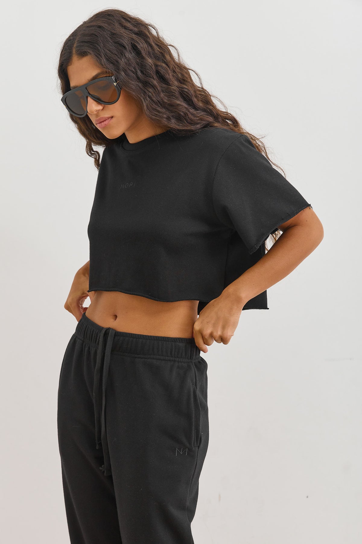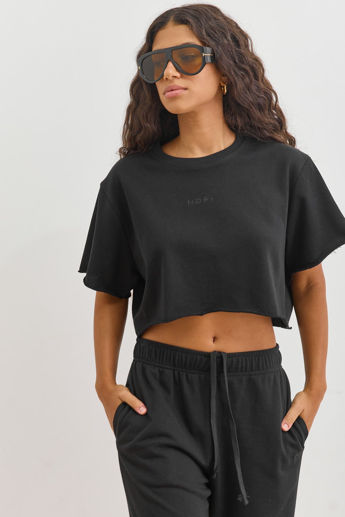 חולצה בגזרת קרופ מבד פרנץ' טרי עם רקמת לוגו וסיומת גזורה