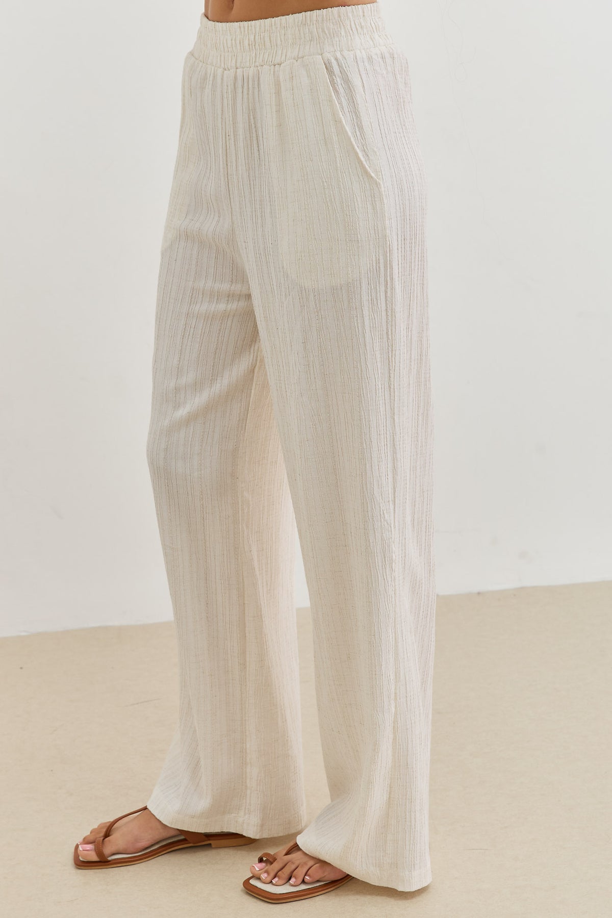 מכנסיים ארוכים מבד עם טקסטורת פסים בשילוב גומי במותן וכיסים